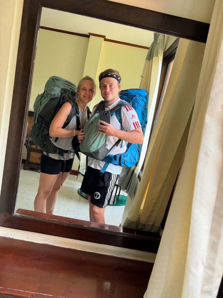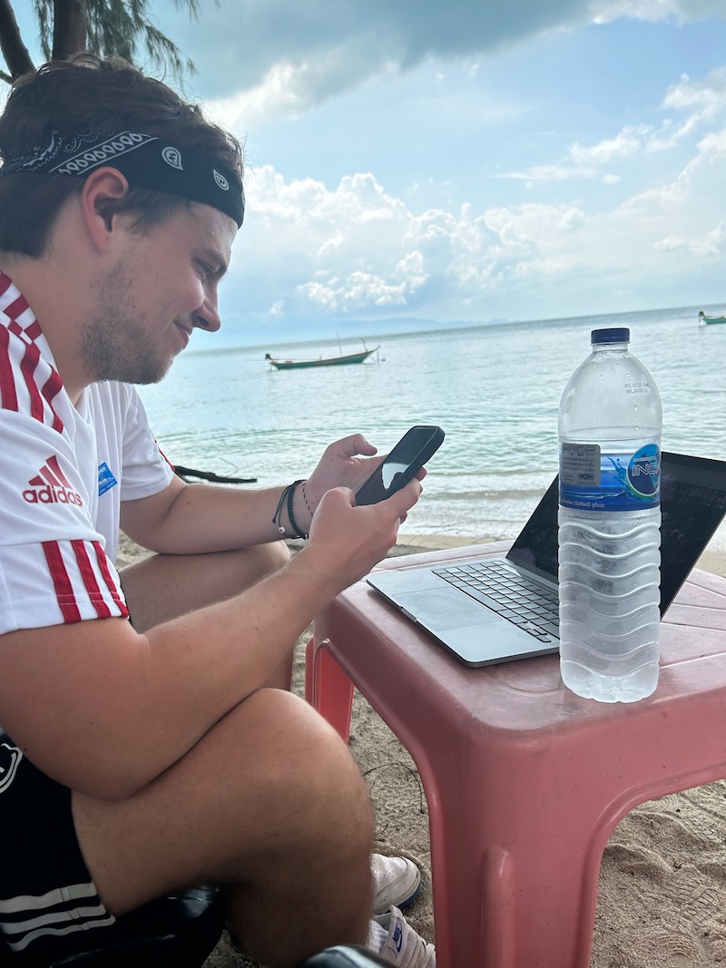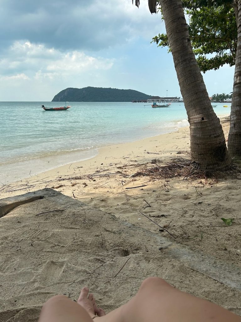 Auf Koh Phangan angekommen gingen wir 10 Minuten zu Fuß zu unserer Unterkunft, welche wir wieder extra in der Nähe des Piers gebucht hatten. Da ein Check-In erst ab 14 Uhr möglich und unser Zimmer noch nicht fertig war, legten wir unsere Rucksäcke zu den anderen und setzten uns an den Privatstrand (mit Wlan) der Hotelanlage. Gegen 14 Uhr konnten wir dann auf unser Zimmer, ein einzelnes Häuschen mit Matratze, einem Bad, einer Hängematte auf der Terrasse und ohne Klimanalge, nur einem Ventilator.