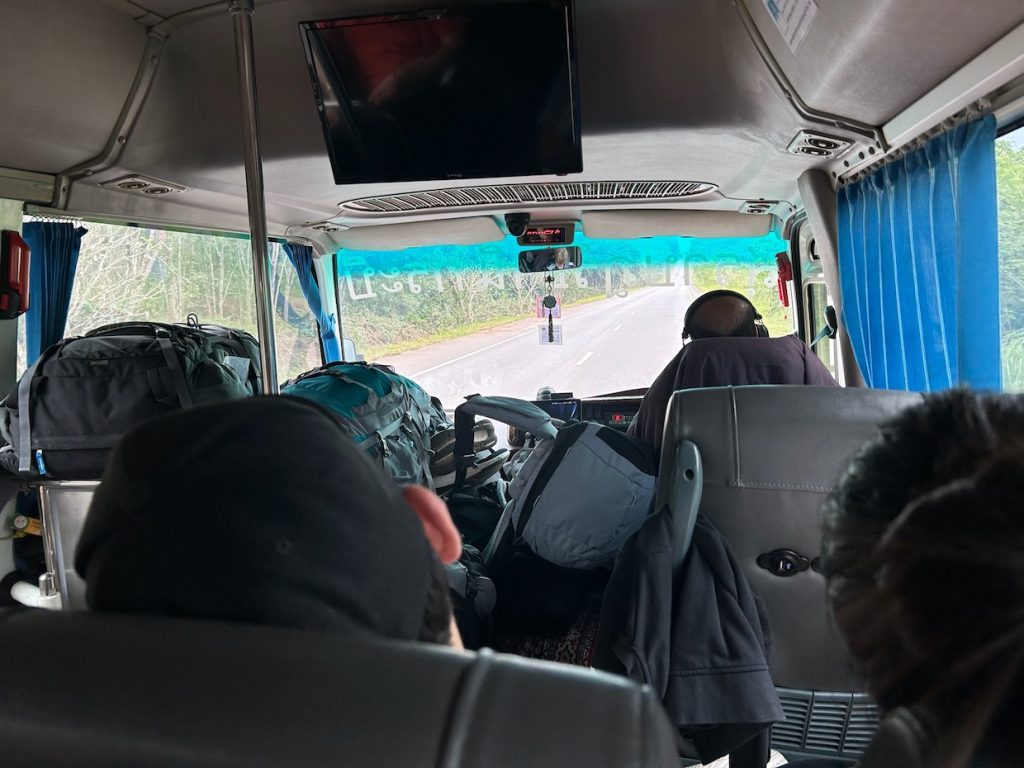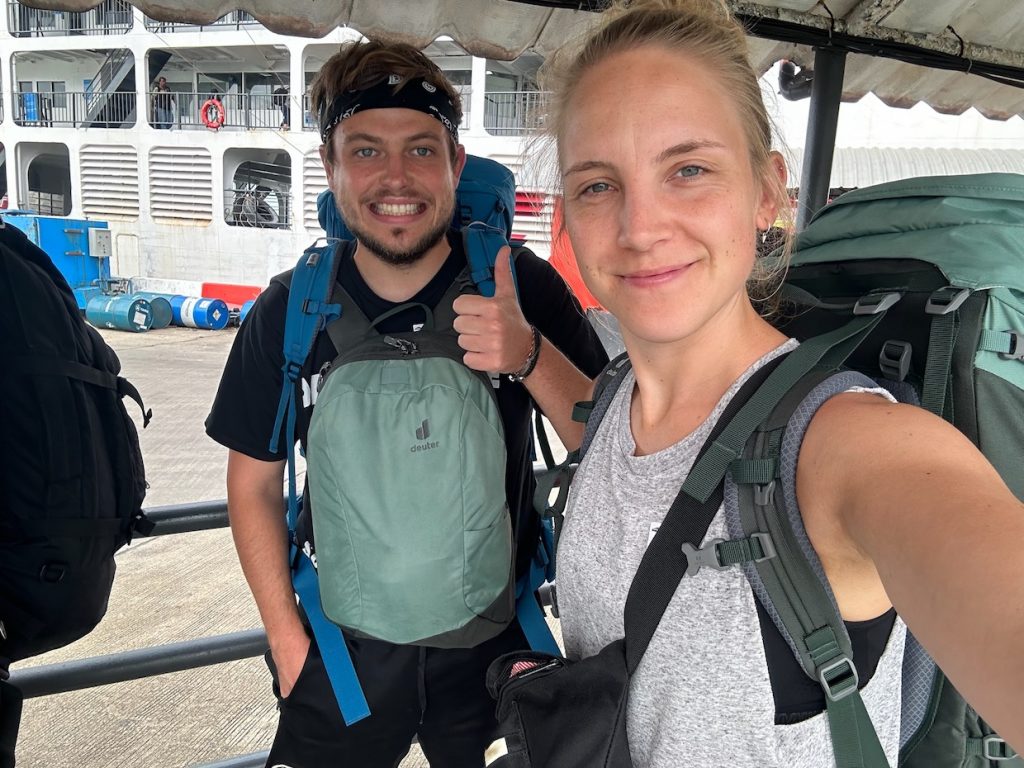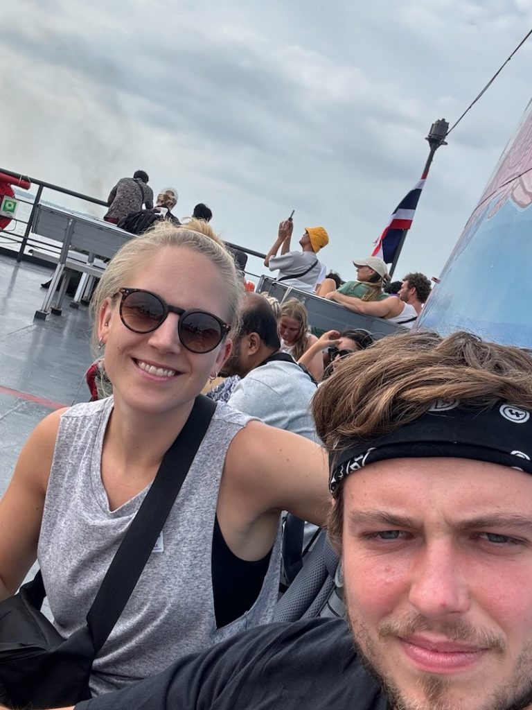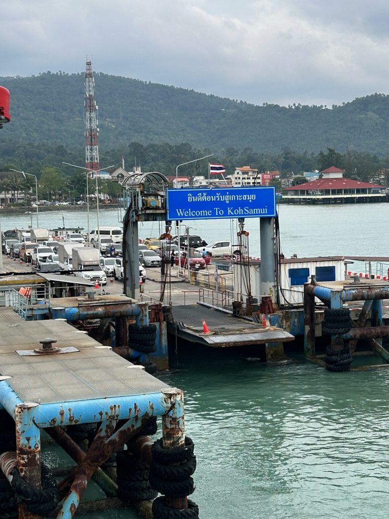 Heute war unser Reisetag zur Insel Koh Samui. Wir sollten um 9 Uhr vom Hotel abgeholt und zum Busbahnhof gebracht werden. Wir saßen pünktlich draußen, haben ausgecheckt und gewartet. Nachdem ich nochmal angerufen hatte, wurden wir nach einer Stunde Wartezeit um kurz nach 10 Uhr abgeholt und der Bus sollte um 10:15 Uhr fahren. Wir kamen noch rechtzeitig an, ich habe unsere Tickets und Marco schnell Frühstück von den Ständen dort geholt. Der erste Minibus war schon voll, sodass noch ein zweiter kam und wir ganz entspannt etwas verspätet Richtung Pier an der Ostküste losfuhren. Wir frühstückten im Bus und nach ca. 2 Stunden kamen wir in Surat Thani nahe der Küste an, wo wir nochmal mit vielen anderen Backpackern in einen größeren Bus umsteigen mussten. Von hier fuhren wir nochmal 1 Stunde zum Donsak Raja Pier und hatten noch 1 Stunde Aufenthalt bis unsere Fähre kam, in der wir uns noch eine Kleinigkeit zu essen holten.