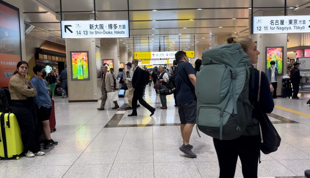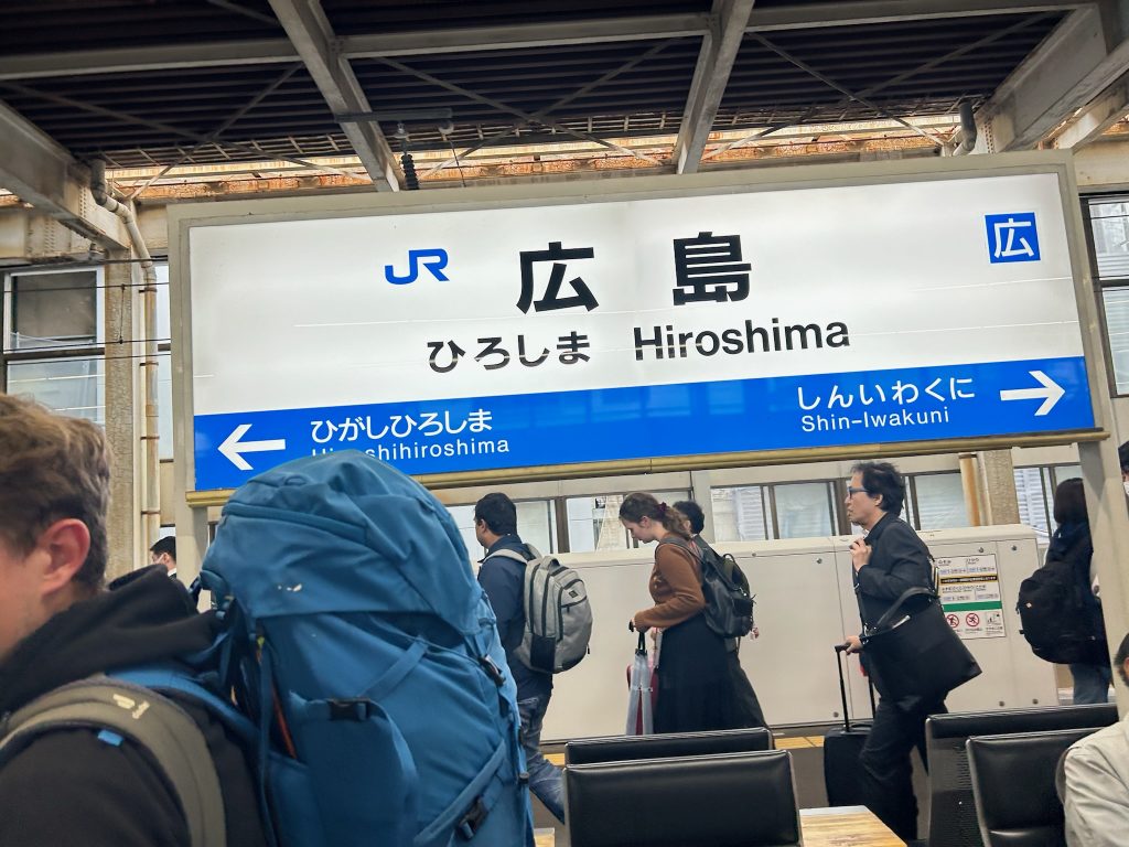 Um 10 Uhr checkten wir aus und liefen zur Metro-Station. Hier wollten wir in einem Café frühstücken aber mussten 30 Minuten anstehen, was wir zeitlich nicht eingeplant hatten. Unser Zug nach Hiroshima fuhr um 12 Uhr und um 11:30 Uhr fuhren wir mit der Metro eine Station zum Hauptbahnhof. Wir hatten sogar noch kurz Zeit für einen Kaffee to go und waren rechtzeitig am Gleis.