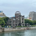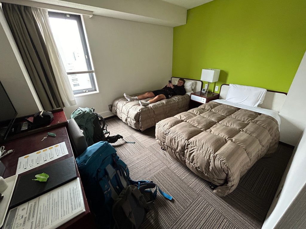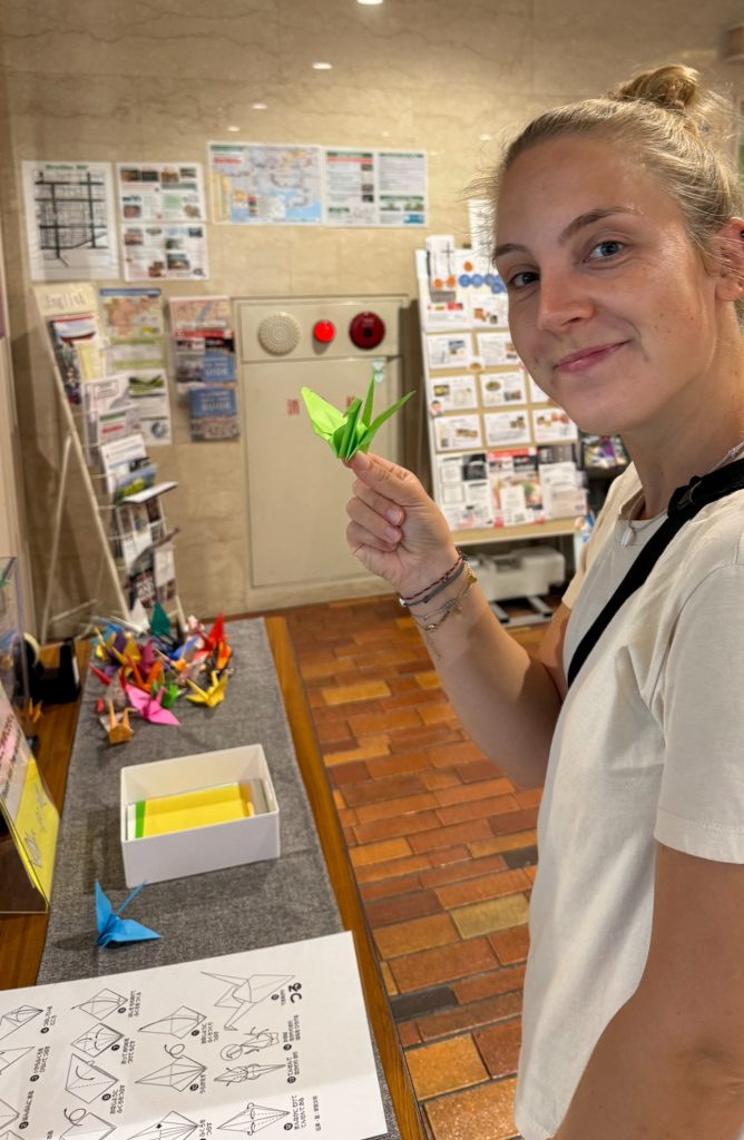 Die Fahrt nach Hiroshima mit dem Schnellzug dauerte 1 Stunde und 40 Minuten (für 375 km). Am Bahnhof kauften wir am Ticketautomaten schonmal direkt das nächste Zugticket. Vor dem Bahnhof konnten wir in einen Bus steigen und fuhren 15 Minuten bis zu unserem Hotel, wo wir für drei Nächte eincheckten. Wir mussten noch kurz warten, bis wir um 14:30 Uhr auf unser Zimmer konnten. In der Zeit habe ich meinen ersten Origami-Schwan gefaltet, da in der Lobby Papier und eine Anleitung auslag. Den Rest des Tages haben wir entspannt im Zimmer verbracht. Abends sind wir in einem Imbiss gegenüber zum Abendessen gegangen.