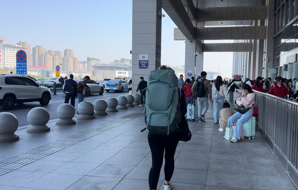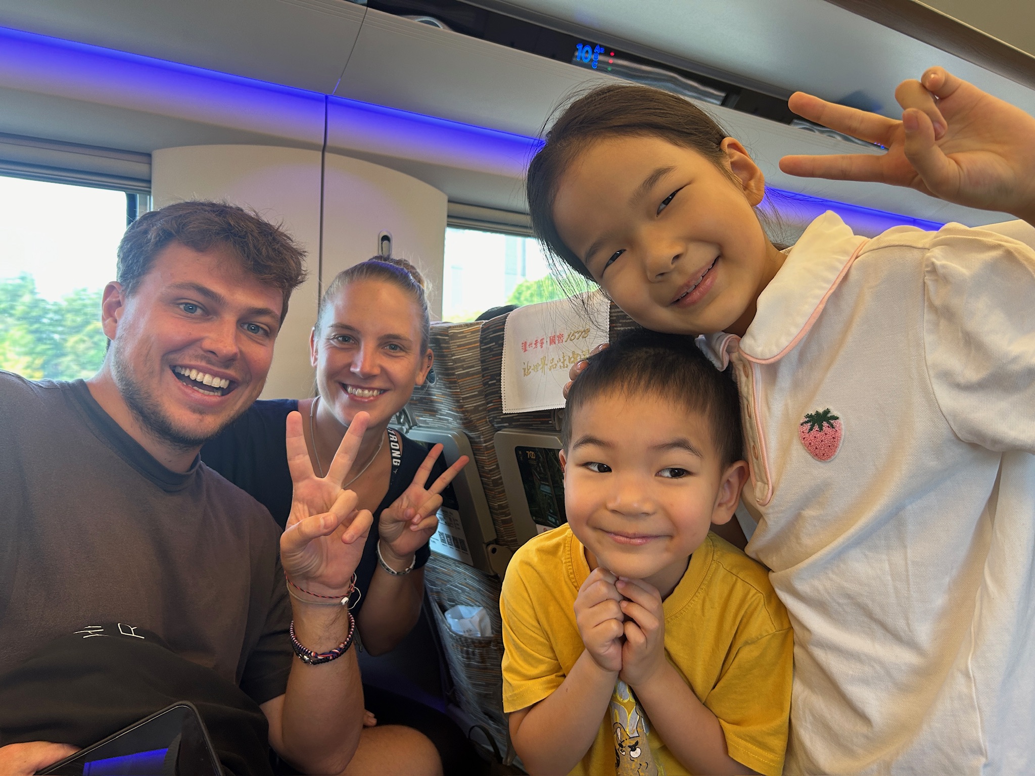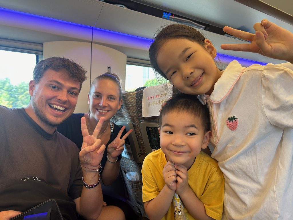 Da unser Zug erst Mittags fuhr, konnten wir ausschlafen. Um 10:30 Uhr checkten wir aus, kauften uns in einem Laden neben unserem Hotel Bananen als Frühstück (was besseres konnten wir in der Nähe nicht finden) und mussten noch ein bisschen auf unser Taxi warten, das im Stau stand. Auch die Fahrt zum Bahnhof dauerte durch den Verkehr länger als geplant, wodurch alles etwas knapp wurde. Um kurz nach 11 Uhr waren wir erst am Bahnhof und unser Zug fuhr um 11:30 Uhr. Wir mussten noch durch die Sicherheitskontrolle und die Leute standen schon vor der Ticketkontrolle an. Eigentlich wollten wir hier noch nach etwas für unser Frühstück schauen, aber ich konnte nur noch schnell auf die Toilette und dann ging auch schon das Boarding los. Die Fahrt nach Peking dauerte drei Stunden. Neben uns in der Dreier-Reihe saß eine Mutter mit ihrer 8 Jahre alten Tochter und ihrem 4 Jahre alten Sohn. Beide, vor allem der Junge, waren komplett aus dem Häuschen, als sie uns gesehen haben. Sie wollten mit uns kommunizieren und zeigen, was sie auf englisch können, und wir unterhielten uns ein bisschen. Die Mutter konnte etwas englisch aber auch hier musste teilweise der Übersetzer helfen. Nach einer Stunde legte sich erst die Aufregung, als die Kinder von einer Mitarbeiterin ermahnt wurden, leise zu sein.
