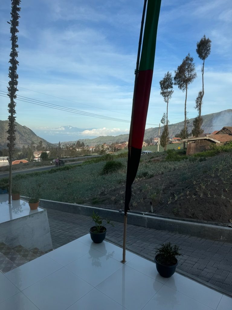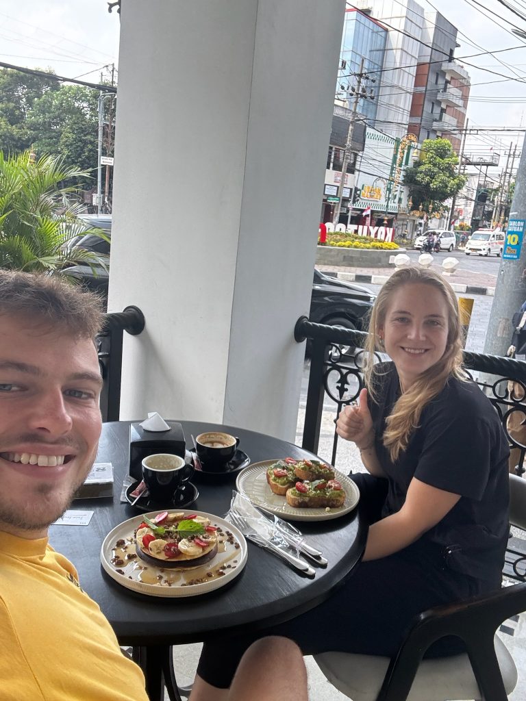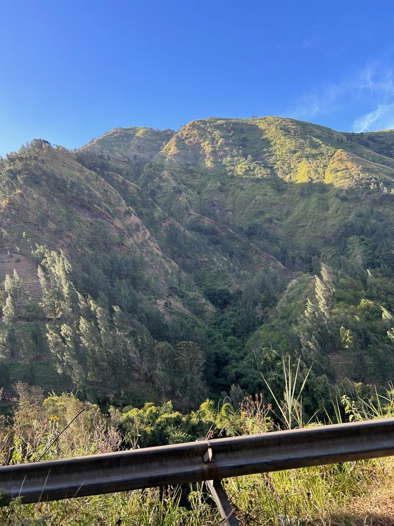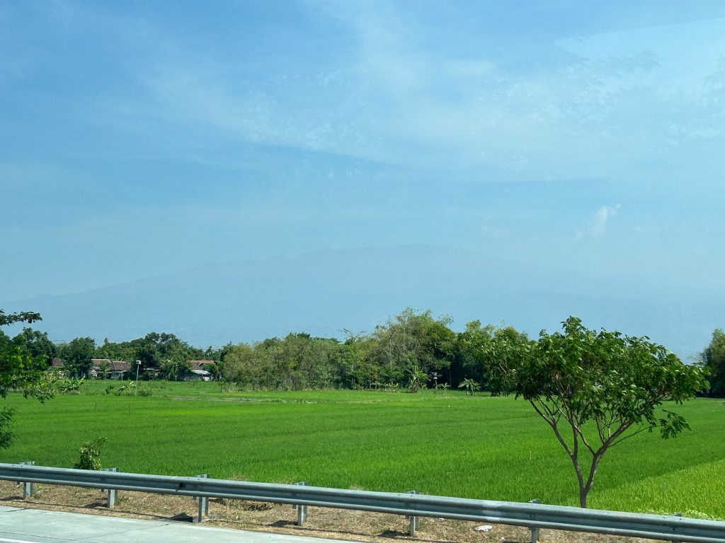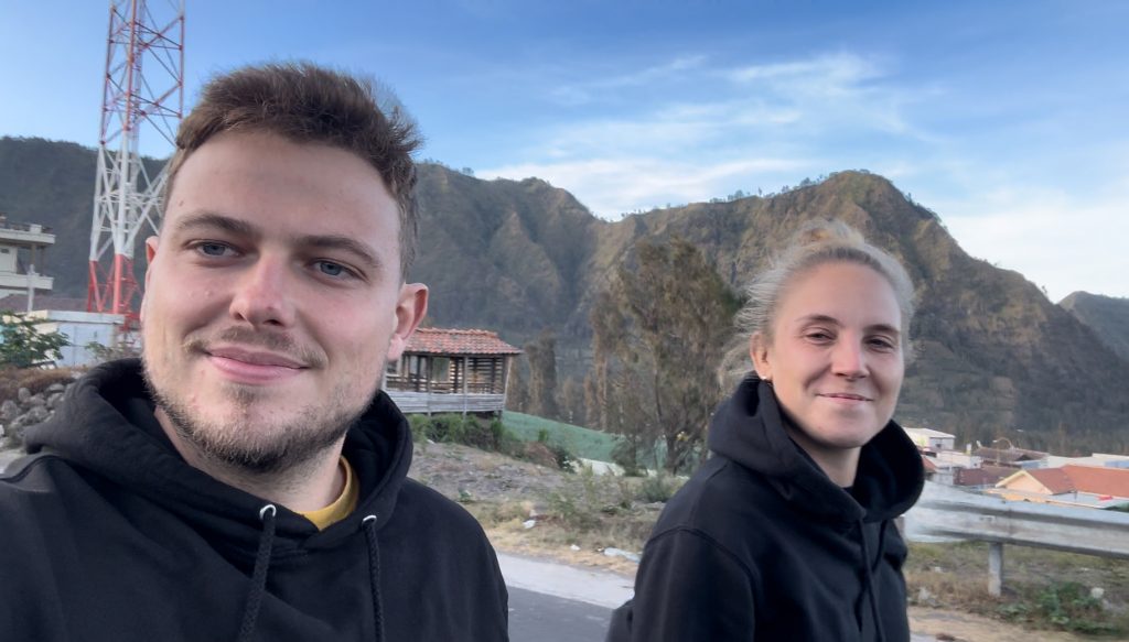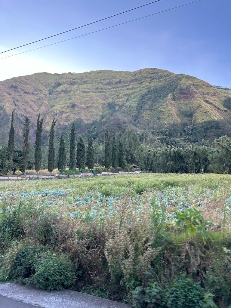 Wir gingen um 9:30 Uhr ins Café an der Ecke zum Frühstücken, weil wir Lust auf westliches Frühstück hatten, dort gab es Avocado Brot und Pfannkuchen für uns. Zurück im Hotel packten wir unsere Sachen und checkten nach 11 Uhr aus. Wir riefen uns ein Grab zum Busbahnhof Arjosari. Wir waren gespannt, wie das alles heute so klappt. Es gab keine Abfahrtszeiten, die Dame aus der Touristeninformation meinte, wir sollen einfach hinfahren, sie fahren irgendwann los. Unser Taxifahrer fragte uns, wo wir hin wollen. Als wir am Busbahnhof ankamen, wurden direkt die Türen aufgerissen, der Taxifahrer rief ihnen unseren Zielort „Probolinggo“ zu und sie nahmen unser Gepäck aus dem Kofferraum :D. Nachdem wir den Taxifahrer bezahlt hatten, liefen wir ihnen hinterher, packten unsere Rucksäcke in den Laderaum eines Reisebusses und stiegen ein. Während wir warteten, kamen immer wieder Männer mit Bauchläden in den Bus, die Snacks und Getränke verkaufen wollten. Um 12 Uhr ging die Fahrt los und unterwegs zahlten wir unseren Fahrschein (3,50€ p.P.). Das erste Mal, dass wir Bus in Java fahren, um zum nächsten Ort zu kommen. Die Fahrt dauerte ca. zwei Stunden und ging erst mal zäh aus Malang raus, ein Stück über die Autobahn, durch Ortschaften und an Feldern und einem großen Berg vorbei.