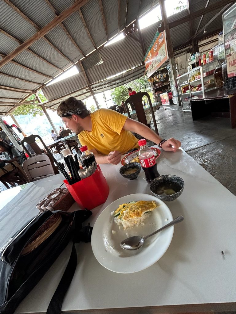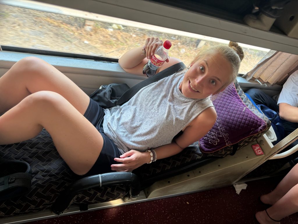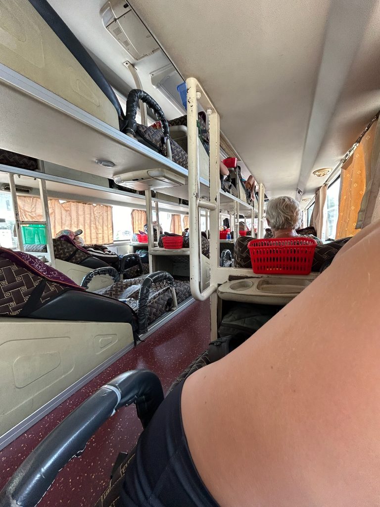 Da unser Bus heute erst um 12 Uhr fahren sollte, gingen wir entspannt um 9:30 Uhr zum Frühstück auf die Terrasse und genossen nochmal die Aussicht. Nach dem Packen checkten wir um 11 Uhr aus und spielten noch eine Runde Billard, während wir auf den Bus warteten. Dieser hatte leider eine halbe Stunde Verspätung. Es war ein Schlafbus, mit drei Reihen an zweistöckigen Liegesitzen – tagsüber etwas unnötig. Wir fuhren fünf Stunden nach Da Lat in die Berge. Die Strecke ging teilweise über eine holprige Straße durch etwas trockene Berge. Wir machten eine kurze Pause für einen Toilettengang und SEHR schnelles Mittagessen.