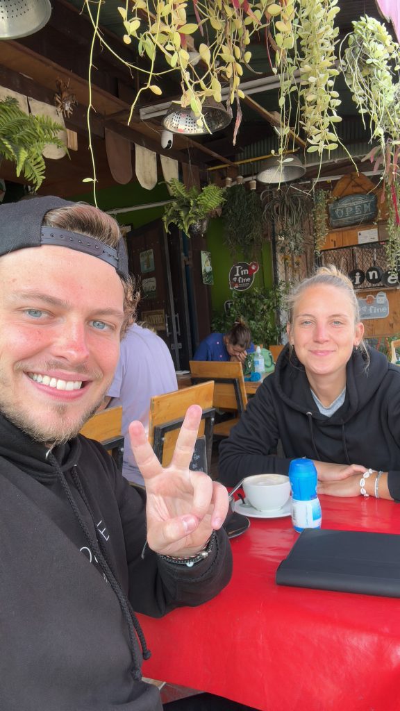 Heute checkten wir um 9 Uhr aus und fuhren zum ersten Mal mit unseren Rucksäcken auf dem Roller in die Stadt. Da wir den Roller erst heute Morgen abgeben mussten und keine Lust hatten die Strecke zu laufen, wollten wir es mal ausprobieren und es hat für die kurze Strecke auch gut geklappt. Während ich mich schon mal in Frühstücksrestaurant setzte, welches wir am Vortag gesehen hatten, brachte Marco den Roller zur Vermietung zurück, die nur ein paar Schritte entfernt lag. Hier gab es Frühstücksbüffet für ein gutes Preis-Leistungs-Verhältnis. Danach liefen wir zur Busstation und setzten uns gegenüber noch auf einen Kaffee in ein Café, da wir noch 1 Stunde warten mussten.