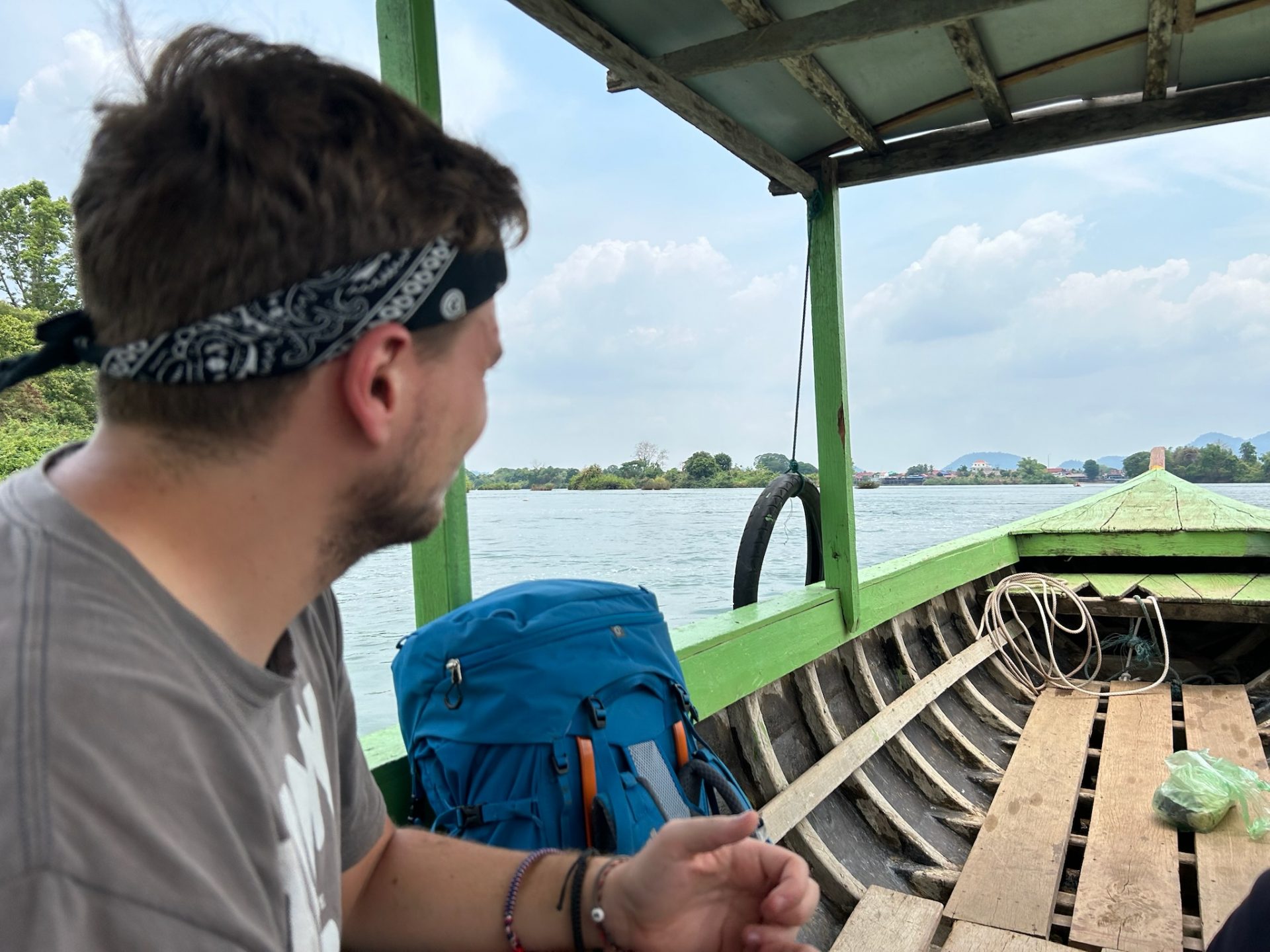 Das Gebiet Si Phan Don liegt an der Grenze zu Kambodscha, wo der Mekong mit 14 km seine größte Breite erreicht und dabei ca. 4.000 Inseln bildet. Die Irawadi Delfine, die wir in Katie gesehen hatte, sind hier leider schon ausgestorben. In Nakasong am Flussufer stiegen wir aus und liefen zum Fähranlegerhäuschen, wo wir unsere Tickets holten. Hier sah Marco zufällig einen guten Wechselkurs, sodass wir 100€ eintauschten. Das sollte für die letzten Tage reichen. Danach ging es zur Fähre, also einem motorbetriebenem Holzboot. Die Fahrt zur Insel dauerte ca. 15 Minuten vorbei an ein paar kleinen, sehr grünen Inseln. Vom Fähranleger an der Nordspitze von Don Det mussten wir nur ein paar Schritte zu unserem Hotel laufen, das direkt am Mekong lag. Wir checkten für drei Nächte ein und wollten später bezahlen, in der Hoffnung, dass Marco es in den drei Tagen schafft, die Sache mit seiner Kreditkarte zu klären (Ich musste noch auf den Aktivierungs-Code per Post für die TAN-App warten 🙄). Das Hotel hatte eine schöne Anlage und wir hatten ein großes Zimmer mit großen Fenstern und Blick aufs Wasser. Da in der App nichts von einer Sperrung der Karte stand, wollte Marco einfach mal versuchen, unser Zimmer mit der Karte zu bezahlen und es klappte. Ein Glück aber keine Ahnung was da los war, vielleicht über irgendein Tages-Limit (mit dem Buchen des Flugs und des Zimmers) gekommen oder so. Wir verbrachten den restlichen Tag auf dem Zimmer, damit ich mich ausruhen konnte. Da es für uns heute kein Frühstück gab, hat Marco uns ein frühes Abendessen aus einem Lokal geholt.