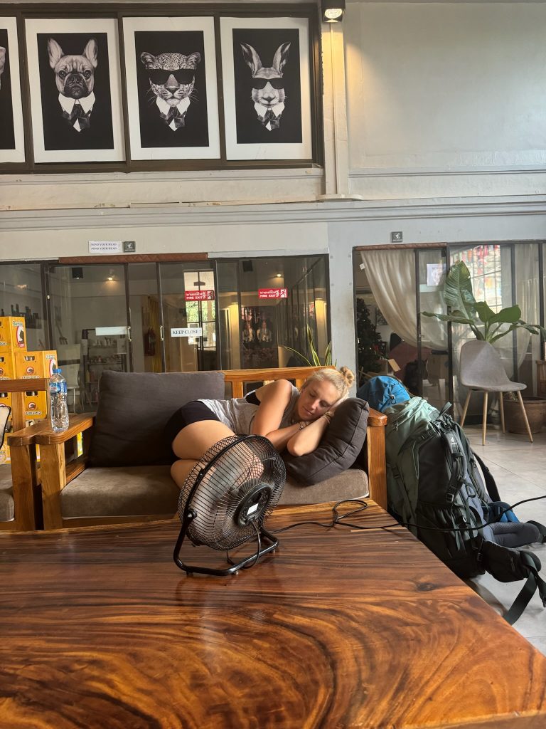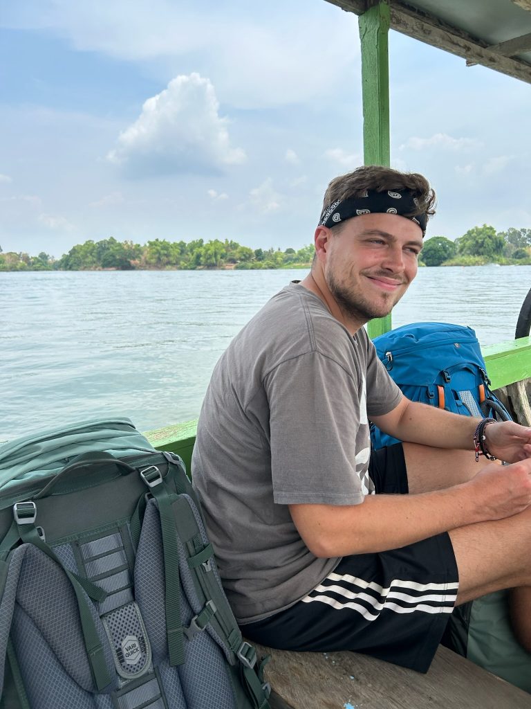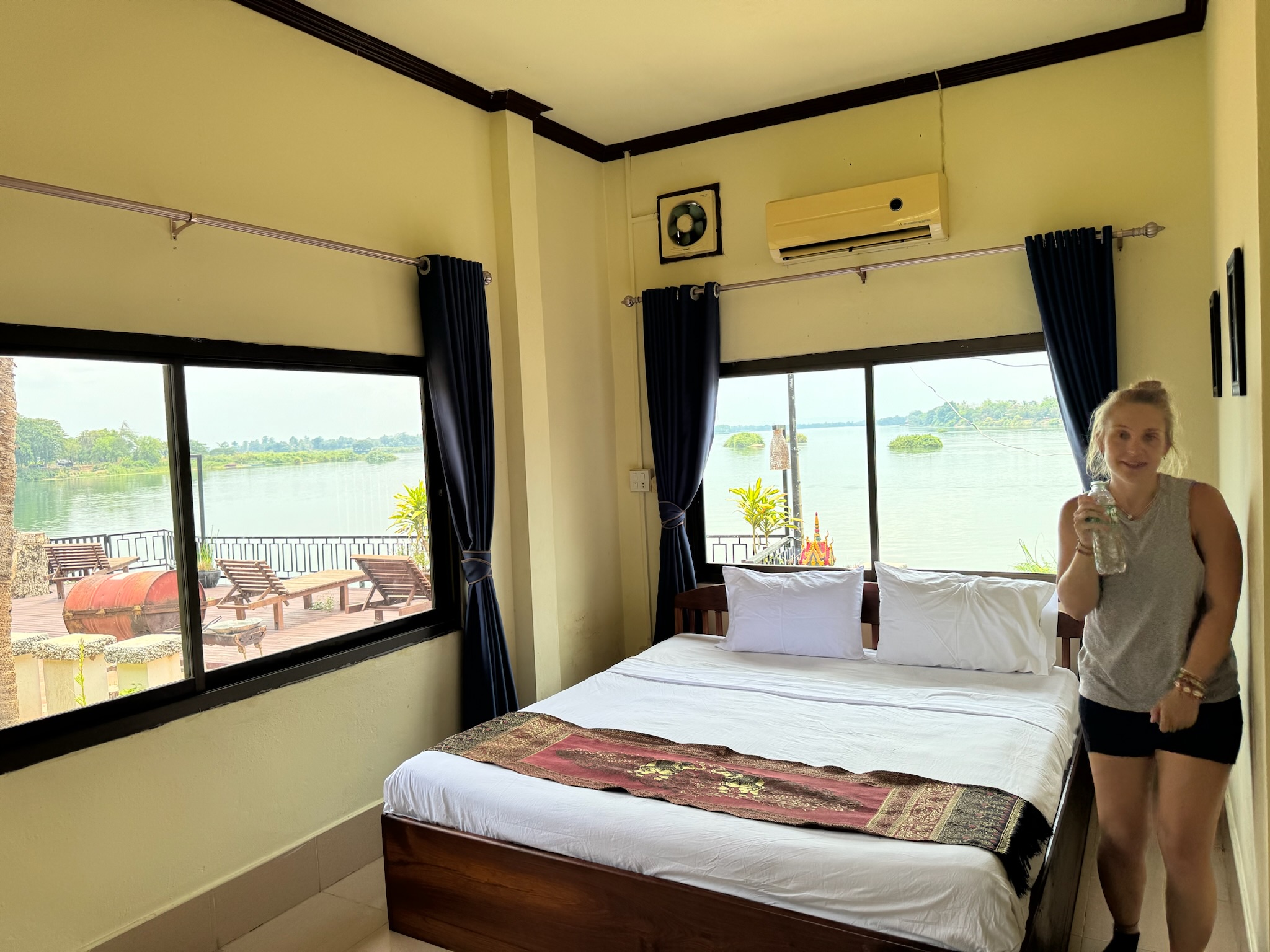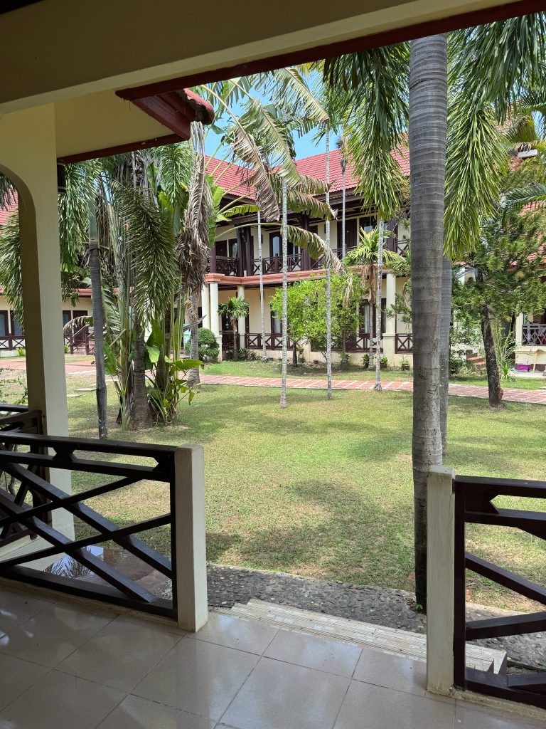 Das Gebiet Si Phan Don liegt an der Grenze zu Kambodscha, wo der Mekong mit 14 km seine größte Breite erreicht und dabei ca. 4.000 Inseln bildet. Die Irawadi Delfine, die wir in Katie gesehen hatte, sind hier leider schon ausgestorben. In Nakasong am Flussufer stiegen wir aus und liefen zum Fähranlegerhäuschen, wo wir unsere Tickets holten. Hier sah Marco zufällig einen guten Wechselkurs, sodass wir 100€ eintauschten. Das sollte für die letzten Tage reichen. Danach ging es zur Fähre, also einem motorbetriebenem Holzboot. Die Fahrt zur Insel dauerte ca. 15 Minuten vorbei an ein paar kleinen, sehr grünen Inseln. Vom Fähranleger an der Nordspitze von Don Det mussten wir nur ein paar Schritte zu unserem Hotel laufen, das direkt am Mekong lag. Wir checkten für drei Nächte ein und wollten später bezahlen, in der Hoffnung, dass Marco es in den drei Tagen schafft, die Sache mit seiner Kreditkarte zu klären (Ich musste noch auf den Aktivierungs-Code per Post für die TAN-App warten 🙄). Das Hotel hatte eine schöne Anlage und wir hatten ein großes Zimmer mit großen Fenstern und Blick aufs Wasser. Da in der App nichts von einer Sperrung der Karte stand, wollte Marco einfach mal versuchen, unser Zimmer mit der Karte zu bezahlen und es klappte. Ein Glück aber keine Ahnung was da los war, vielleicht über irgendein Tages-Limit (mit dem Buchen des Flugs und des Zimmers) gekommen oder so. Wir verbrachten den restlichen Tag auf dem Zimmer, damit ich mich ausruhen konnte. Da es für uns heute kein Frühstück gab, hat Marco uns ein frühes Abendessen aus einem Lokal geholt.