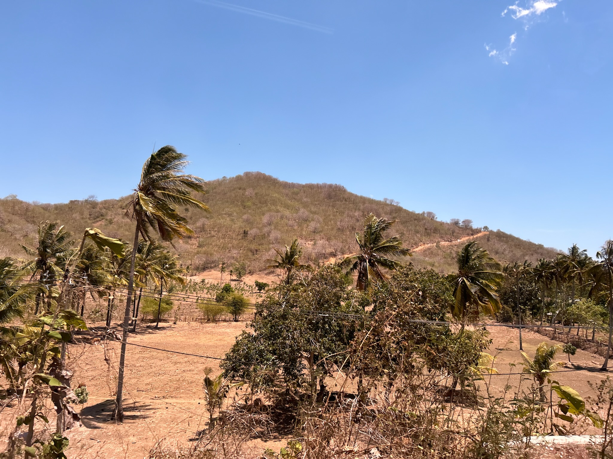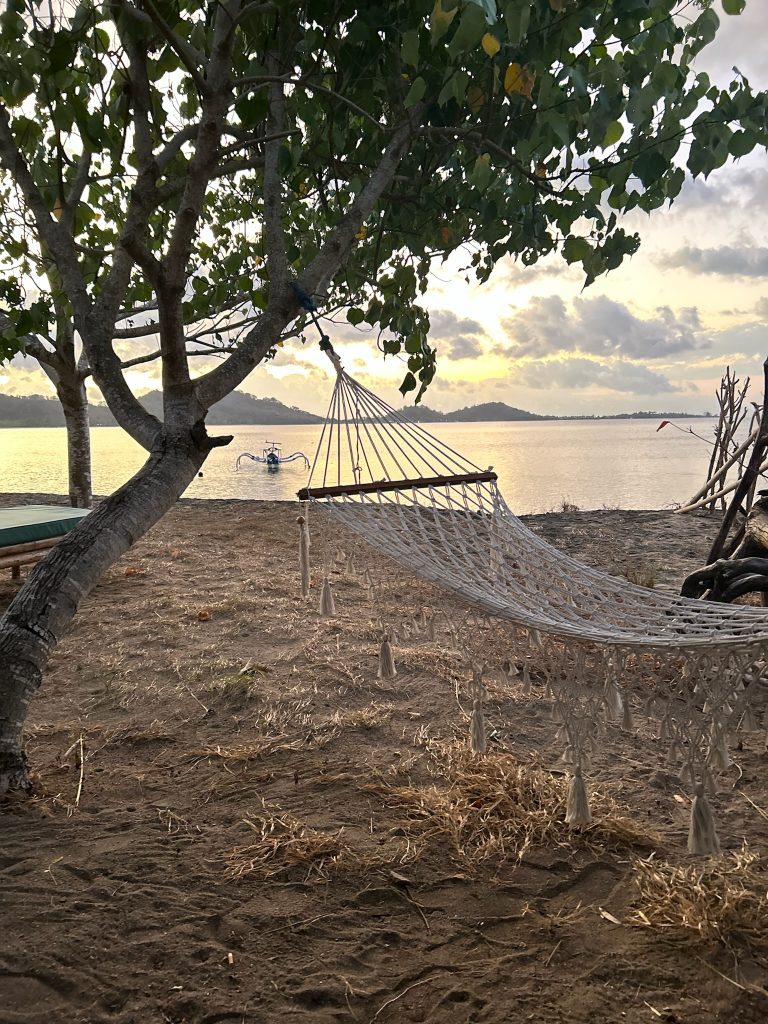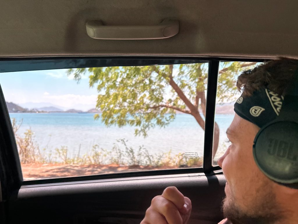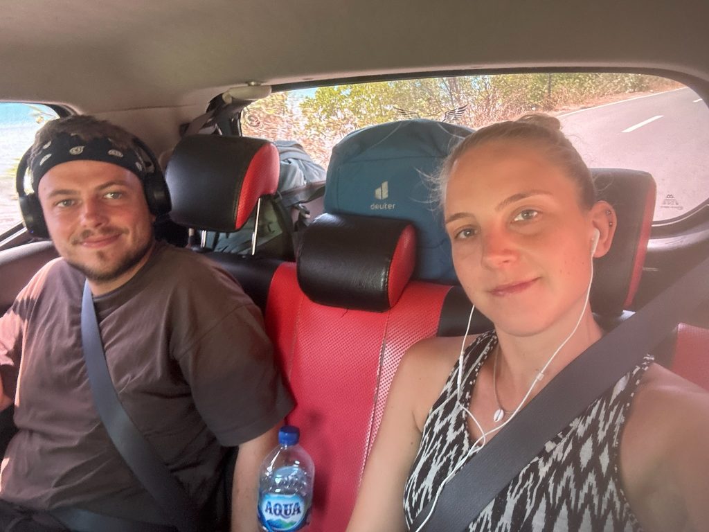 Wir packten unsere Sachen zusammen und aßen Toast mit Erdnussbutter auf unserer Terrasse zum Frühstück. Unser Fahrer war überpünktlich da und wartete schon ungeduldig, obwohl wir pünktlich um kurz vor 10 Uhr aus der Unterkunft kamen. Die Fahrt ging über den Berg durch den Wald, durch die Hauptstadt bis nach Sekotong, eine Halbinsel. Es war eine etwas rasante und unangenehme Fahrt, die zwei Stunden dauerte. Für die Strecke von 77 km haben wir 32€ bezahlt.