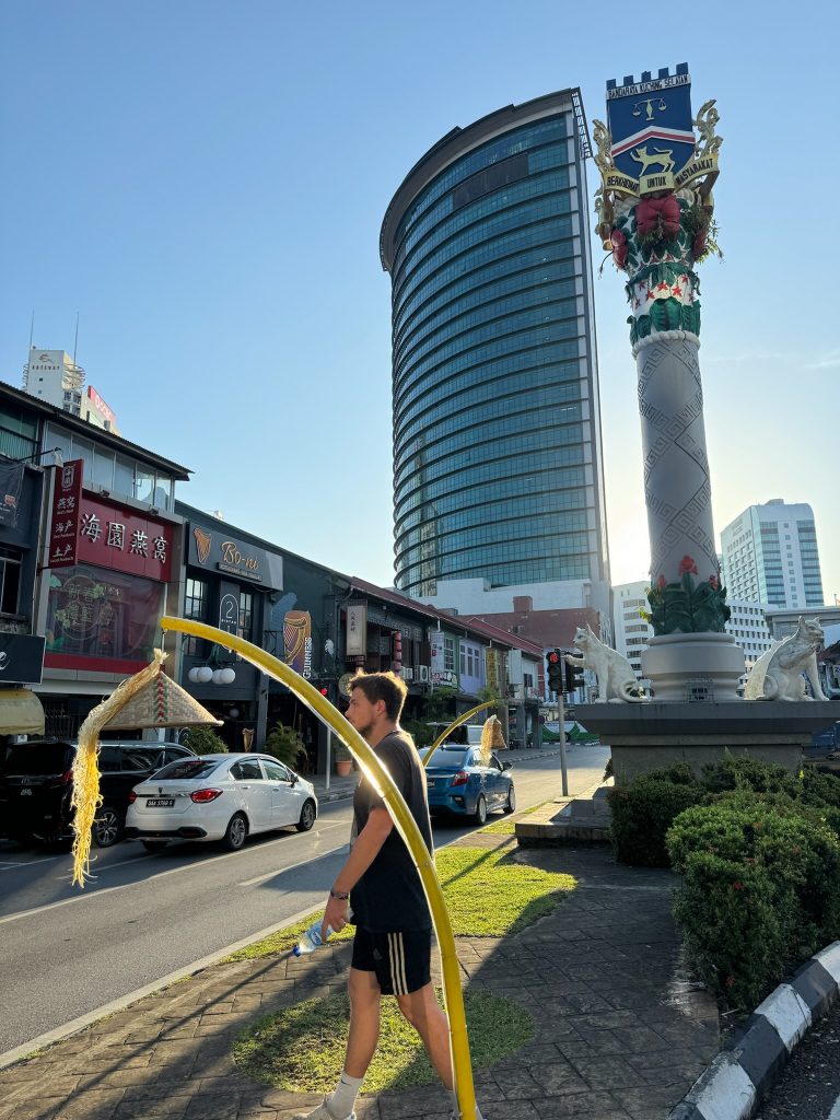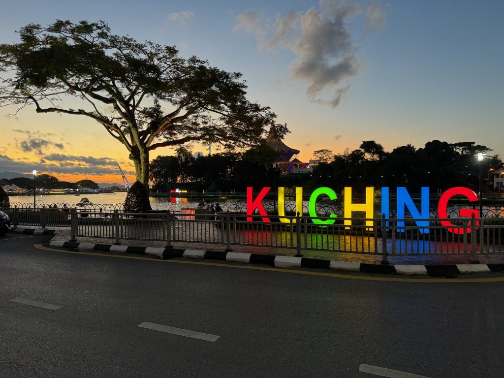 Der Flug nach Kuching im südwestlichen Bereich vom malayischen Borneo dauerte zwei Stunden. Bei der Passkontrolle für Ausländer war keine Schlange und auch beim Gepäckband hatten wir keine Wartezeit. Vor dem Ausgang mussten wir 15 Minuten auf unser Grab warten und ca. 20 Minuten zu unserem Hotel fahren, wo wir vorerst für fünf Nächte eincheckten. Unser Hotel lag ca. 2 km außerhalb des Stadtzentrums. Drumherum war nicht viel los aber in unserem Gebäude war das Restaurant Alfresco, wo es lokales und westliches Essen gab und wir zum Abendessen ausprobierten.