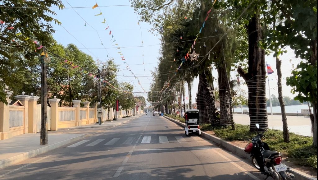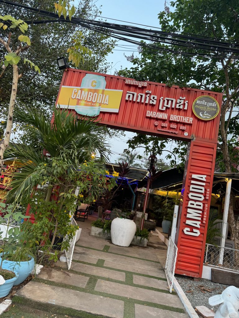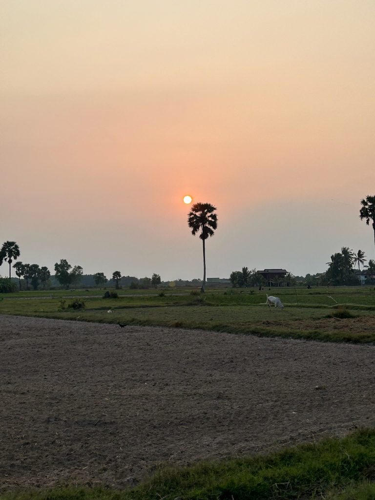 Heute ist unser Abreisetag. Wir frühstückten die Reste in unserem Zimmer, packten unsere Sachen zusammen und checkten um 8:45 Uhr aus. Vor der Tür warteten wir auf unseren Grab-Fahrer, sind erst ins falsche Tuk Tuk gestiegen und weil wir die Fahrt in der App nicht umbuchen konnten oder so, mussten wir aussteigen und uns ein neues bestellen, welches aber auch direkt kam. Die paar Minuten Fahrt haben/mussten wir unserem ersten Fahrer natürlich trotzdem bezahlen. Wir sind zum Glück noch rechtzeitig an der Busstation angekommen. Um 9:30 Uhr fuhr unser Minibus nach Kampot, an der Küste im Süden. Da wir einige Wochen nicht das Meer gesehen haben, sollte unsere Reise erst mal wieder an die Küste gehen. Bei einer Fahrtdauer von 2,5 Stunden machten wir zwei Pausen. Also in Thailand werden ja auch gerne mal 6 Stunden ohne Pause durchgezogen. Die Fahrt ging auf gerader Strecke und guter Straße immer geradeaus über das flache Land, an braunen bis grünen Feldern vorbei und einige Ortschaften durch. Unser Fahrer mochte es gerne zu hupen, es ging eigentlich in einer Tour…