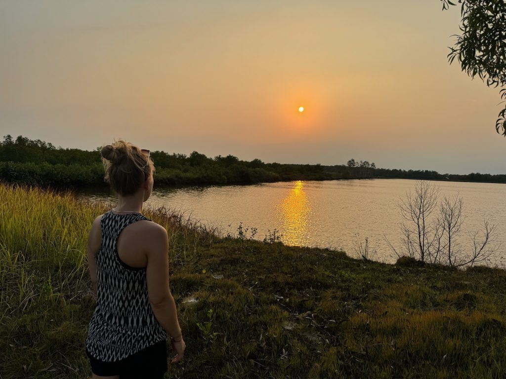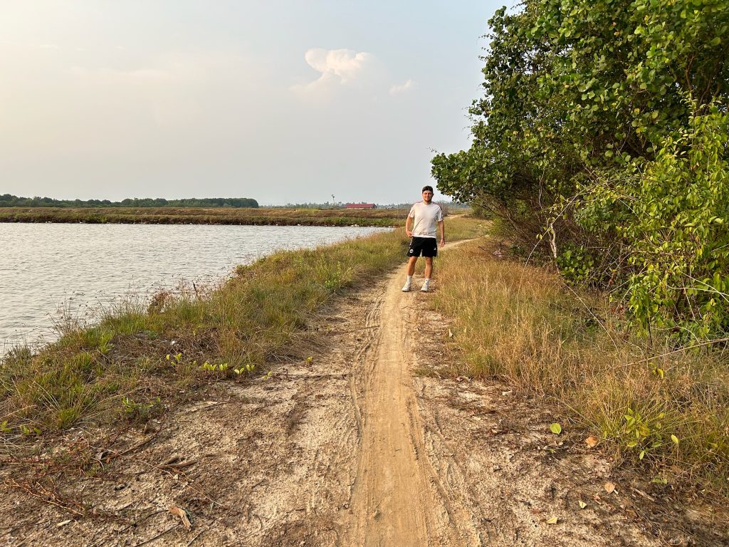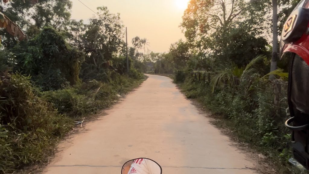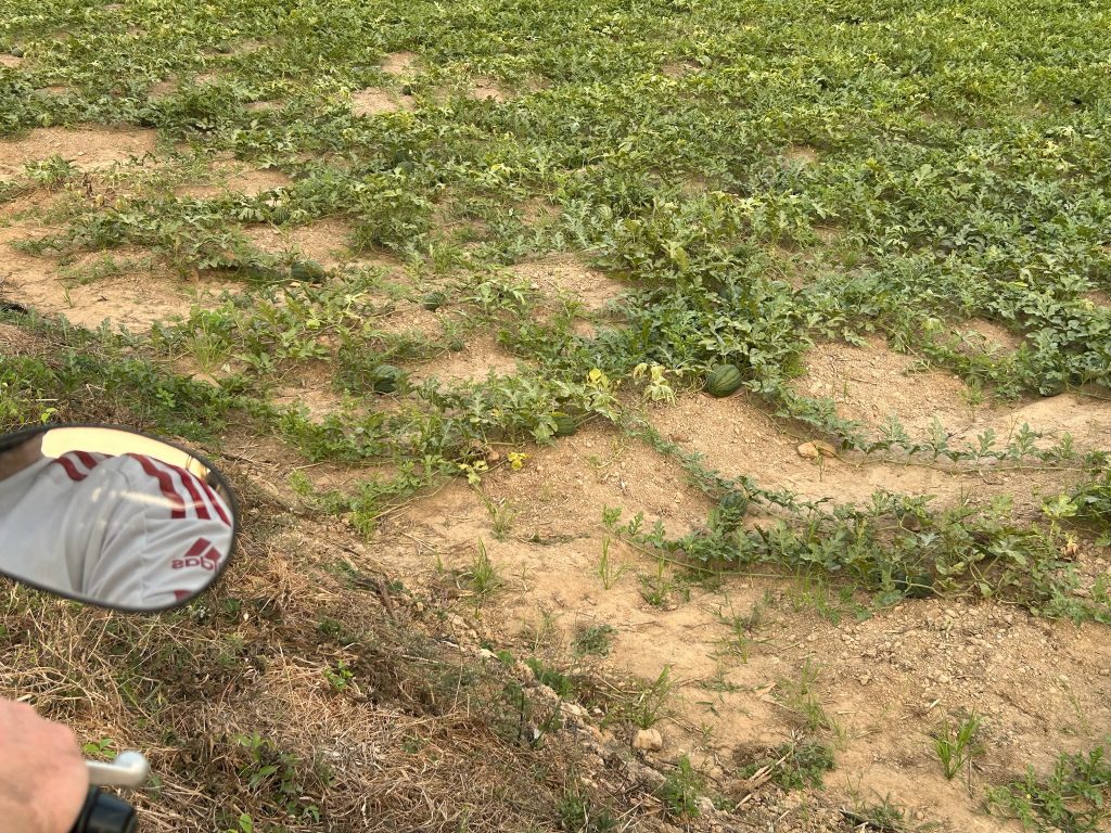 Endlich wieder auf normaler Straße wollten wir noch weiter zu einem Mangrovenwald am Meer. Dafür mussten wir am Ende der langen Fahrt (30 Minuten) wieder an Feldern und Ackern vorbei. Hier sahen wir zum ersten Mal wie Wassermelonen auf einem Feld angebaut werden. Leider haben wir mit Google Maps den Weg zu dem Steg durch den Mangrovenwald nicht gefunden. Da es kurz vor Sonnenuntergang war, traten wir um 17:30 Uhr unseren Rückweg an. Nach den Stunden auf dem Roller, taten unsere Hintern mal wieder gut weh.