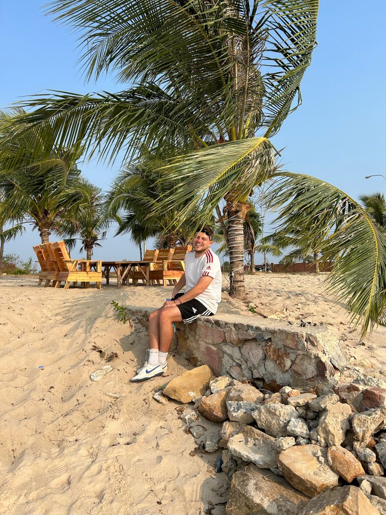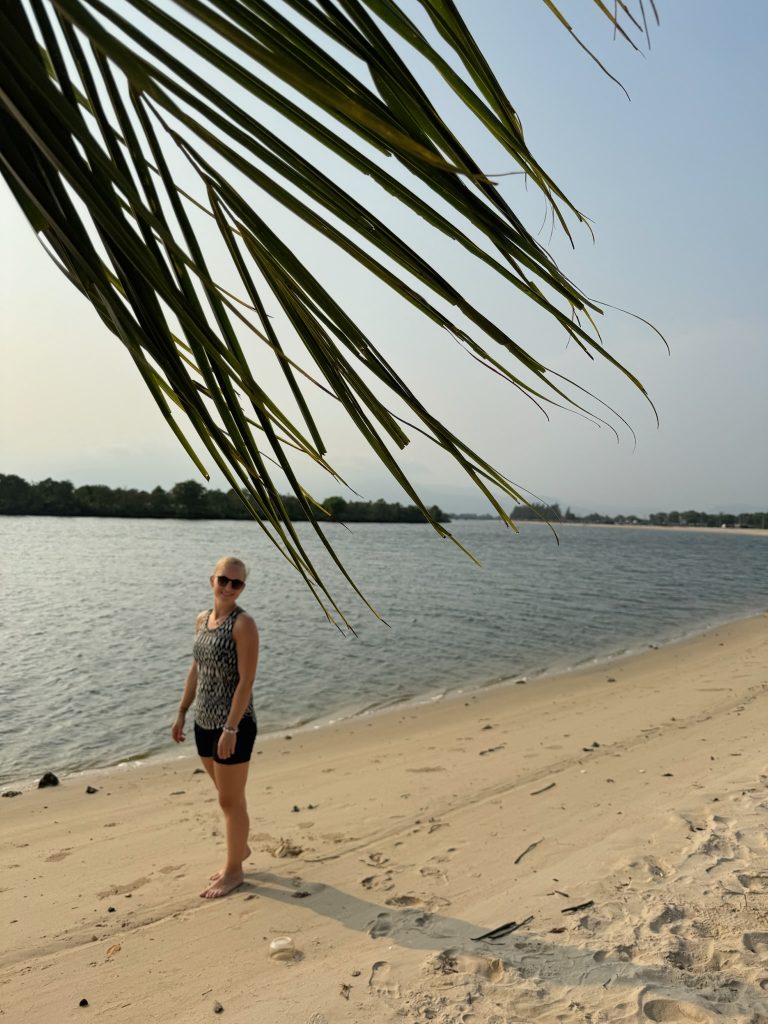 Gegen 13 Uhr sind wir in Kampot angekommen und wurden mal wieder direkt von Tuk Tuk- Fahrern belagert – in Kambodscha ist das echt (im Vergleich zu Thailand) teilweise grenzwertig. Aber gut, irgendwie kommt man da immer raus und zur Not fragt man sie, ob sie die Grab Fahrer sind, dann hauen sie direkt ab 😀 Wir konnten aber zu unserem Hotel 10 Minuten zu Fuß laufen. Erschöpft kamen wir an und ruhten uns erst mal im Zimmer aus. Leider hatte das Zimmer nur einen Ventilator. Am Nachmittag gingen wir nochmal los zum Supermarkt, einen Mittagssnack kaufen und gingen weiter zu einer Rollervermietung um die Ecke. Hier liehen wir uns einen Roller für zwei Tage (6$ p.T.). Wir fuhren an der Riverside entlang stromabwärts bis zum Riverbeach. Hier setzten wir uns an den Strand und aßen unser Baguette mit Schmierkäse aus dem Supermarkt.
