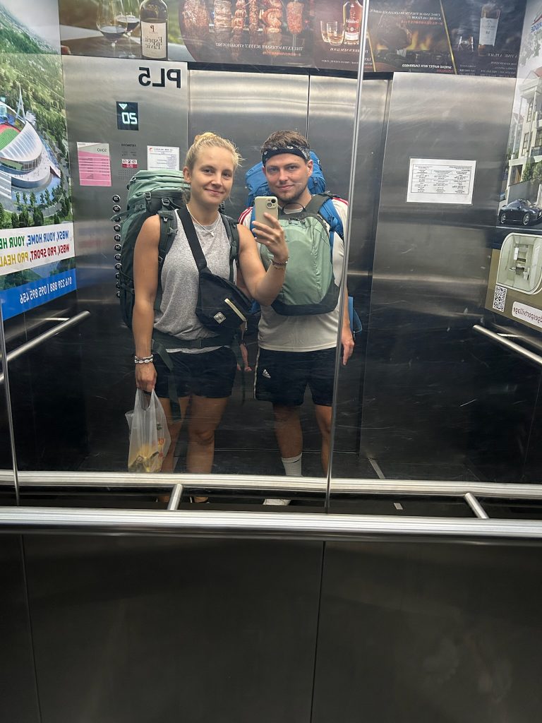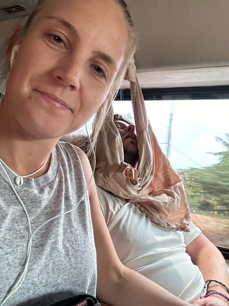 Im Kreisel nahe unserer Unterkunft setzten wir uns in ein Restaurant und bestellten einheimisches Essen. Wir waren die einzigen Gäste bis ein Mann reinkam, der uns wegen Marcos weiß-rotem Sportshirt angesprochen hat. Als sich herausstellte, dass er auch Deutscher ist, hat er sich einfach bei uns an den Tisch gesetzt und uns vollgelabert. Er war ein lauter, irgendwie super komischer Typ. Hat dort mit Trillerpfeife das Personal kommandiert und Sachen auf den Boden geschmissen. Super unangenehmes Gefühl und wir haben ihm auch gesagt, wie asi das ist (haben dann auch ein paar Sachen aufgehoben) Naja, einfach ein komischer Typ…Und wir waren so nett und haben seine Gesellschaft ausgehalten. Aber da er anscheinend ein Aussteiger ist (er wollte nicht so ganz mit seiner Geschichte rausrücken), hatten wir auf Reisetipps von ihm gehofft. Als wir endlich den Absprung geschafft haben, mussten wir ihn noch im Supermarkt abhängen und flüchteten auf dem Roller in unsere Unterkunft 😀 Im Zimmer buchten wir dann noch unsere nächste Unterkunft.