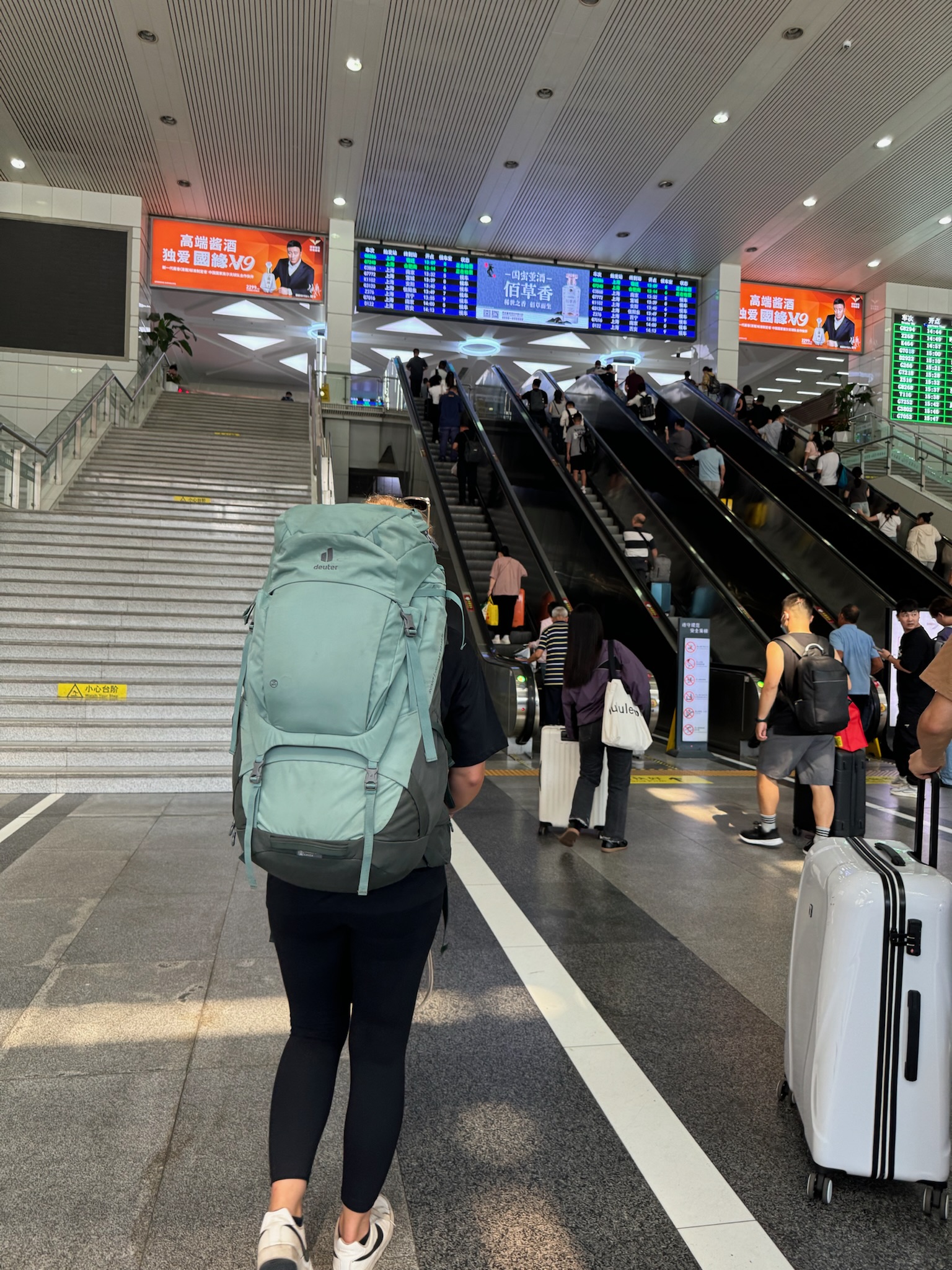 Der Wecker klingelte früh, denn um 9:30 Uhr sollte unser Zug gehen. Gleich nach dem Aufstehen lief ich runter zur Rezeption, um nach meinem Rucksack zu fragen, der mit dem Flugzeug um Mitternacht ankommen sollte, aber er war nicht angekommen… Gefrustet ging ich wieder hoch, über die Service-Hotline konnte man erst ab 9:00 Uhr jemanden erreichen – toller Service?! Also mussten wir unseren eigentlichen Zug verfallen lassen und gingen erstmal in die Mall, um uns bei Starbucks Frühstück zu holen. Um kurz nach 9 Uhr lies ich über die Rezeption die Hotline anrufen. Die Antwort war nur „er ist auf dem weg“, mehr konnte man mir nicht sagen. Also hieß es warten…Um 12 Uhr mussten wir auschecken und dabei wurde mir ein Paket überreicht, wo mein Rucksack drin war und die Freude war groß. Ein Glück!! Noch rechtzeitig, dass wir nicht alle Pläne umwerfen müssen, haben immerhin schon 60€ für die Zugtickets verloren. Wir buchten direkt den nächsten Zug um 14:30 Uhr nach Huangshan und machten uns mit der Metro auf den Weg zum Hauptbahnhof.
