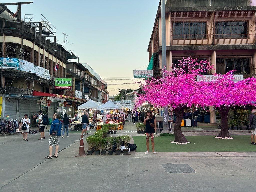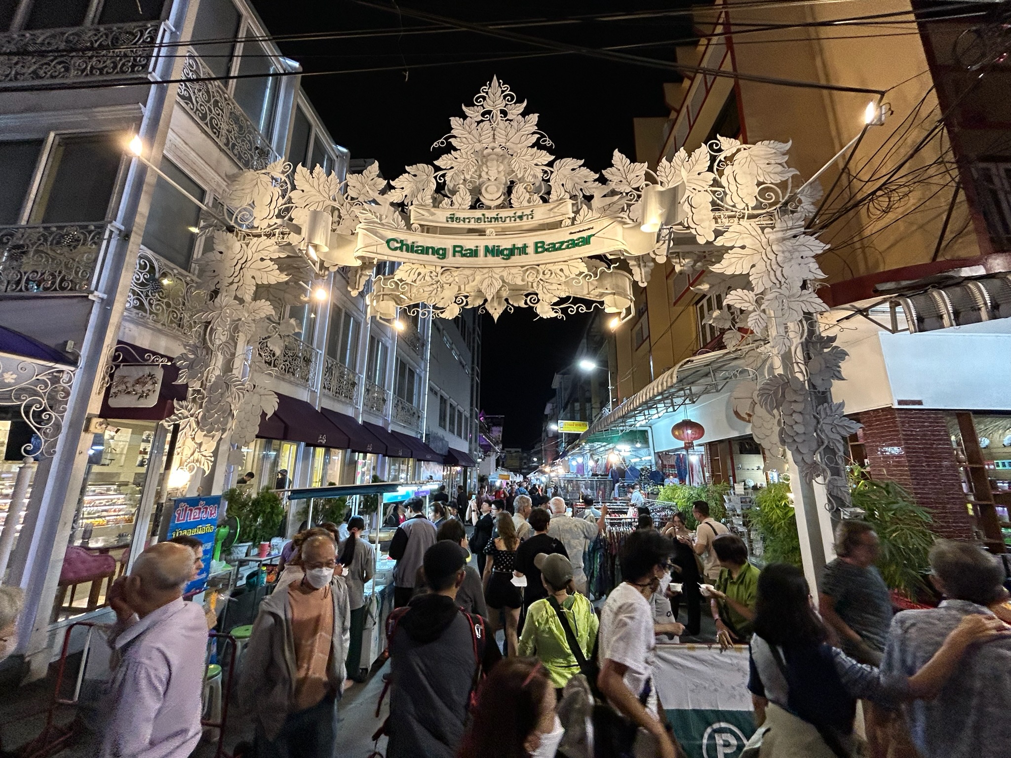 Vom Busterminal im Süden von Chiang Rai nahmen wir uns ein Grab und mussten noch ca. 15 Minuten ins Zentrum fahren. Gegen 17:30 Uhr kamen wir in unserer Unterkunft an und checkten für die nächsten zwei Tage ein. Nachdem wir die Sachen auf unser Zimmer gebracht haben, liefen wir los zum Nightmarket, der nur ein paar Straßen entfernt liegt. Der Markt befindet sich auf einem Platz, rechts und links sind feste Buden aufgebaut und dazwischen stehen Tische und Stühle mit einer Bühne am Ende. Endlich was essen! In den Straßen davor gibt es die typischen Souvenir- und Krimskrams-Stände.