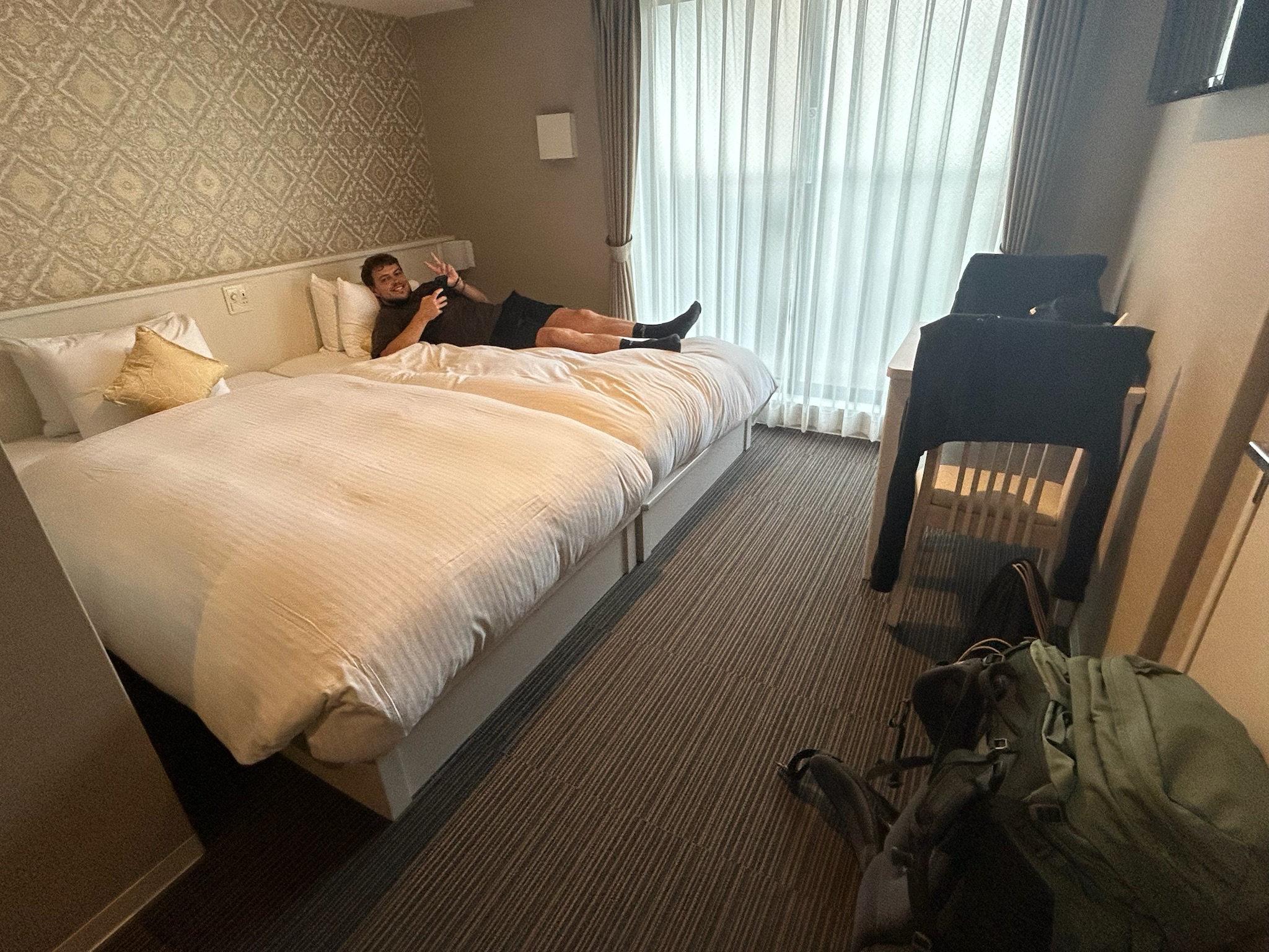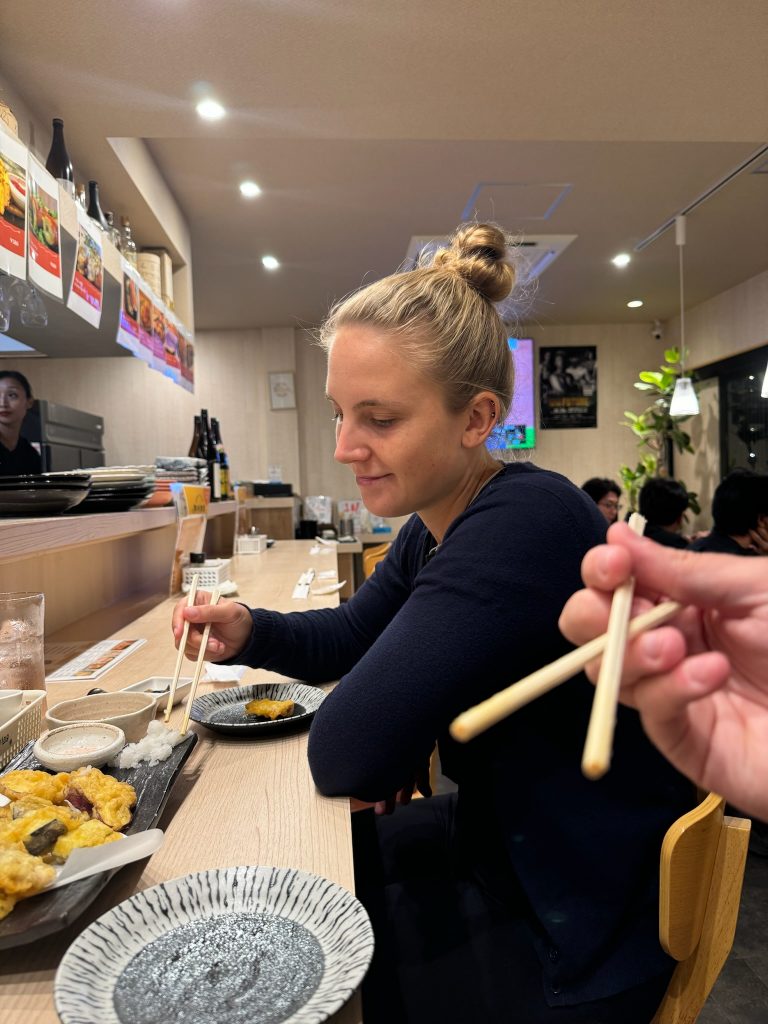 Gegen 14 Uhr kamen wir in Kyoto an und liefen 15 Minuten nach Süden zu unserem Hotel. Hier checkten wir für fünf Nächte ein. Den Rest des Tages ruhten wir uns auf dem Zimmer aus. Abends gingen wir nochmal los, um ein Restaurant zum Abendessen zu suchen. Wir sind in einem „Izakaya“-Restaurant gelandet, wo man sich, wie bei Tapas, mehrere kleinere Speisen bestellt. Nebenbei lief Baseball auf dem Fernseher, eine der beliebtesten Sportarten in Japan.