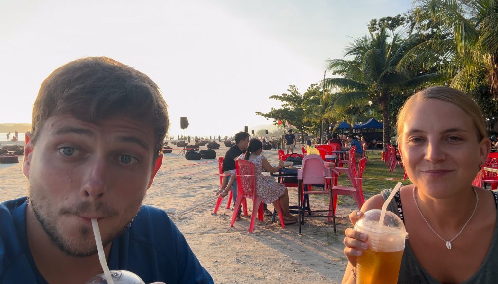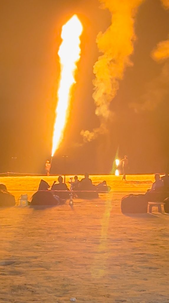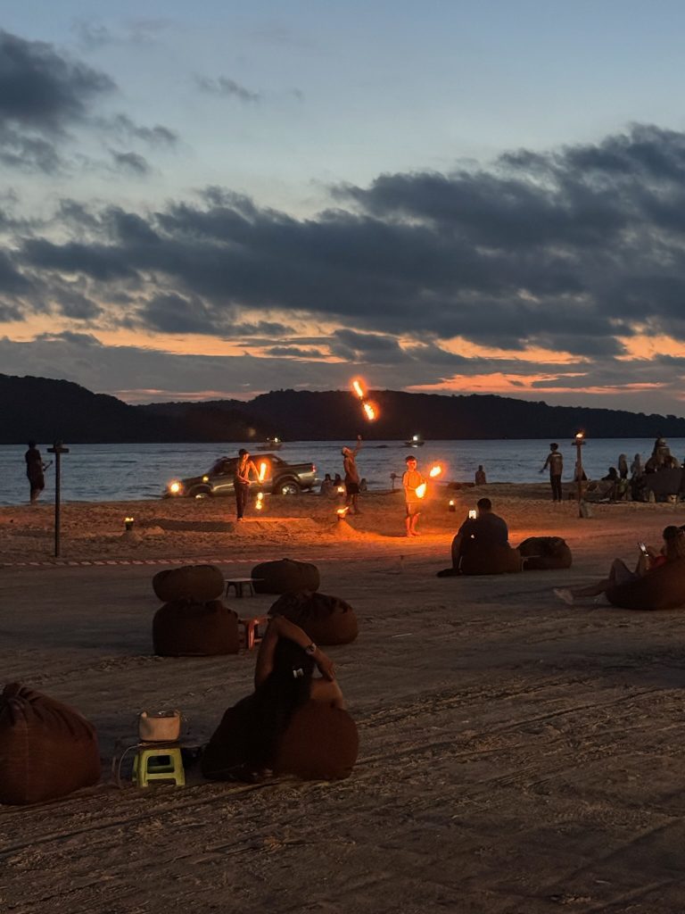 Wir fuhren die ganze Strecke durch den Wald und am Flughafen vorbei zurück zum Hotel. Wir waren etwas müde von der langen Fahrt, bei der wir einmal die Insel komplett umrundet hatten. Gegen 18 Uhr fuhren wir nochmal los zum Hauptstrand, setzten uns dort in das bekannte Lokal zum Abendessen und schauten uns von hier den Sonnenuntergang und danach die Feuershow am Strand an.
