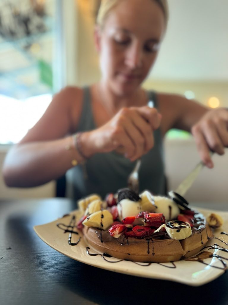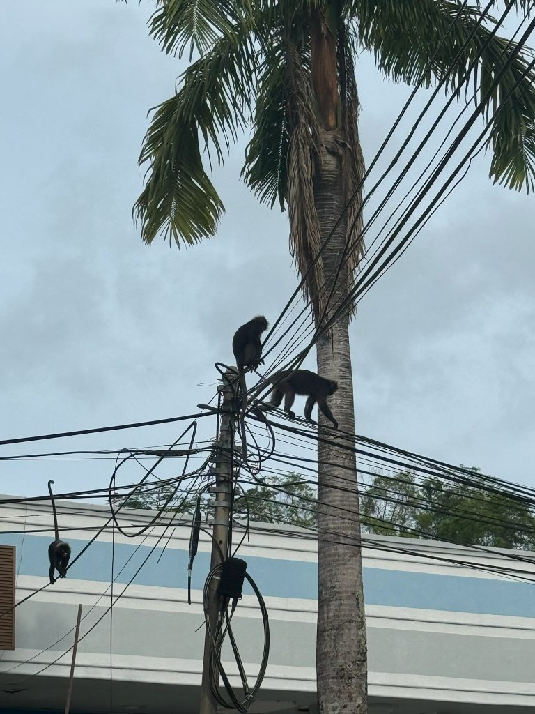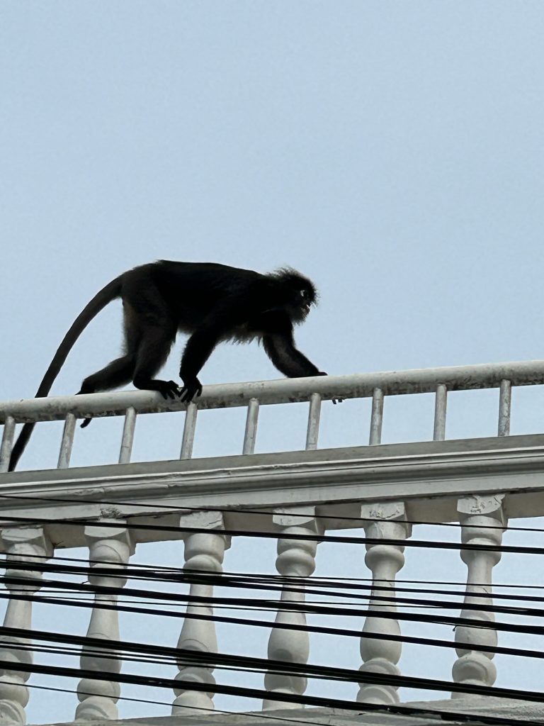 Zum Frühstück kamen wieder die Brillenlanguren vorbei. Heute wollten wir uns wieder bei unserem Kumpel einen Roller mieten und den Rest der Insel erkunden. Es ging los nach Osten an der Küste entlang Richtung Fähranleger. An der Straße sahen wir viele Makaken („Standard“-Affen“.