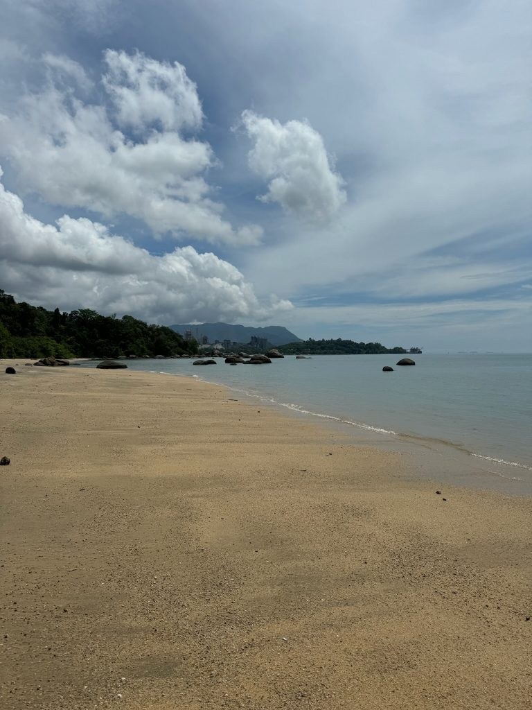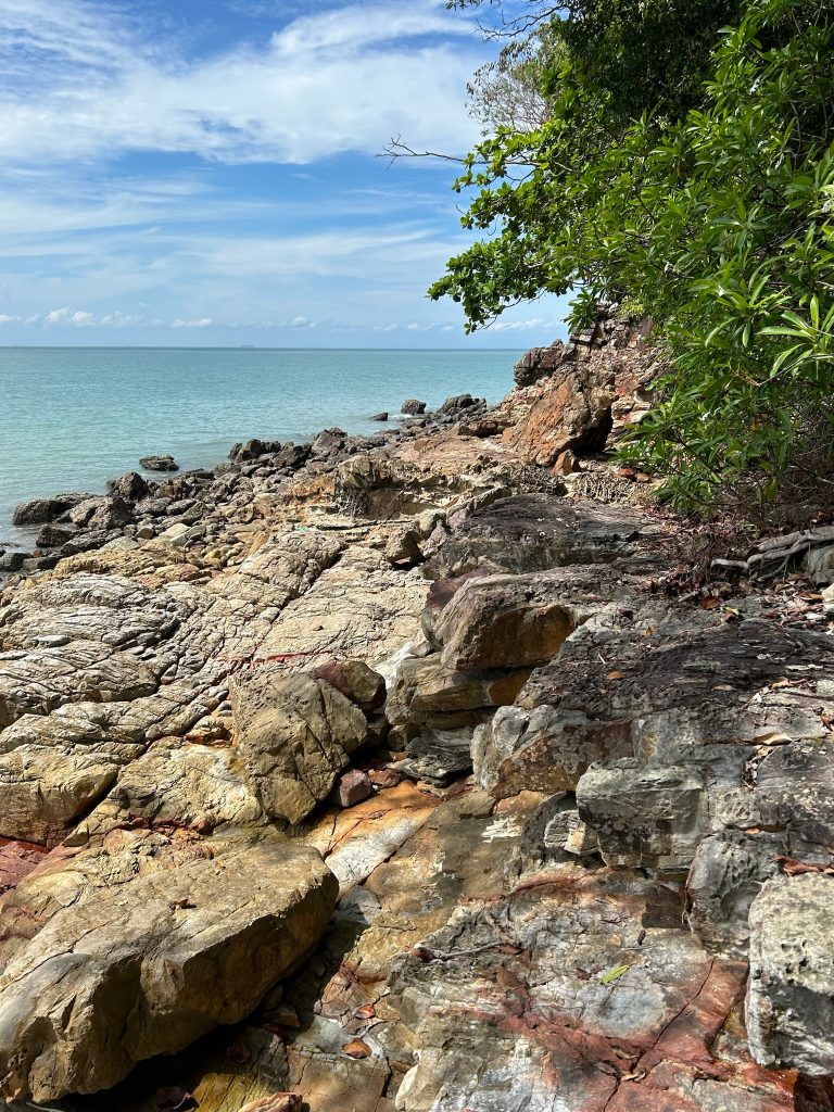 Heute hatten wir Glück mit dem Wetter und deshalb wollten wir nochmal an den abgelegenen Tengkorak Strand / Sandy Skulls Beach. Auf dem Weg dorthin hielten wir noch am Wild Beach. Beim Tengkorak Beach war einiges los, wir suchten uns einen Platz unter einem Baum im Schatten aber als wir uns gerade ausbreiten und umziehen wollten, merkte Marco, dass wir von Sandfliegen attackiert wurden. Auf die hatten wir gar keinen Bock! Nicht mal mit Anti-Mücken-Spray im feuchten Sand oder auf den Felsen am Rand der Bucht war man vor ihnen sicher, also entschieden wir, wieder zu fahren.