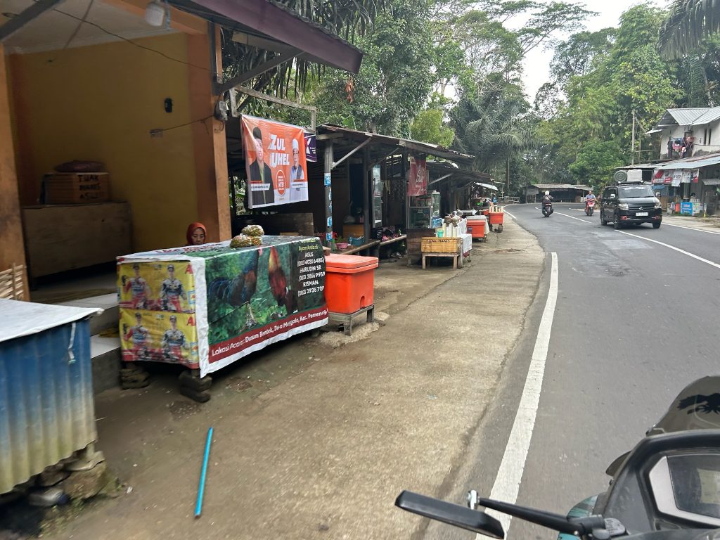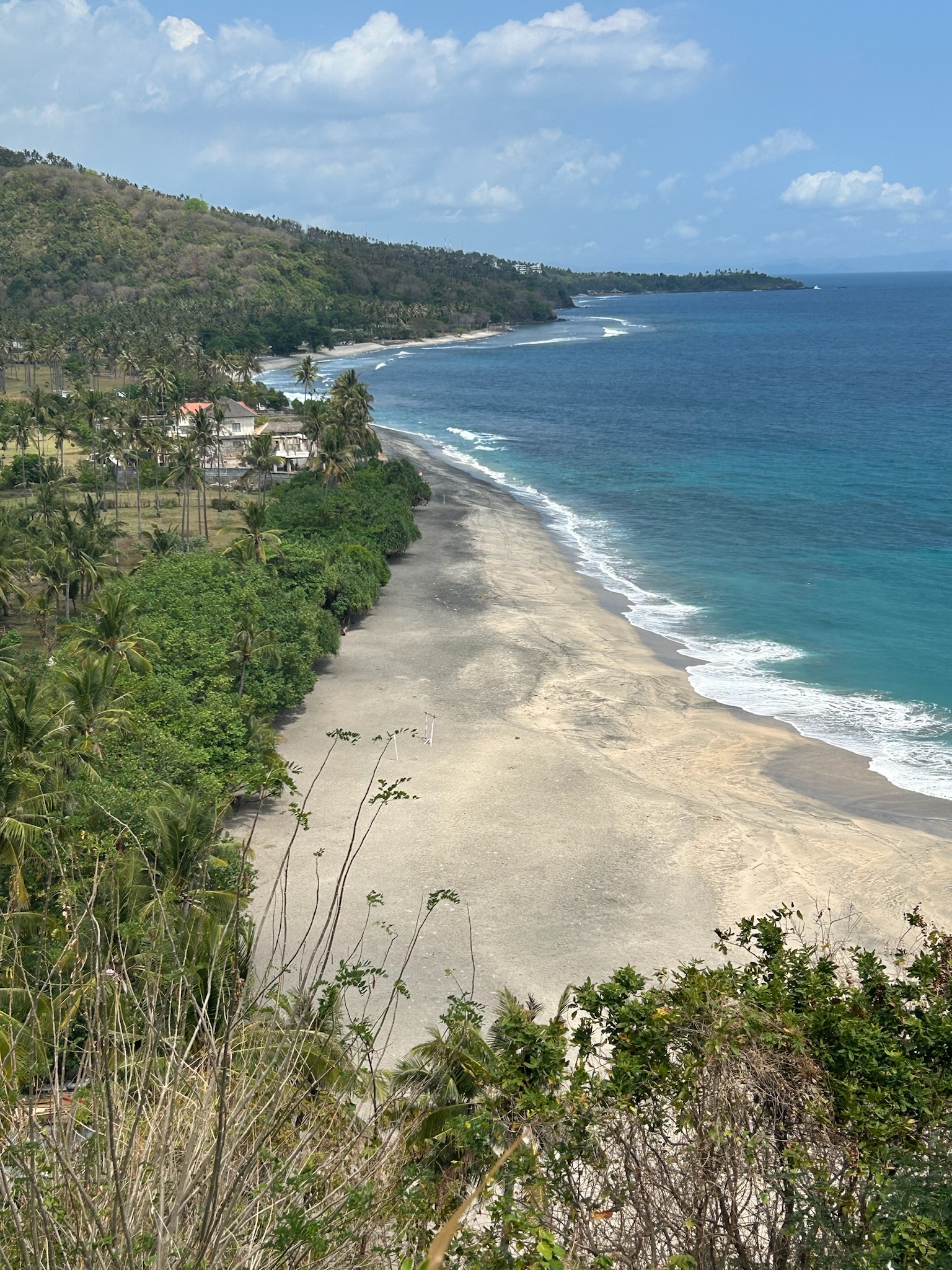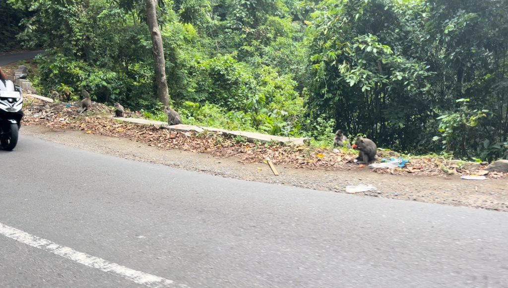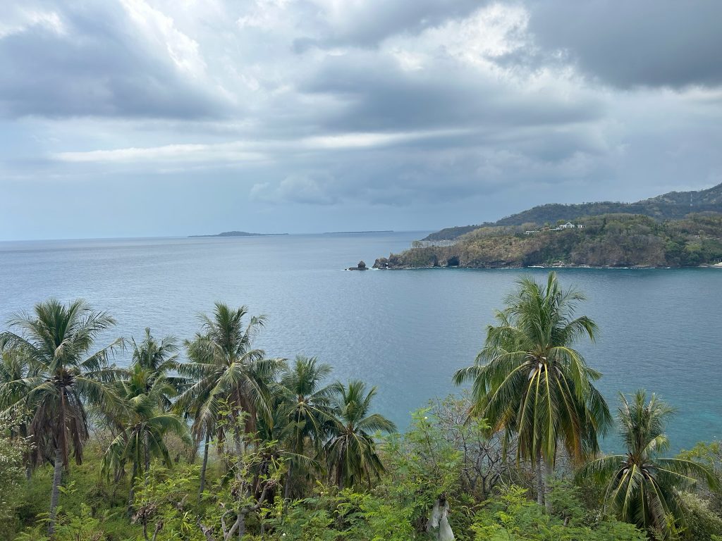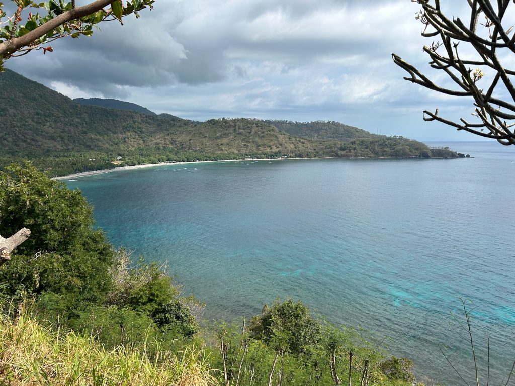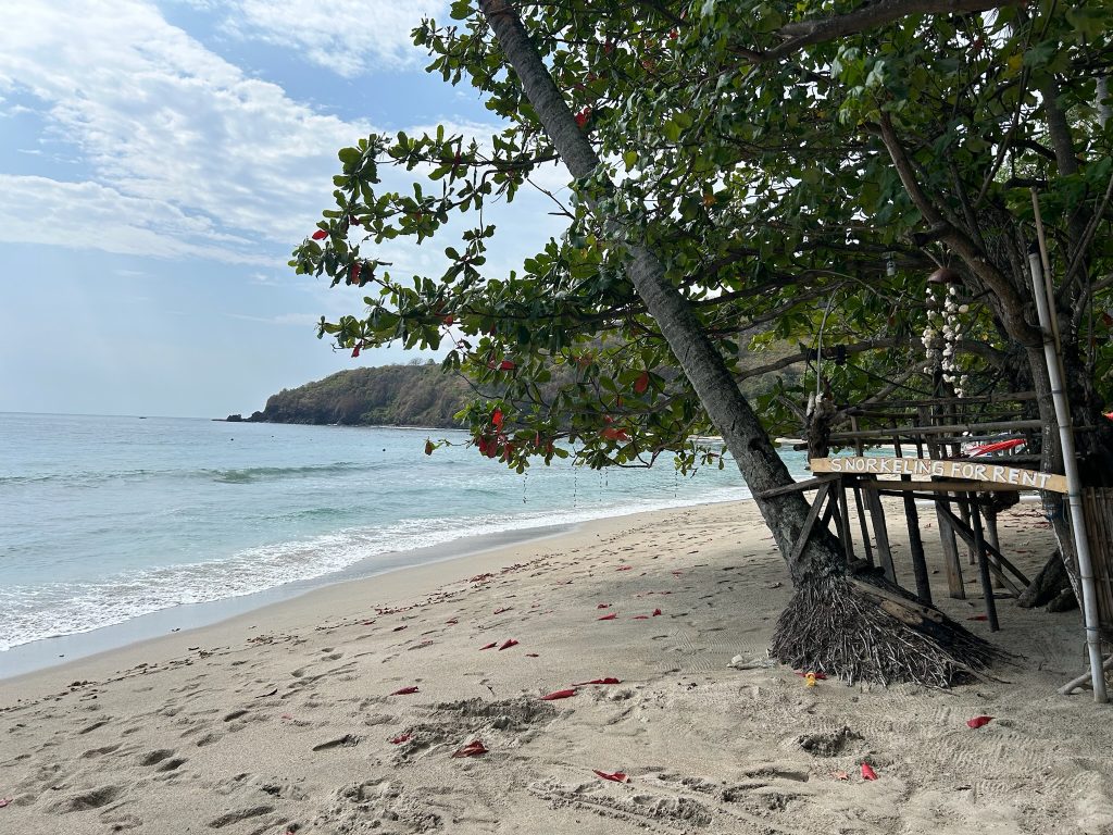 Die Fahrt ging durch den grünen Wald über die Berge nach Süden bis zur Hauptstadt Mataram. Die Straße war gut ausgebaut und es saßen viele Äffchen am Straßenrand. Wir fuhren ein Stück durch die Stadt durch bis wir zur Küstenstraße kamen. Dann fuhren wir die Straße an der Küste entlang zurück nach Pamenang. In vielen Kurven hatte man eine gute Sicht auf das Meer und wir hielten an einigen Aussichtspunkten und zwei Buchten. Hier sind super viele Resorts an der Küste gebaut, aber einige auch schon verlassen und heruntergekommen. An einem Strand setzten wir uns in ein kleines Lokal für einen Mittagssnack. Kurz danach fing es an zu regnen – gutes Timing. Die Betreiber waren super nett und kommunikativ.