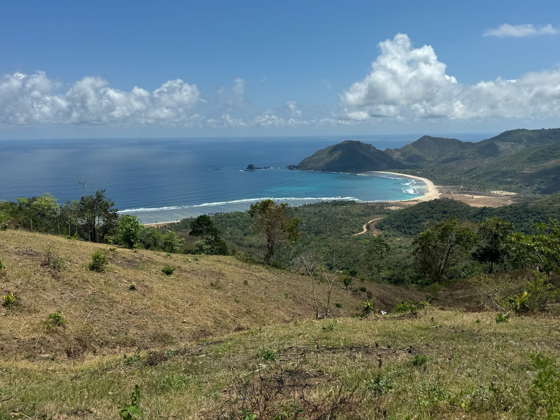 Um 9 Uhr setzten wir uns in das Hotel-Restaurant und bestellten unser Frühstück, welches wir auswählen konnten. Danach gingen wir im Meer schwimmen, morgens soll man hier Schildkröten sehen, aber wir waren wohl schon zu spät. Auch hier ist das Wasser sehr flach und abends Ebbe. Nachdem wir uns fertig gemacht hatten, fuhren wir los ca. 20 Minuten nach Süden an die Küste. Hier wollten wir eigentlich an den Strand einer Bucht, aber wir wurden aufgehalten, weil sie gesperrt war. Schade, also fuhren wir die Küstenstraße über die Berge weiter nach Osten und konnten nur von oben einen Blick in die riesige, schöne Bucht werfen. Später erfuhren wir, dass in der Bucht ein Hotel entsteht und daher die Zufahrt gesperrt ist.