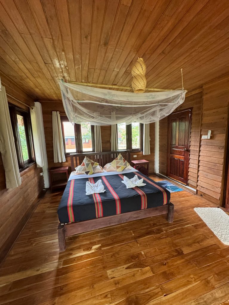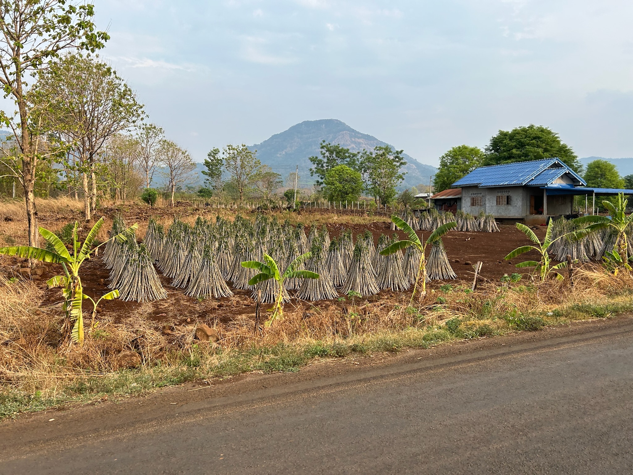Mir ging’s heute immer noch nicht gut, sodass wir nachfragten, ob wir ein paar Stunden länger als die Checkout-Zeit bleiben können, was kein Problem war. Wir bekamen unser inklusives Frühstück auf unser Zimmer, was Marco für mich mitessen musste. Der Gastgeber war super lieb, fragte nach meinem Empfinden und ob ich Medikamente brauche. Danach buchte Marco ein Hotel auf Don Det. Gegen 15 Uhr fühlte ich mich endlich etwas besser, sodass wir auscheckten, um die Rückfahrt anzutreten. Die drei Wasserfälle, die wir uns hier anschauen wollten, mussten wir leider ausfallen lassen. Die Fahrt dauerte ca. 2,5 Stunden und führte zwischen vielen braunen Feldern, wo vor allem Süßkartoffeln angebaut werden, lang.