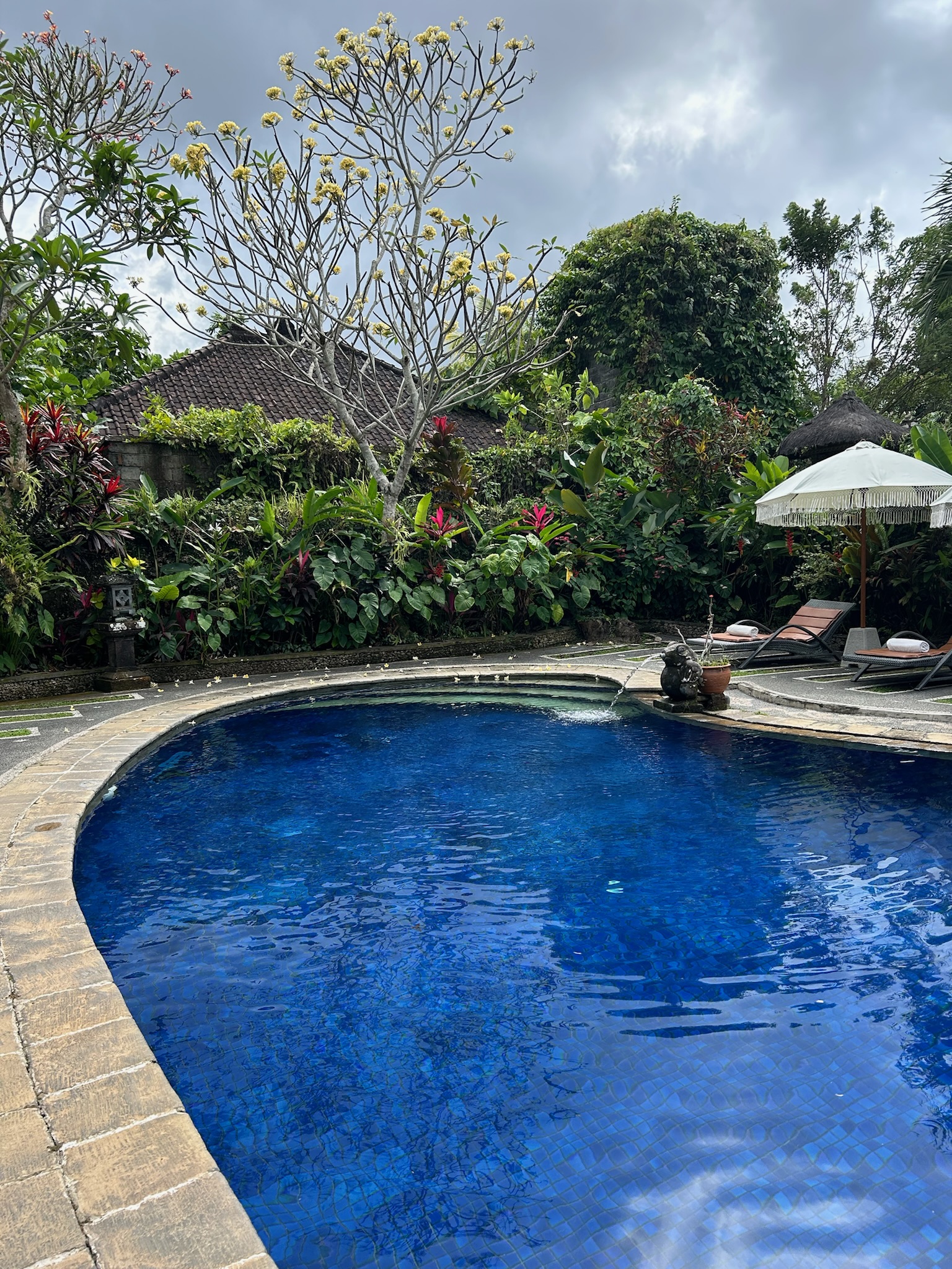 Nach dem Ausschlafen machten wir uns fertig und gingen frühstücken. Wir hatten ein schnuckeliges Hotel mit Pool in einer hippen, grünen Straße mit vielen Cafés und Restaurants – nah am Zentrum von Ubud. Wir merkten schon den anderen Vibe von Bali und dass hier deutlich mehr Touris und Backpacker unterwegs sind. Da es mir nicht gut ging, beschlossen wir, heute einen ruhigen Tag im Hotel zu machen und unseren Aufenthalt um einen Tag zu verlängern. Also legten wir uns an den Pool. Es war ziemlich bedeckt heute und ab 17 Uhr wurde es fast frisch, sodass wir auf’s Zimmer gingen. Später suchten wir uns ein Restaurant zum Abendessen aus. Währenddessen hat es sogar noch stark angefangen zu regnen. Danach hatte Marco noch einen geschäftlichen Call.