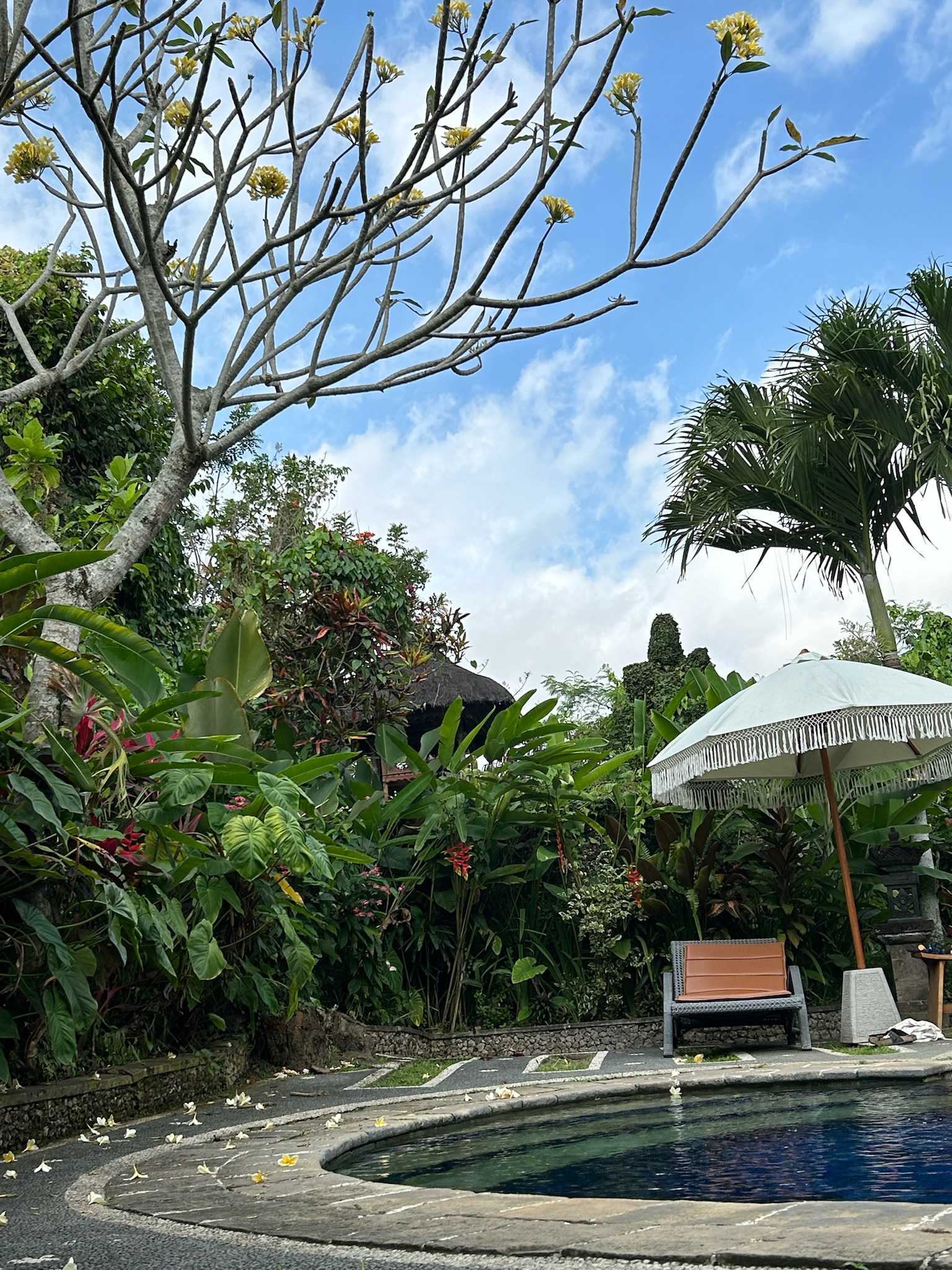 Nach dem Ausschlafen machten wir uns fertig und gingen frühstücken. Wir hatten ein schnuckeliges Hotel mit Pool in einer hippen, grünen Straße mit vielen Cafés und Restaurants – nah am Zentrum von Ubud. Wir merkten schon den anderen Vibe von Bali und dass hier deutlich mehr Touris und Backpacker unterwegs sind. Da es mir nicht gut ging, beschlossen wir, heute einen ruhigen Tag im Hotel zu machen und unseren Aufenthalt um einen Tag zu verlängern. Also legten wir uns an den Pool. Es war ziemlich bedeckt heute und ab 17 Uhr wurde es fast frisch, sodass wir auf’s Zimmer gingen. Später suchten wir uns ein Restaurant zum Abendessen aus. Währenddessen hat es sogar noch stark angefangen zu regnen. Danach hatte Marco noch einen geschäftlichen Call.