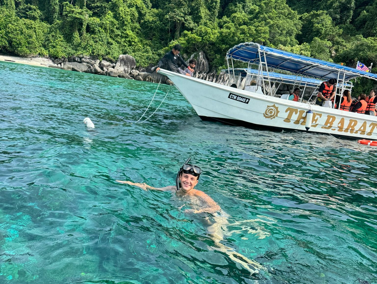 Unsere sechsstündige Schnorchel-Tour (24€ p.P.) startete um 9:30 Uhr. Als wir aus dem Haus zum Pier gingen, fing es an zu regnen und zu stürmen. Wir stiegen in unser Boot und holten noch andere Teilnehmer am anderen Ende der Bucht ab, sodass wir insgesamt neun Leute mit zwei Bootsführern waren. Dann ging die Fahrt mit dem Speedboot los nach Norden an der Ostküste entlang. Das Boot donnerte hart über die Wellen und wir fuhren dem schlechten Wetter davon. Wir fuhren an der schönen, steinigen Küste mit dem grünen Regenwald entlang. Das Ziel war die Tulai Island / Coral Island, nordwestlich von Tioman gelegen. Hier hatten wir drei Schnorchel-Spots. Die Bootsführer hatten extra Toastbrot mitgebracht, mit dem wir die Fische füttern konnten, die in Schwärmen ankamen. Wir sahen viele bunte, große und kleine Fische.
