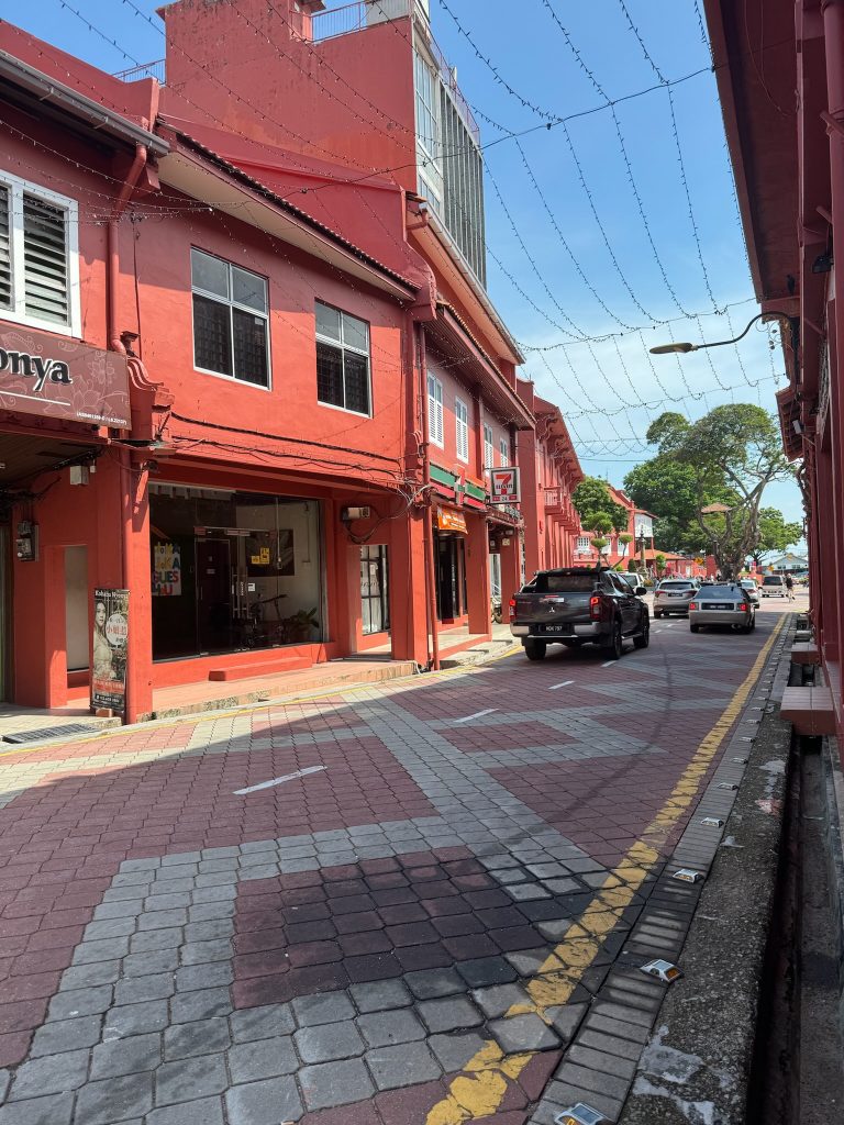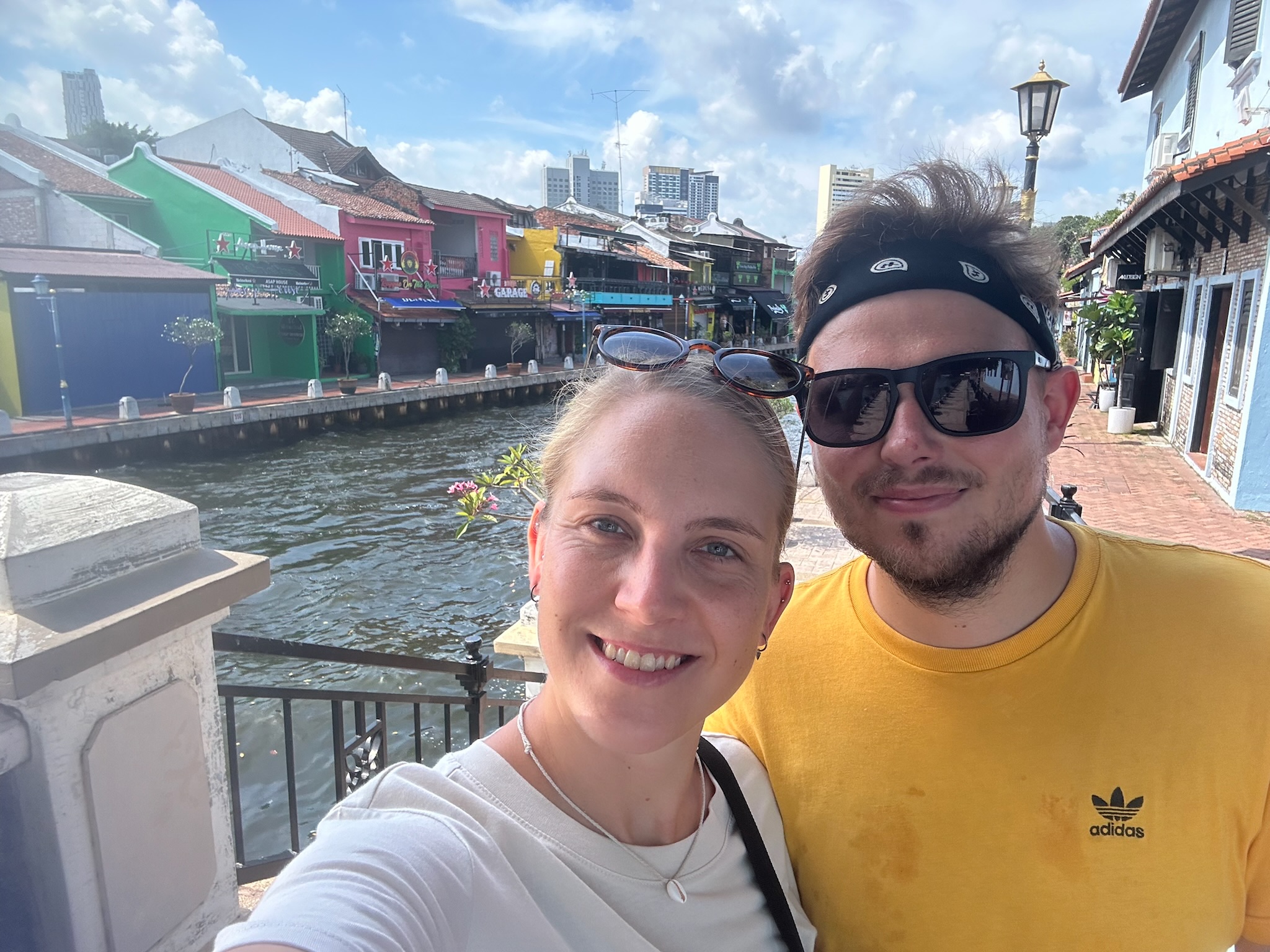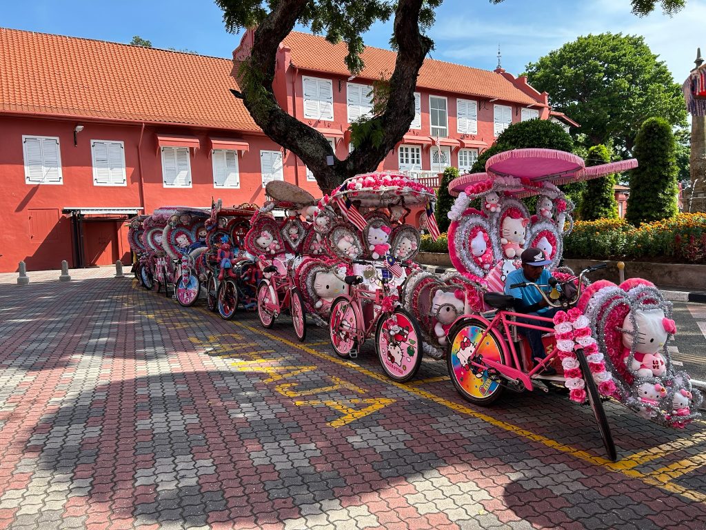 Das Frühstück hatten wir inklusive. Dafür mussten wir aber zu dem 3 Sterne-Hotel in dem Einkaufszentrum gegenüber laufen. Das Buffet war mega, es war riesig und hatte viel Auswahl, auch für den westlichen Geschmack. Nachdem wir uns hier den Magen vollgehauen hatten, gingen wir zurück ins Zimmer, um die nächsten Tage zu organisieren. Wir buchten einen Bus nach Mersing, an der Ostküste. Von hier wollten wir auf die Tioman Island. Wir buchten auch die Fähre und eine Unterkunft. Am frühen Nachmittag machten wir uns auf den Weg in die Stadt. Wir gingen den Riverwalk am Kanal entlang bis zum Dutch Square bzw. Roten Platz mit Rathaus, Uhrenturm und Kirche aus der Zeit der niederländischen Besetzung. Hier parkten auch Fahrrad-Rikschas von der ganz klassischen Sorte 😀