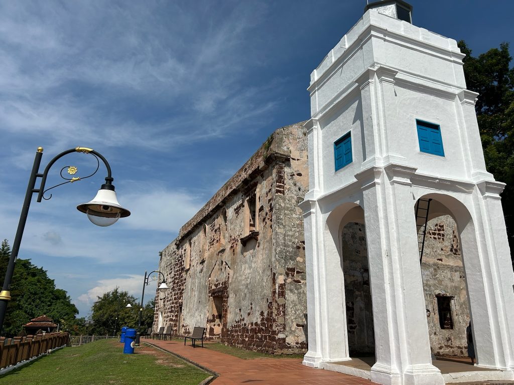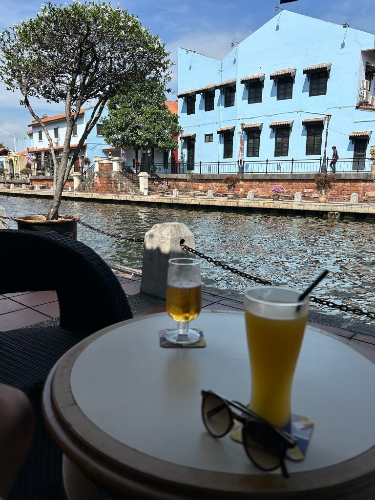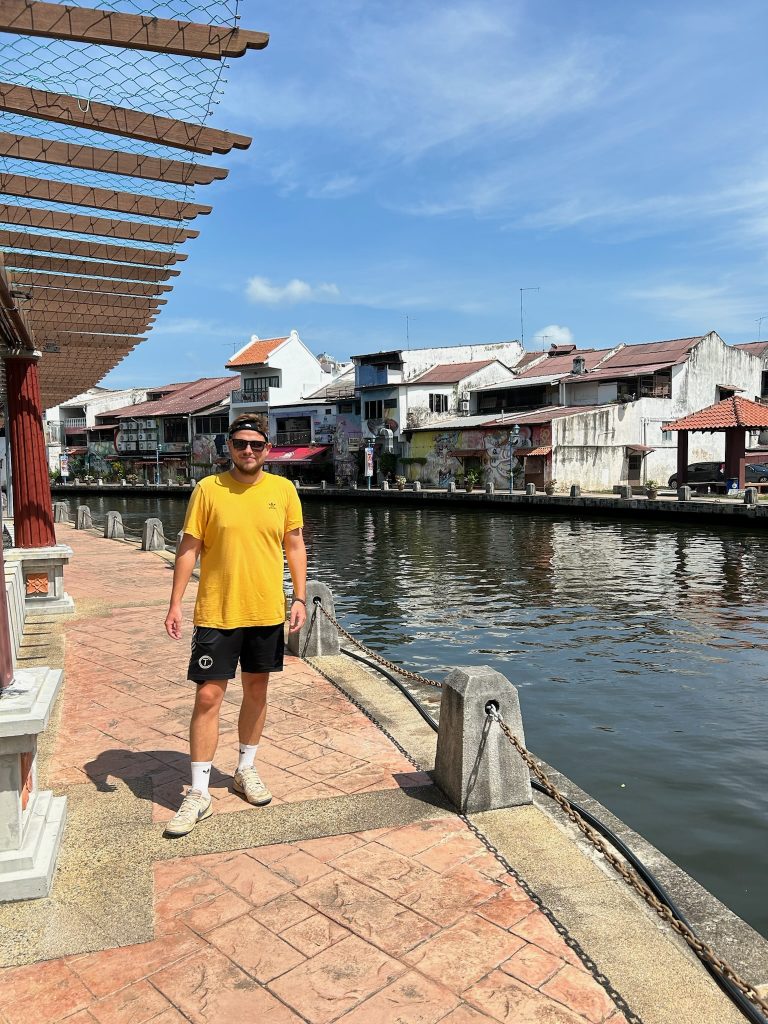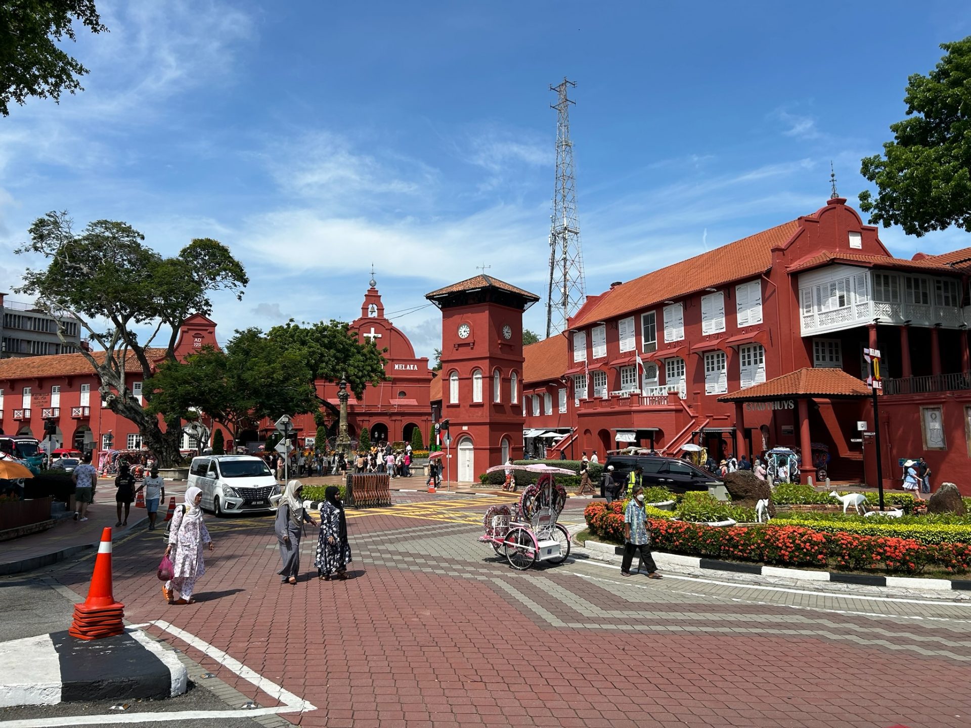Das Frühstück hatten wir inklusive. Dafür mussten wir aber zu dem 3 Sterne-Hotel in dem Einkaufszentrum gegenüber laufen. Das Buffet war mega, es war riesig und hatte viel Auswahl, auch für den westlichen Geschmack. Nachdem wir uns hier den Magen vollgehauen hatten, gingen wir zurück ins Zimmer, um die nächsten Tage zu organisieren. Wir buchten einen Bus nach Mersing, an der Ostküste. Von hier wollten wir auf die Tioman Island. Wir buchten auch die Fähre und eine Unterkunft. Am frühen Nachmittag machten wir uns auf den Weg in die Stadt. Wir gingen den Riverwalk am Kanal entlang bis zum Dutch Square bzw. Roten Platz mit Rathaus, Uhrenturm und Kirche aus der Zeit der niederländischen Besetzung. Hier parkten auch Fahrrad-Rikschas von der ganz klassischen Sorte 😀