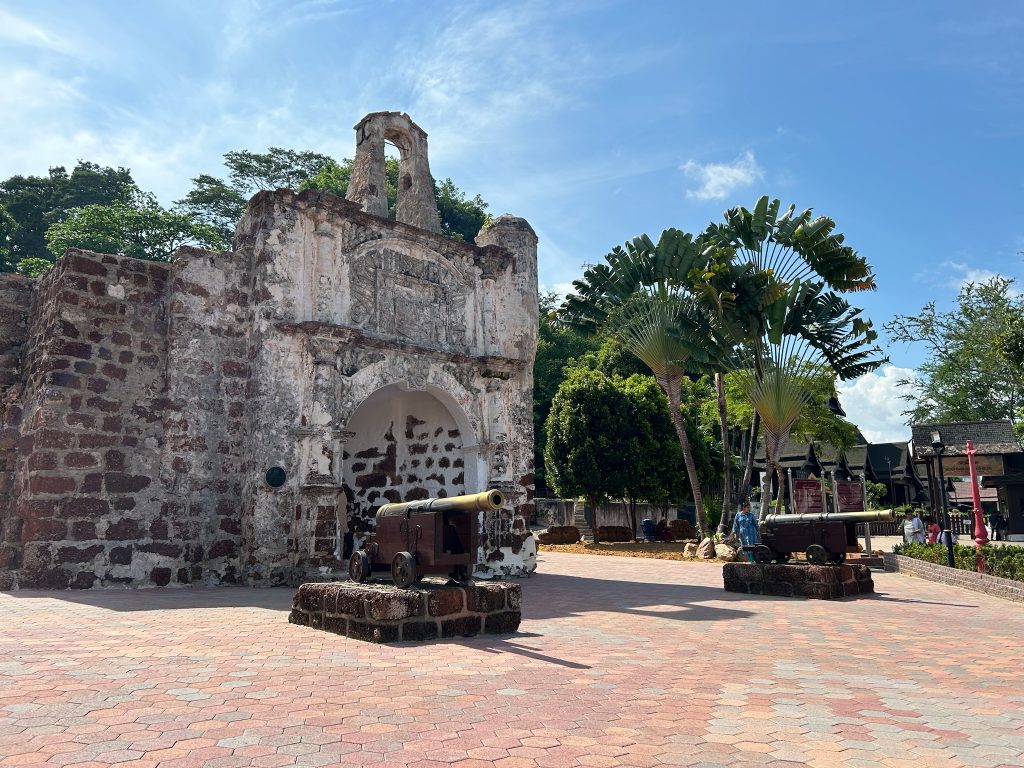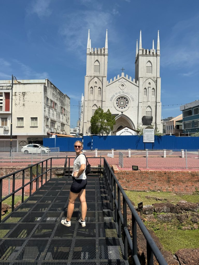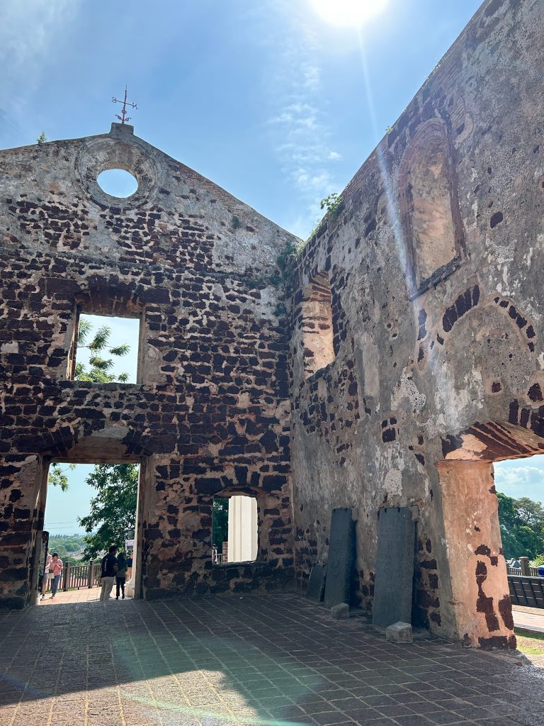 Damit Marco noch seinen Fuß schonen konnte, setzte er sich hier in eine Bar und ich erkundete alleine ein bisschen die Gegend. Hinter dem Platz war ein Hügel mit den Ruinen der St. Pauls Kirche drauf. Ich umrundete den Berg, kam an den Überresten der ehemaligen portugiesischen Festung vorbei und stieg auf den Hügel zur Kirche. Von hier aus konnte ich das Meer sehen. Auf der anderen Seite lief ich wieder zurück zu Marco und machte eine Pause in der Bar am Wasser. Danach liefen wir die Jonker Street entlang und setzten uns in ein Restaurant für unser Abendessen. Anschließend holten wir uns noch ein Eis und liefen nocheinmal die Straße hoch und runter, wo sie dabei waren, für den Nightmarket aufzubauen. Der Markt ist ganz nett, aber auch nichts Außergewöhnliches. Danach liefen wir zurück zum Hotel und holten uns im Supermarkt noch Wasser und Snacks für die Fahrt am nächsten Tag.