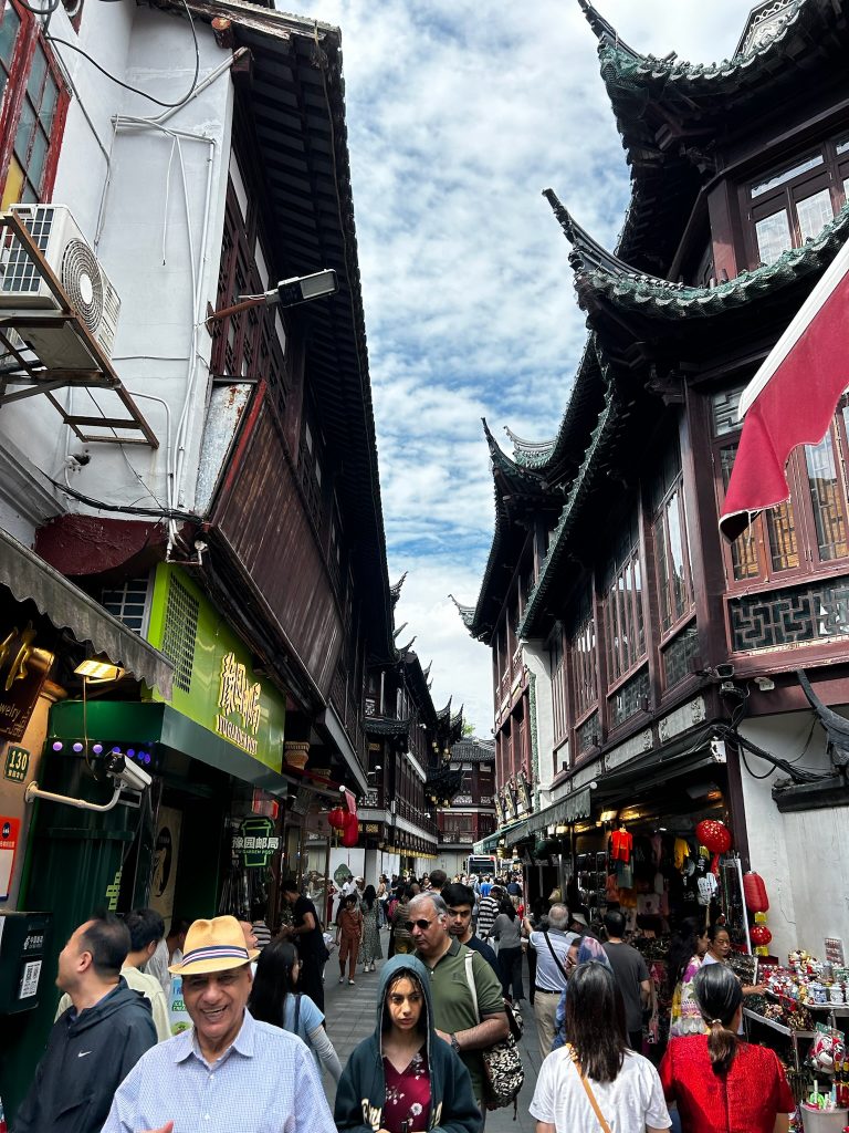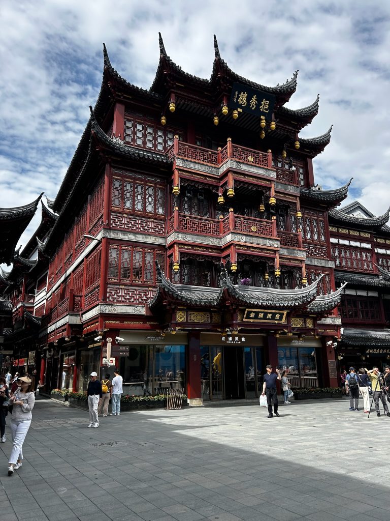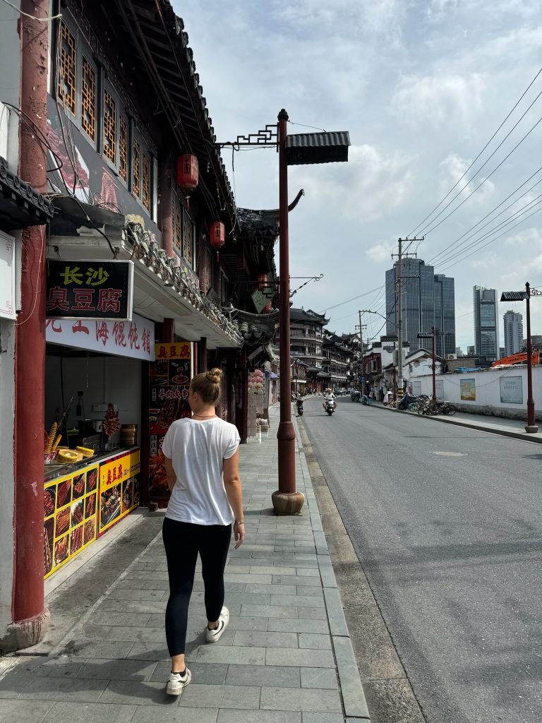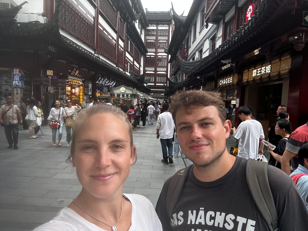 Wir liefen um 10 Uhr los Richtung Yuyuan Garten und Altstadt. Hier hatte ich im Internet ein Café gesehen, wo es Bagels gibt. Nach 20 Minuten Fußweg kamen wir an einem riesigen, offenen Shoppingplaza an, das auf alt gemacht war. Hier war super viel los. Das Café haben wir leider nicht gefunden, auch kein anderes mit „normalem“ Frühstück. Also gab‘s erst mal eine Art Ei-Blätterteig-Tasche. Danach liefen wir weiter durch das Shopping-Areal zu Starbucks, hier gab‘s wenigstens Baguette und Croissant für uns zum Frühstück.
