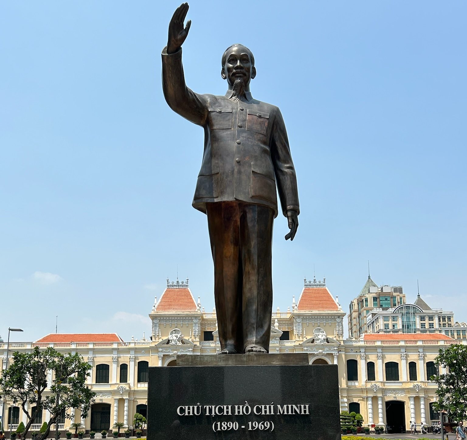 Heute steht endlich Sightseeing auf dem Programm. Nach dem Aufstehen kaufte ich in den Supermärkten unten für unser Frühstück ein, welches wir uns in unserer Küche machen wollten. Gegen 11 Uhr fuhren wir mit einem Taxi per Grab in die Stadt und klapperten die Sehenswürdigkeiten von Ho-Chi-Minh-Stadt (hier sagt man übrigens gerne mal HCMC) ab, die alle fußläufig von einander entfernt lagen. Der Taxifahrer sollte uns beim Wiedervereinigungspalast raus lassen. Von hier liefen wir zur Notre Dame, die leider im Gerüst lag. Gegenüber lag das alte Gebäude des Postoffice. Wir liefen weiter zur City Hall, mit einem Denkmal von Chu Tich Ho-Chi-Minh (Namensgeber von der Stadt) davor. Wir liefen am Opernhaus vorbei Richtung Fluss. Auf dem Weg kamen wir an einer Wechselstube vorbei, bei der wir all unsere restlichen Scheine an Baht, Riel und Dollar zu einem ziemlich guten Wechselkurs in Dong wechselten (der Wechselkurs war verdächtig gut – wir hatten parallel Google auf zur Berechnung des Kurses – aber es hat alles geklappt). Am Fluss entlang liefen wir zurück zu unserer Unterkunft.