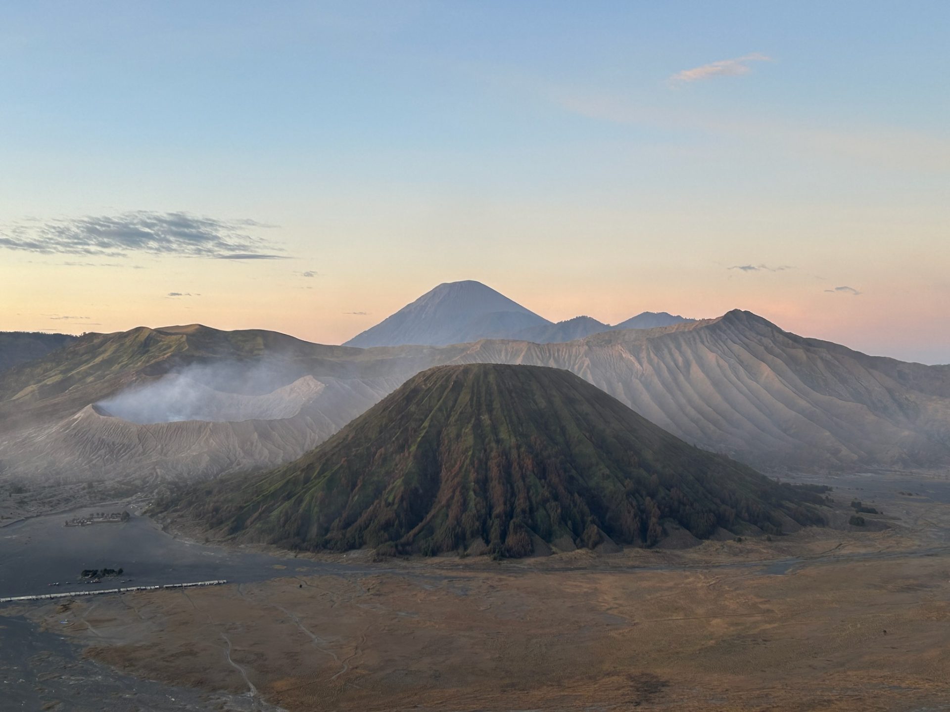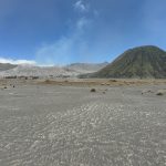 Nachdem die Sonne aufgegangen war, wurde es schnell wärmer. Wir wollten noch die Strecke zum King Kong-Viewpoint hochlaufen, die über einen staubigen Trampelpfad ging. Viele Touristen kamen uns schon entgegen. Hier war man auf 2.700 m Höhe und hatte noch einen besseren Blick von oben auf die riesige Vulkanlandschaft. Wir gingen noch ein Stück weiter bis zu einem kleinen Lokal. Hier gab es um 7 Uhr morgens eine Instant Nudelsuppe mit einem Ei zum Frühstück mit Aussicht auf den Bromo. Im Hintergrund konnte man auch den Vulkan Semeru sehen (höchster Vulkan Javas mit rund 3.700 m Höhe), der auch aktiv ist und ab und zu ein Rauchwölkchen ausstoß.