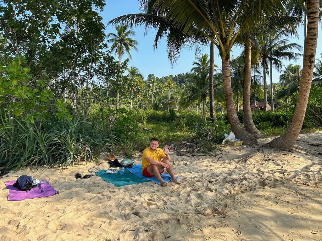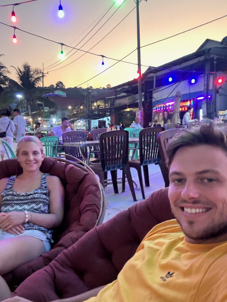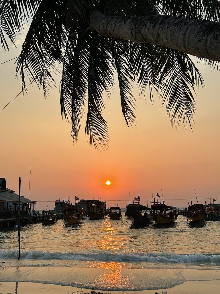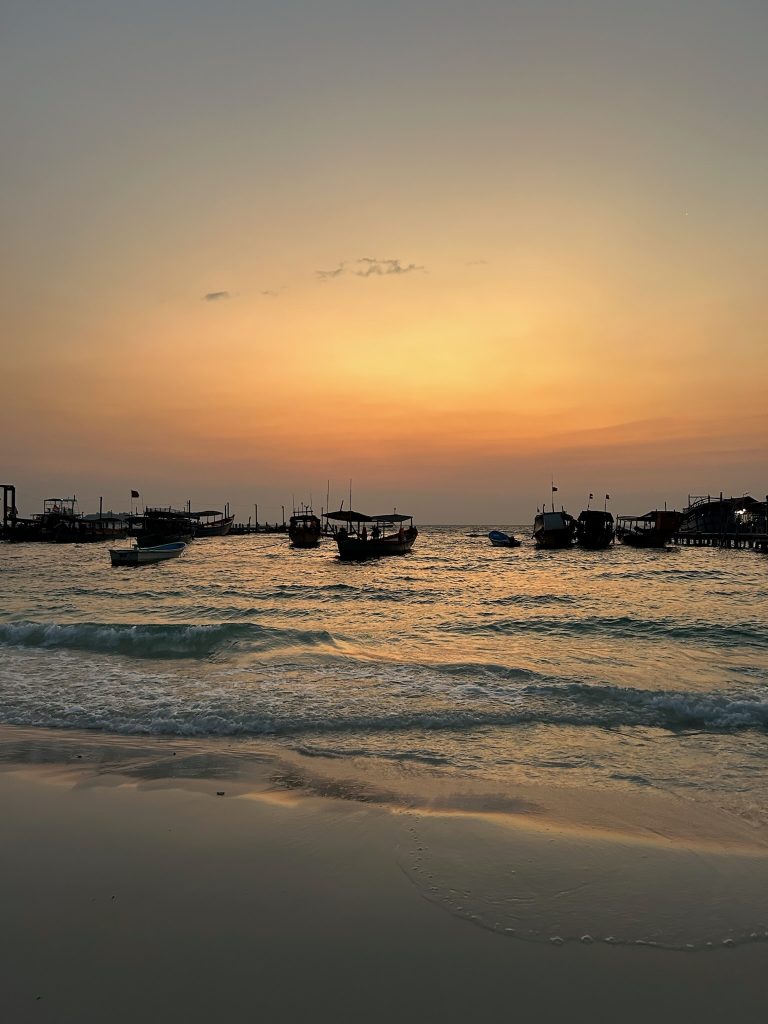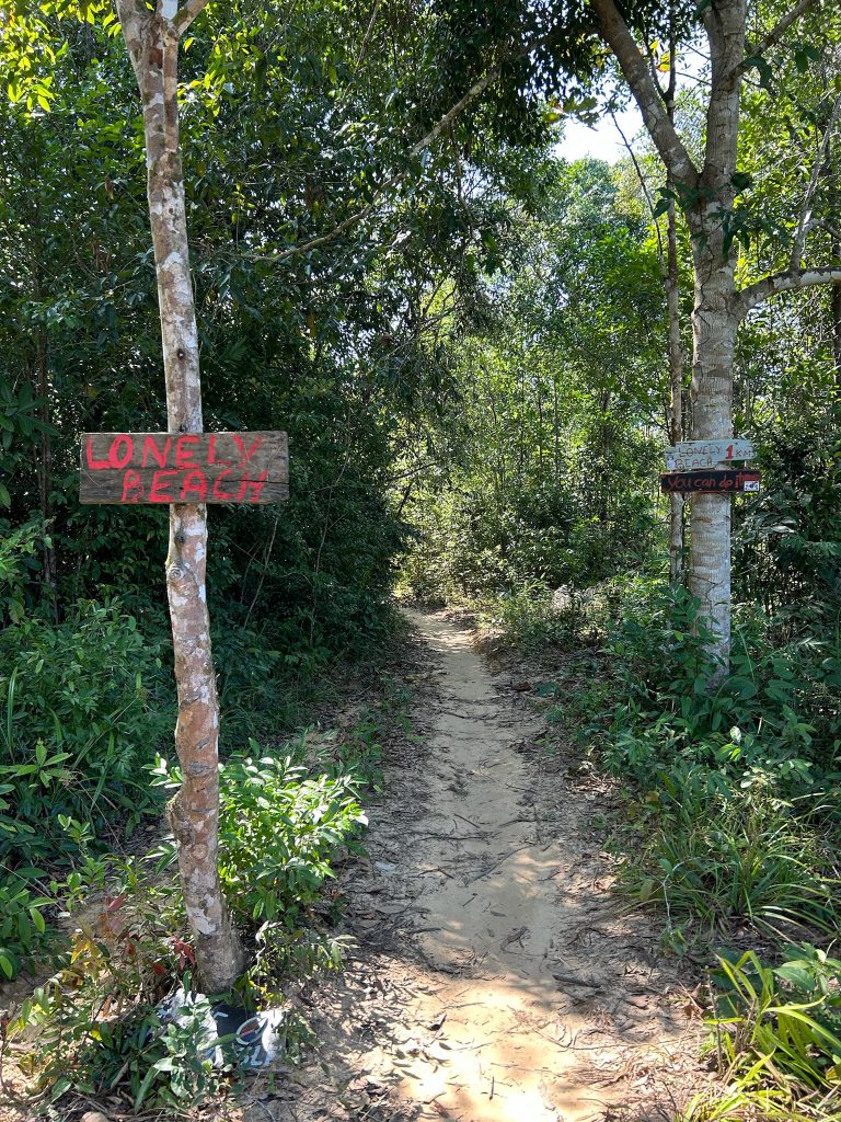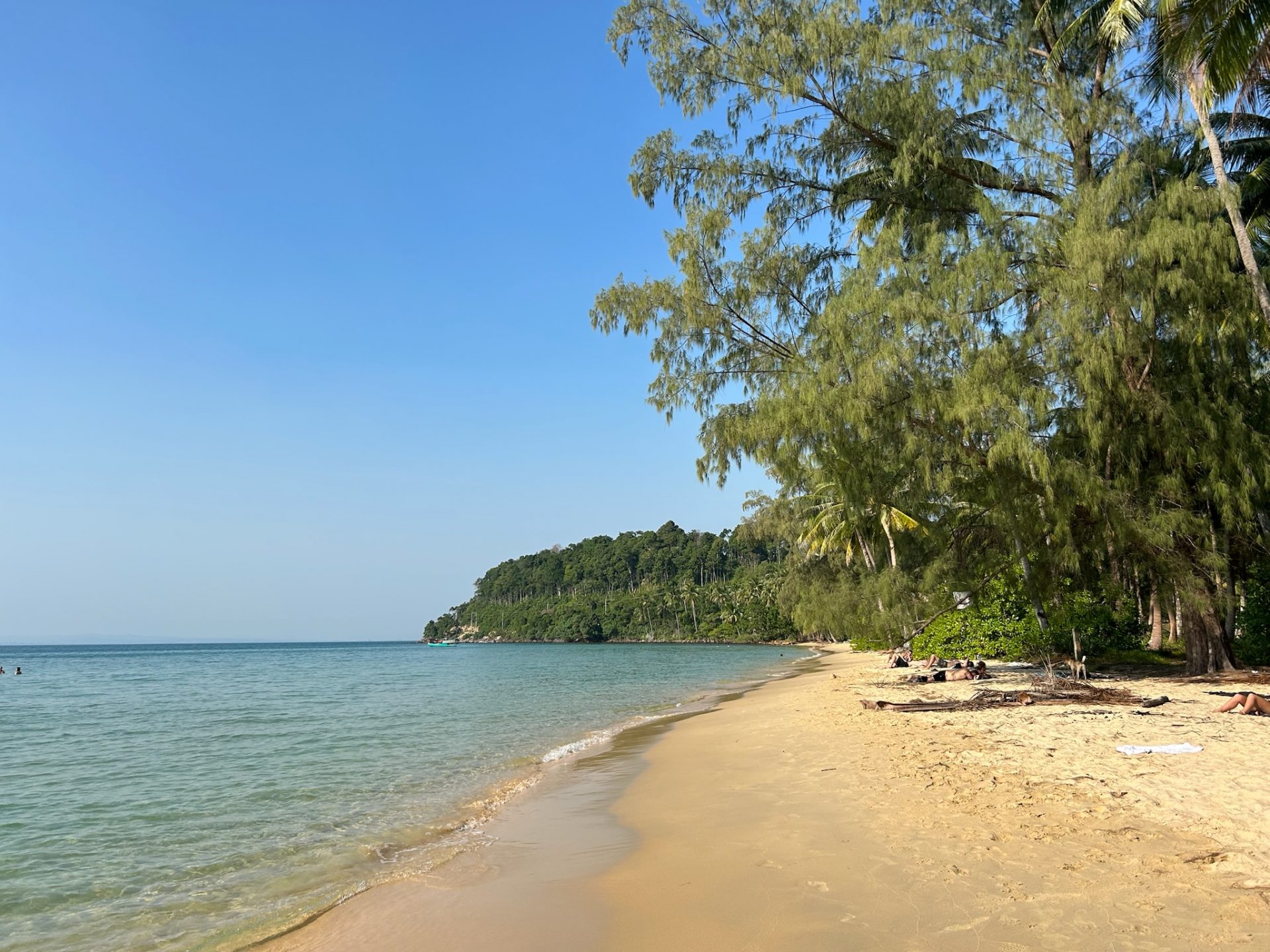 Am frühen Nachmittag fuhren wir los an die nördlichste Küste zum Lonely Beach. Nach der 50 minütigen Fahrt parkten wir an einem Parkplatz und mussten noch ca. 20 Minuten einen Pfad zum Strand runter laufen. Theoretisch hätten wir die Strecke auch fahren können, wie einige andere auch. Naja. Der Strand war wirklich etwas einsam, nicht viele Menschen hier und nur ein Gasthaus mit Restaurant versteckt im Wald. Über WhatsApp klärten wir uns einen Bus zu unserer nächsten Destination Battambang, dessen Nummer wir von einem Plakat haben. Wir hatten auch in unserem Hotel nachgefragt aber dieser erschien uns als beste Alternative. Wir hüpften ins warme, klare Wasser und legten uns kurz an den Strand. Aber da ich wieder ein paar Sandfliegen sichtete, sind wir lieber geflüchtet. Also setzten wir uns in das Restaurant und aßen einen Obstsalat mit Getränk als Mittagssnack.
