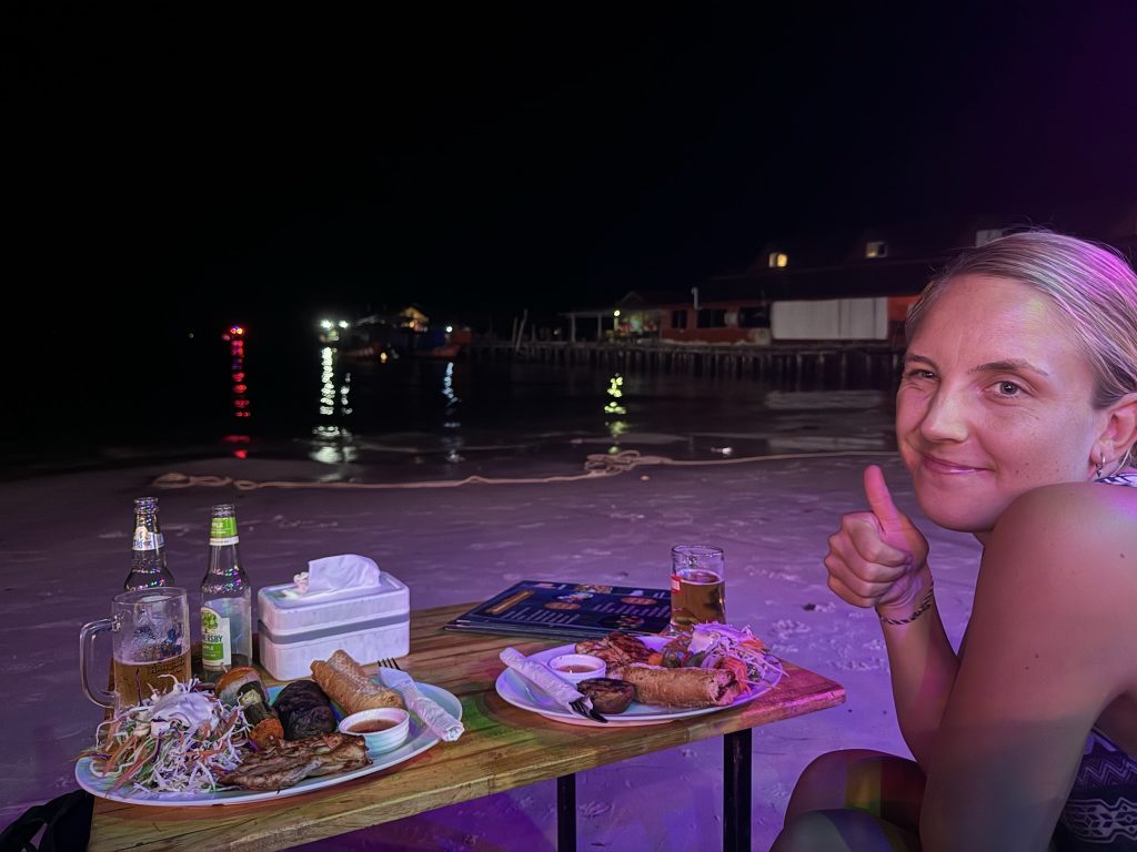 Gegen 17 Uhr machten wir uns dann auf den Rückweg. Wir tankten den Roller voll und setzten uns in ein Strandlokal. Heute gab es mal ein BBQ, welches viele Restaurants hier anbieten. An den Fisch haben wir uns aber nicht rangetraut.