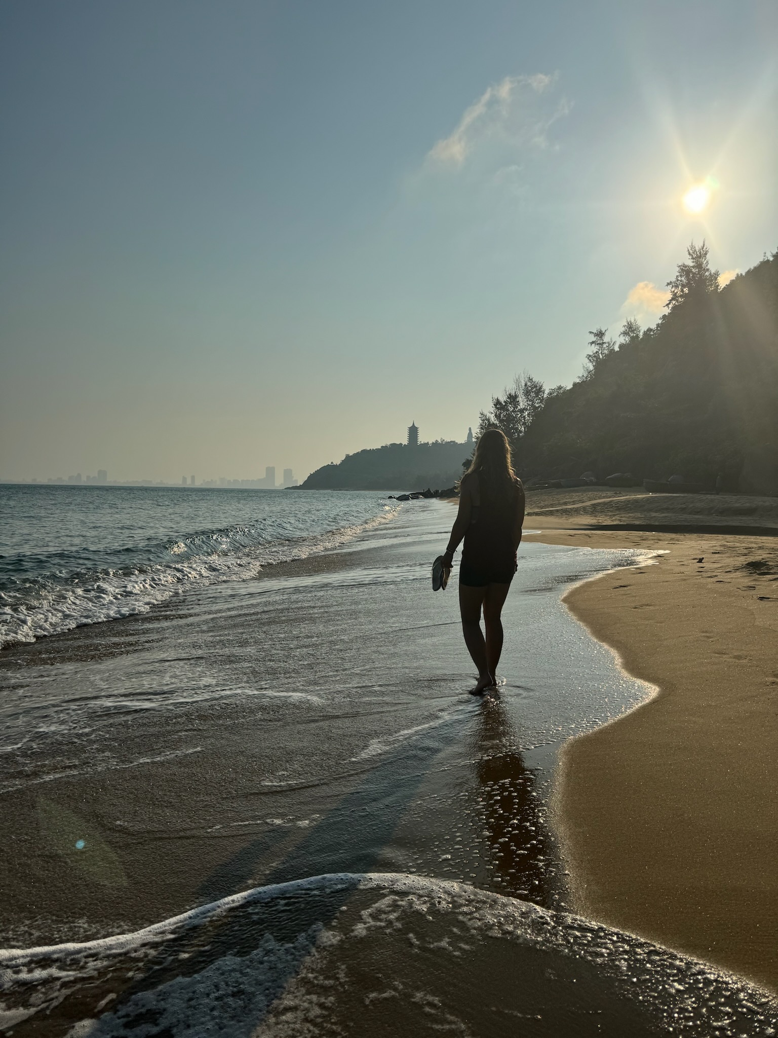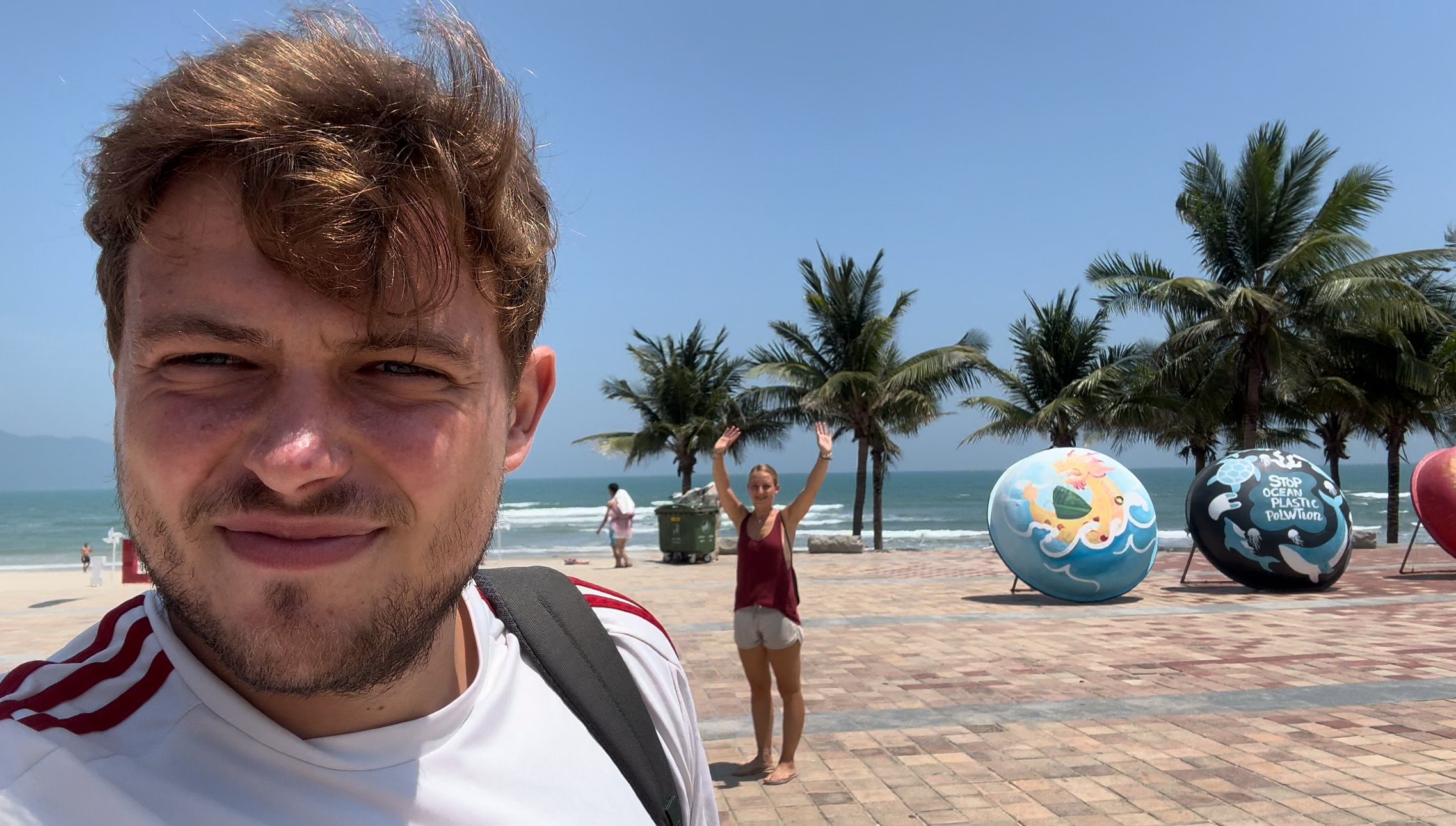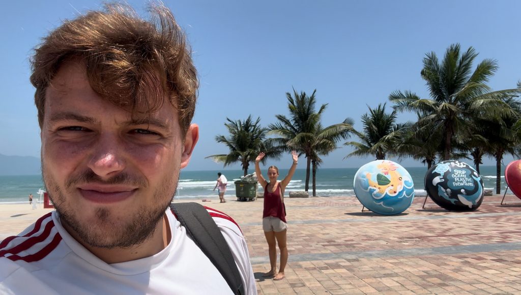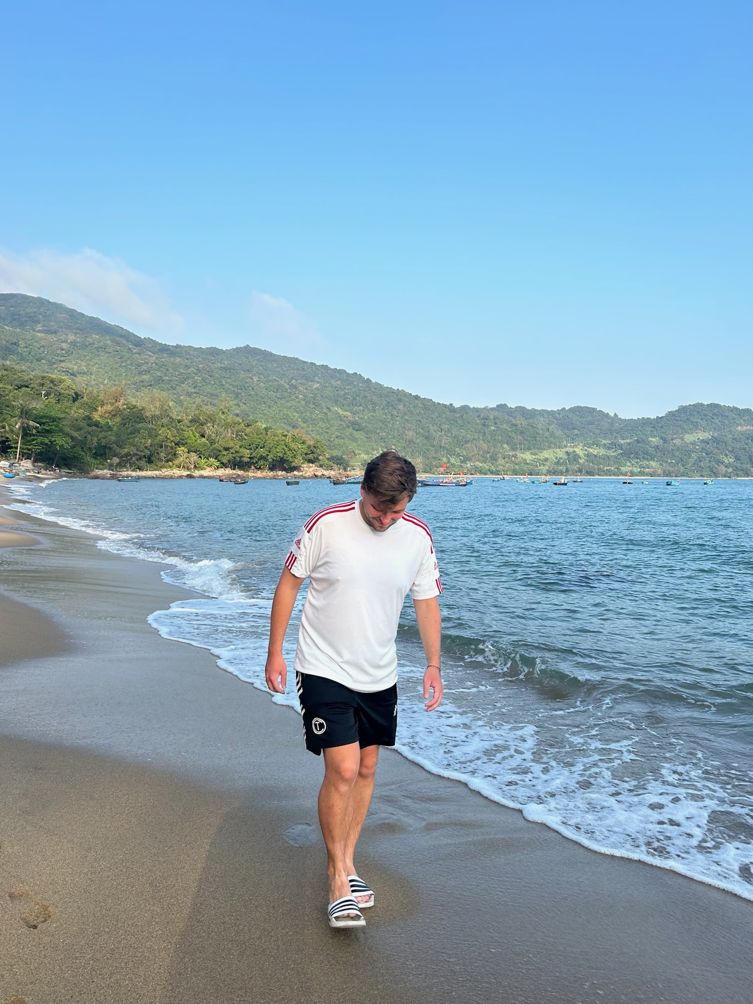 Nach einer kurzen Nacht sind wir um 8 Uhr aufgestanden, weil wir das Frühstücksbuffet bis 9 Uhr probieren wollten – es war wie erwartet (nicht so gut). Danach chillten wir kurz auf dem Zimmer bis wir an den Strand gingen. Hier ist die Strandpromenade wie in Nha Trang – nur weniger eng bebaut und der Sand ist weißer und feiner. Ich legte mich unter eine Palme in den Sand, während Marco joggen ging. Zwischendurch holten wir uns ein Banh Mi, Eiskaffee und Fruchtshake bei einer Strandbude. Gegen 15 Uhr liefen wir zu einer Rollervermietung in der Nähe und liehen uns einen Roller für drei Tage.