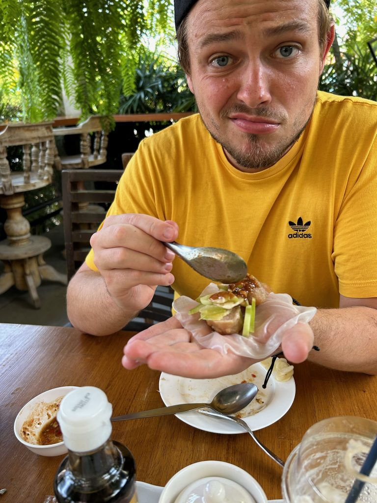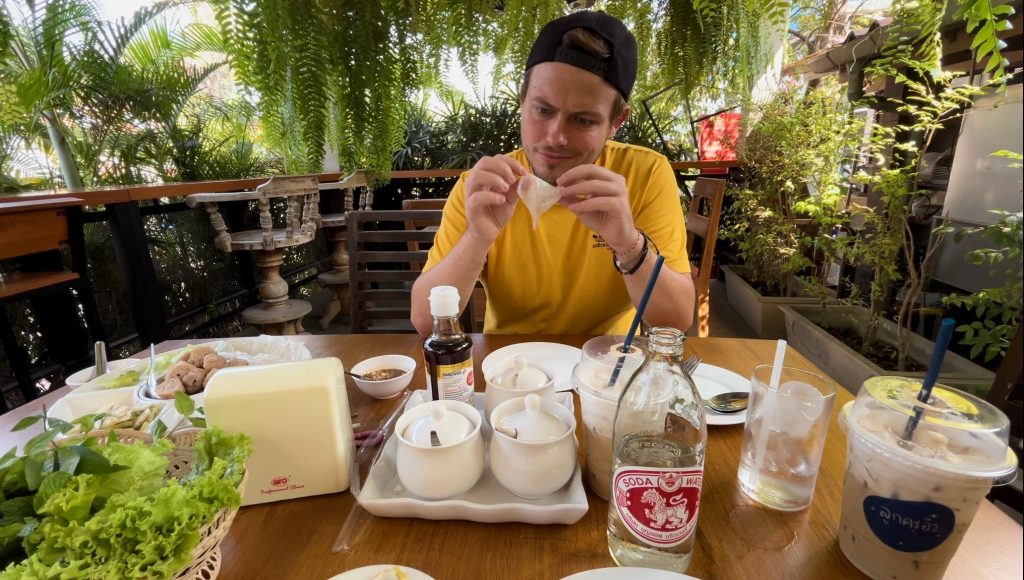 Den heutigen Tag wollten wir entspannt angehen. Nach dem Ausschlafen machten wir uns auf die Suche nach einem Frühstückslokal. Da wir bei Google Maps nichts passendes gefunden haben, liefen wir los und wollten unterwegs schauen. Hier in Sukhothai war das erste (und vorerst letzte) Mal, dass wir kein westliches Frühstück gefunden haben. Wir liefen zu einem Roller-Verleih und liehen uns einen Roller für einen Tag. Damit fuhren wir weiter in den Ort rein, auf der Suche nach einem passenden Lokal. Vergebens – in einem hübschen, wir glauben vietnamesischen Lokal gab es für mich Pad Thai (thailändisches Nudelgericht) mit Ei und für Marco eine asiatische Wrap-Platte (zum selber befüllen). Auf dem Rückweg hielten wir nochmal im Hotel, um unsere Sachen zu holen.