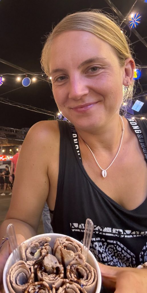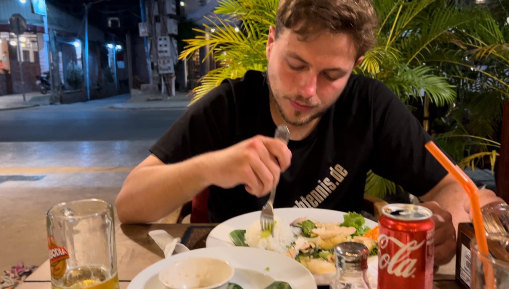 Zum Abendessen fuhren wir wieder in die Stadt, diesmal in ein einheimisches Lokal Abseits der Innenstadt. Für die leckere Icecream-Roll als Nachtisch fuhren wir nochmal zur Pubstreet. Hier kaufte ich mir noch ein T-Shirt von Angkor War als Andenken. Auf dem Rückweg zur Unterkunft kauften wir in einem Supermarkt noch Frühstück für den nächsten Tag ein.