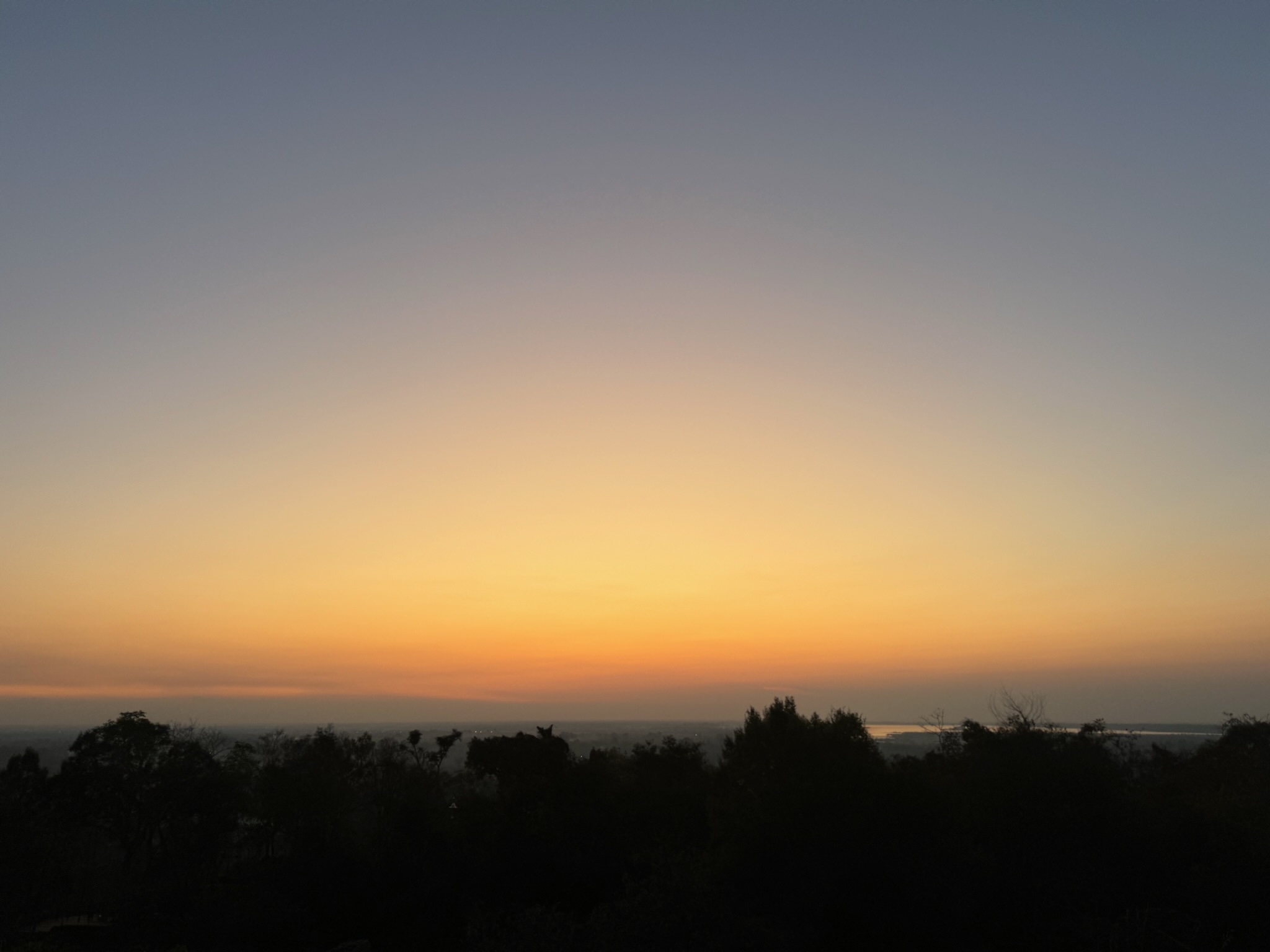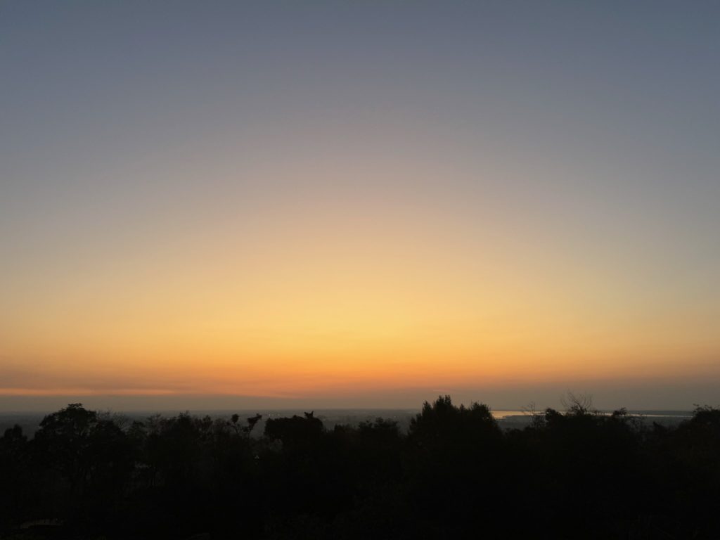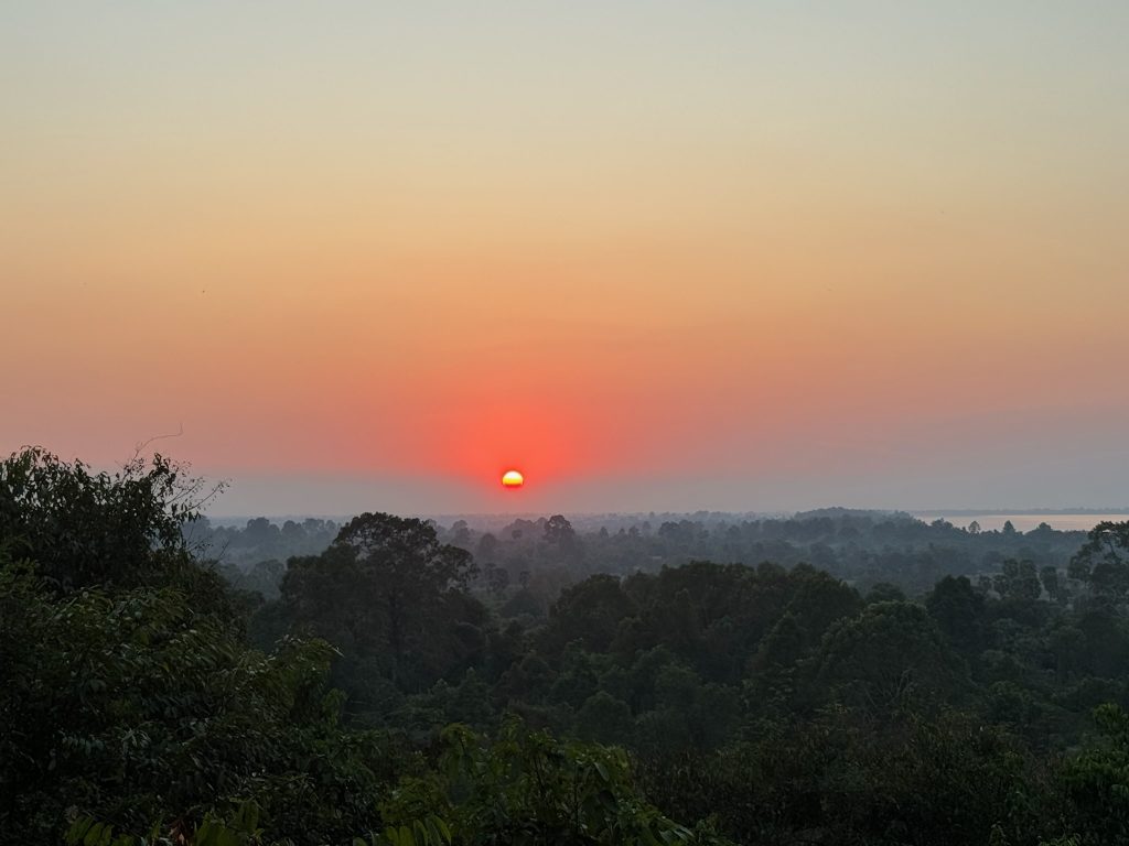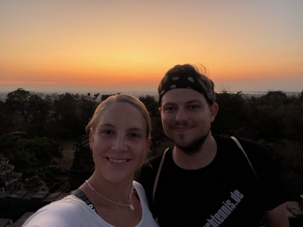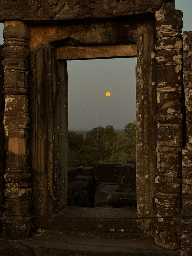 Um 12 Uhr ging es dann wieder in unser Café für ein richtiges Frühstück bzw. Mittagessen. Auf dem Weg zur Unterkunft brachte ich noch eine Postkarte für meine Oma zur Post. Im Zimmer haben wir im Kühlen gechillt und etwas geschlafen bis es um 17:30 Uhr wieder zur Tempelanlage ging, um vom Tempel Phnom Bakheng auf einem Berg den Sonnenuntergang zu schauen. An der Anzahl der Roller, Busse und Tuk Tuks merkten wir gleich, das war längst kein Geheimtipp mehr. wir mussten noch einen langen Weg den Berg hoch laufen und kamen gerade noch rechtzeitig bei einer Aussichtsplattform an, von der aus wir den Sonnenuntergang mit einigen anderen beobachteten. Danach wird das Licht ja immer erst schön und wir liefen den Weg weiter hoch bis zum Tempel. Uns kamen hunderte Leute entgegen – wie haben die alle auf den Tempel gepasst?! Auch die Treppen auf den Tempel hoch mussten wir uns im Gegenstrom hoch quetschen. Die Aussicht konnten wir nicht lange genießen, da der Tempel bald schloss und wir von den Wärtern wieder runter geschickt wurden. Immerhin konnten wir noch kurz den großen Mond und beim Abstieg den roten Himmel bewundern.