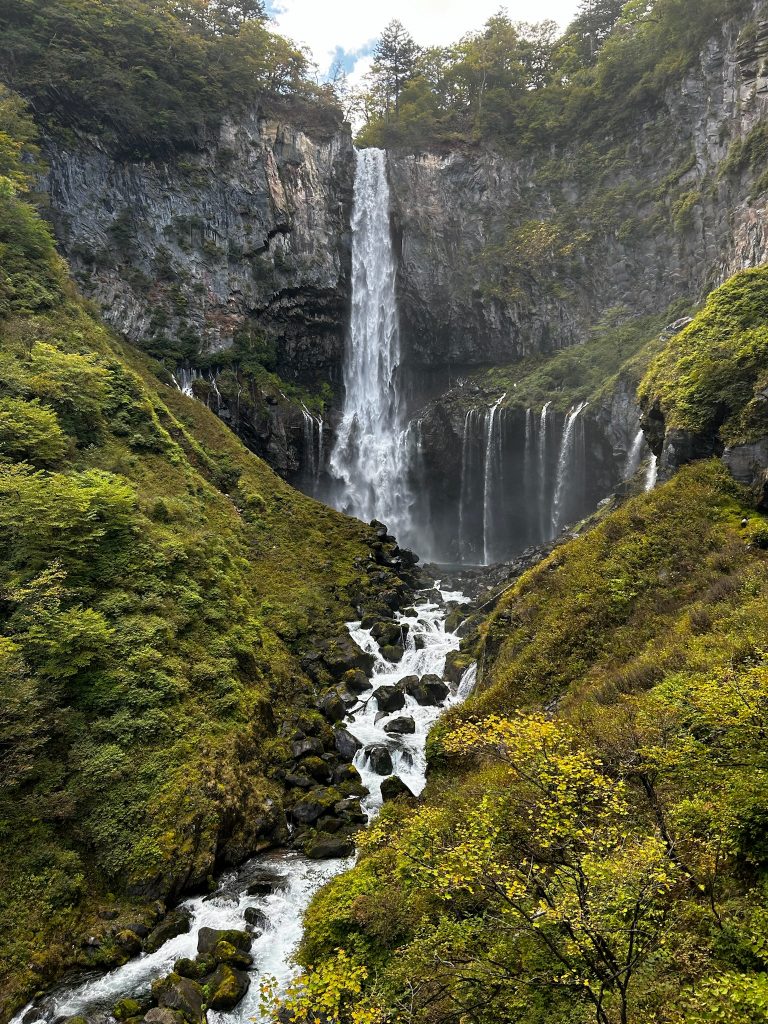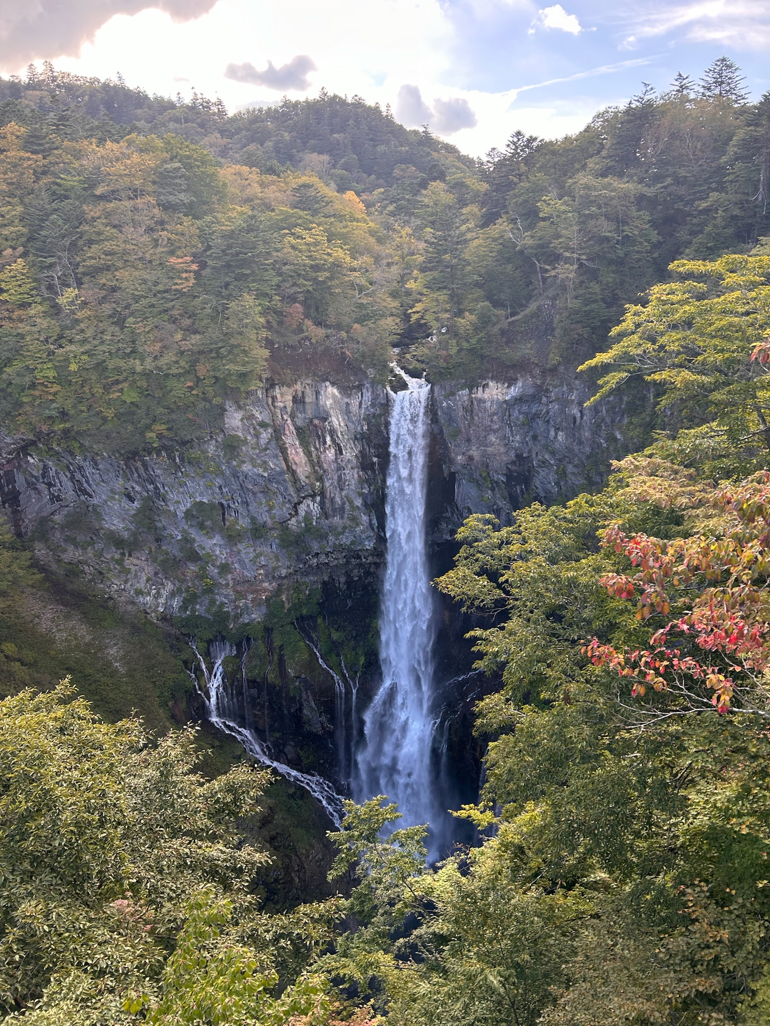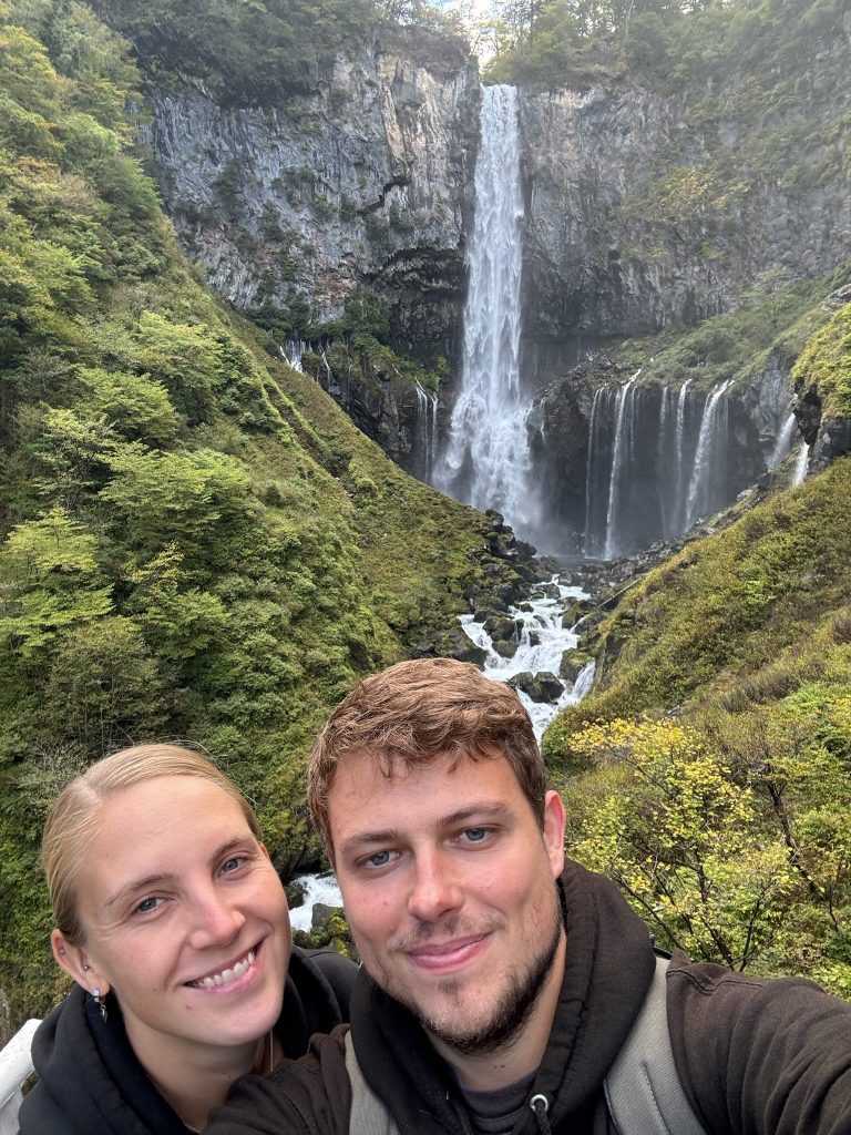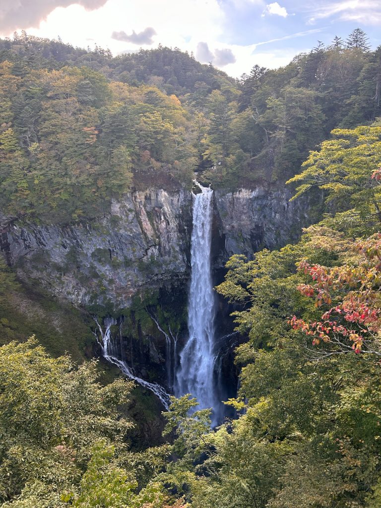 Hier in den Bergen war es recht kühl. Um 13 Uhr stiegen wir in den Bus zum Kegon Wasserfall am Chuzenji-ko See. Die Fahrt dauerte eine Stunde und führte am Ende in Kurven über einen Berg. Zum Glück hatten wir einen Sitzplatz, denn der Bus war proppevoll. Auf dem Platz vor dem Eingang zum Wasserfall waren ein paar Essensstände, wo wir uns einen kleinen Snack holten. Danach kauften wir Eintrittstickets (3,70€) und fuhren mit einem Aufzug 100 m runter zum Fuß des Wasserfalls. Hier konnte man von einem Aussichtsturm auf den beeindruckenden Wasserfall schauen.