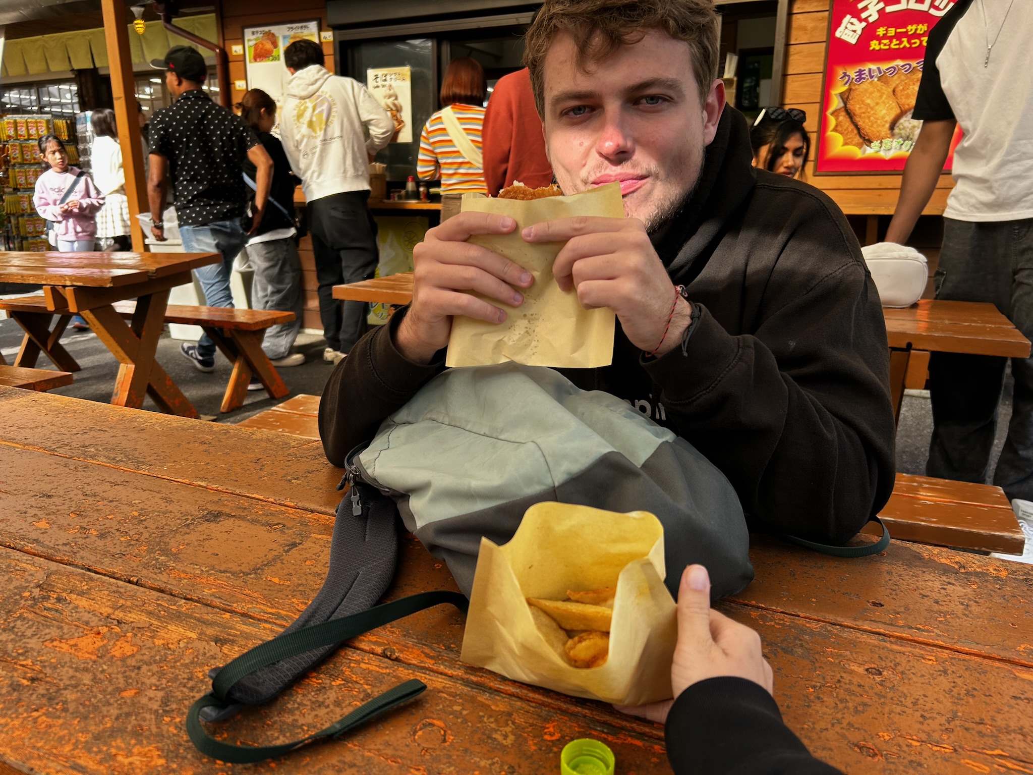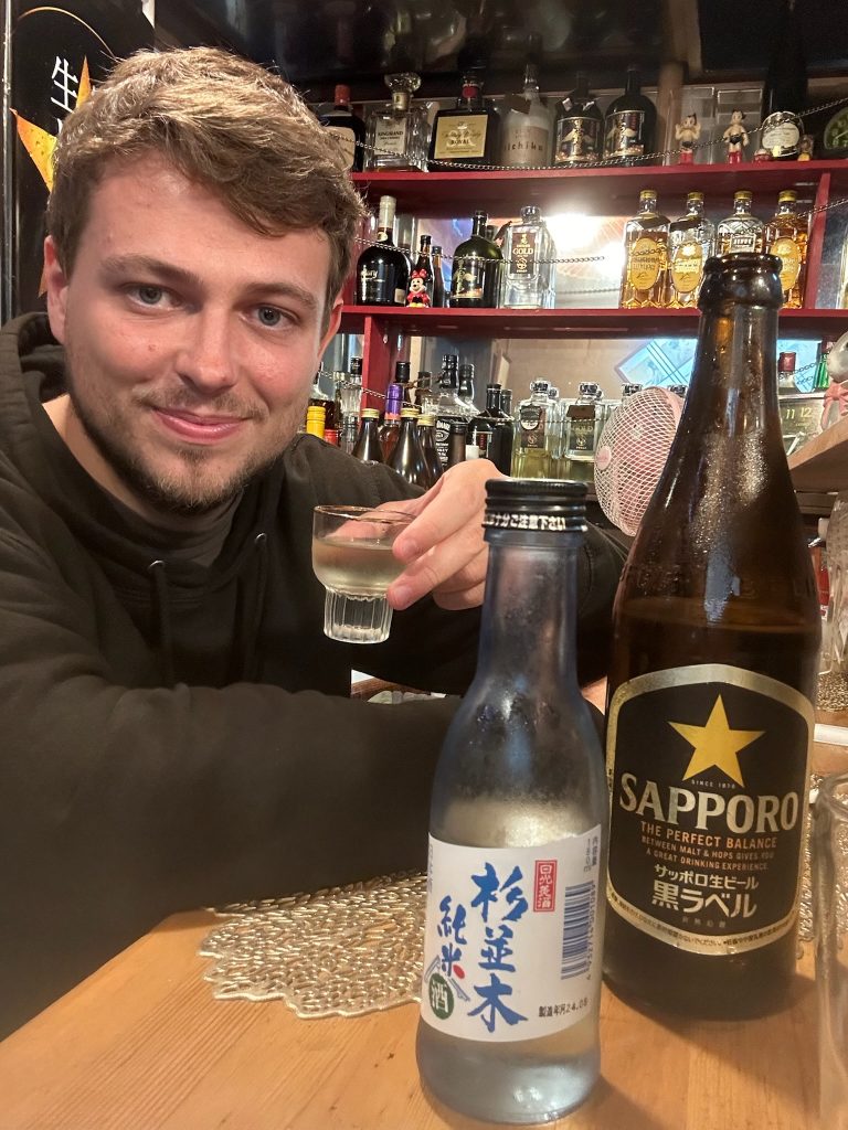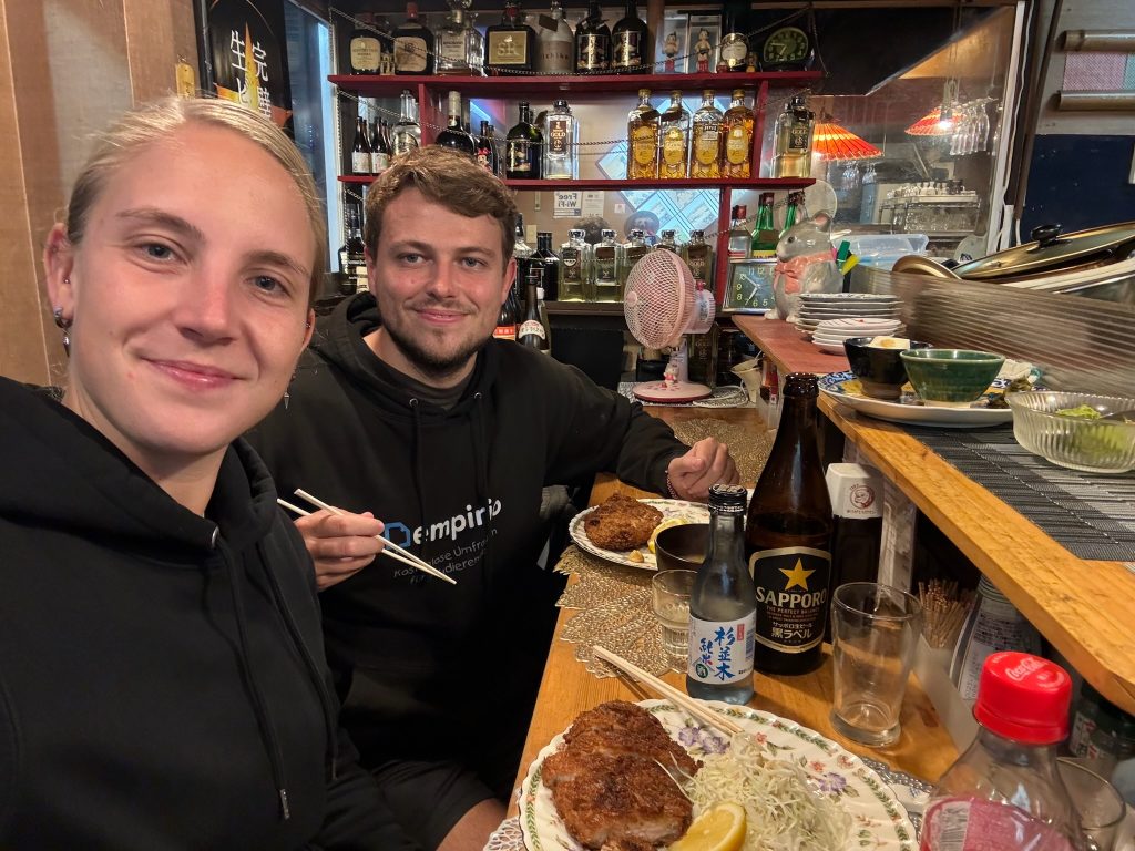 Von der Tempel-Area liefen wir 20-30 Minuten an der Hauptstraße entlang bis zum Bahnhof. Dabei hielten wir Ausschau nach einem Restaurant für‘s Abendessen, aber viele hatten einfach schon zu und es war nicht mal 18 Uhr?! Nachdem wir ein paar Lokale abgeklappert hatten, entschieden wir uns, einen Bahnhof weiter zu fahren, von dem der Express-Zug abfährt. Dort fanden wir vor dem Bahnhof ein kleines, leeres Lokal und setzten uns an die Theke. Der Koch bereitete vor uns das Essen zu, eine Omi bediente uns und drehte uns Sake (Reiswein) an, den wir aber eh noch probieren wollten. Nach einer Stunde verließen wir ziemlich satt das Lokal und gingen zum Bahnhof, wo unser Zug um 19:54 Uhr nach Tokio fuhr. Wir mussten noch einmal in die Metro umsteigen und waren um 22:30 Uhr im Hotel.