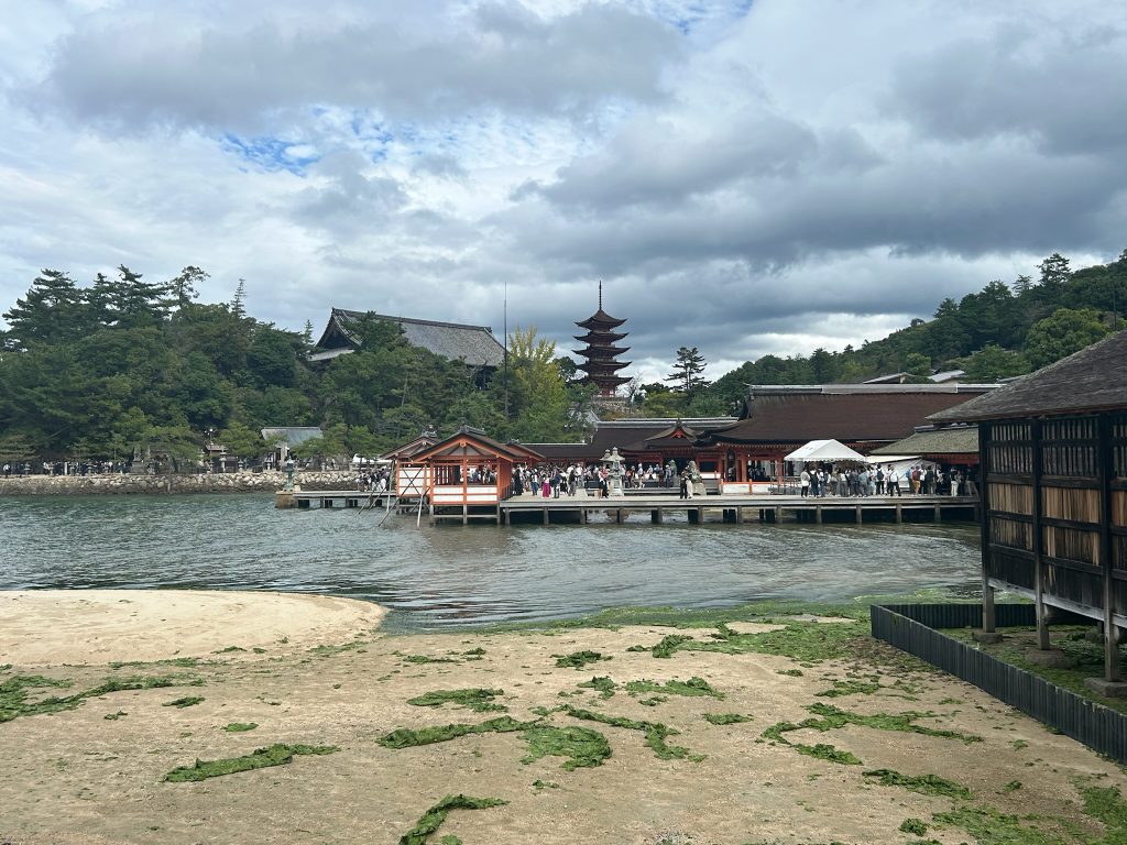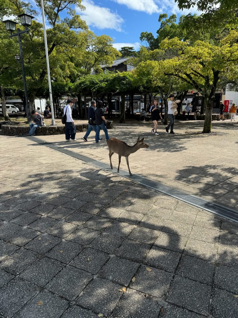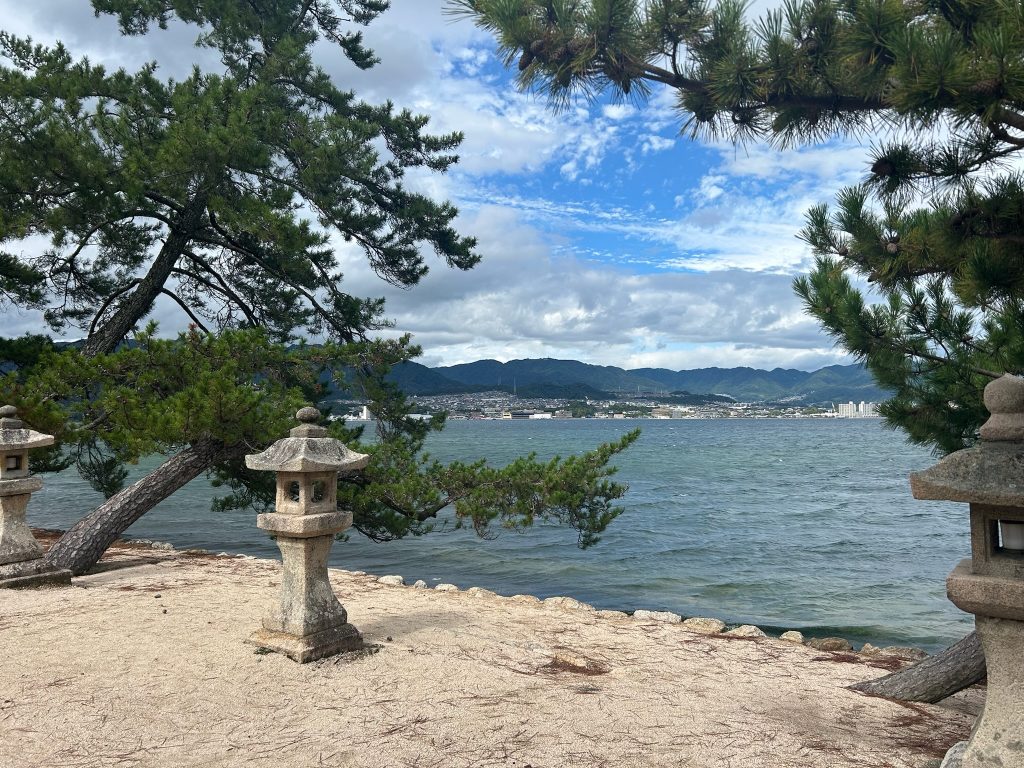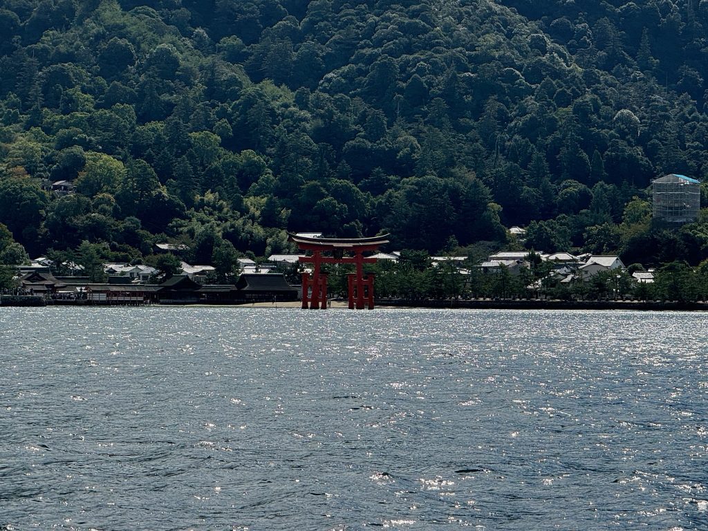 Für heute hatten wir einen Tagesausflug zur Insel Miyajima geplant, zum Glück regnete es heute nicht mehr. Wir frühstückten wieder im Komeda Coffee und fuhren dann mit Straßenbahn und Zug zum Fähranleger. Sogar die Fähre konnten wir mit der Suica-Karte bezahlen, mussten uns vorher aber noch ein Basisticket dazu am Automaten kaufen. Die Überfahrt zur Insel dauerte nur 15 Minuten (1,20€), insgesamt waren wir eine Stunde unterwegs. Wir liefen an der Promenade entlang bis zum bekannten Itsukushima Schrein, der vor der Insel im Wasser steht. Es laufen hier sogar zahme Rehe (Sikahirsche) herum. Wir liefen noch ein Stück weiter am Wasser entlang und machten uns dann auf den Weg zur Seilbahnstation.