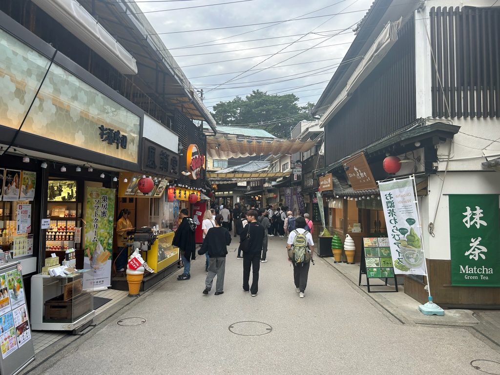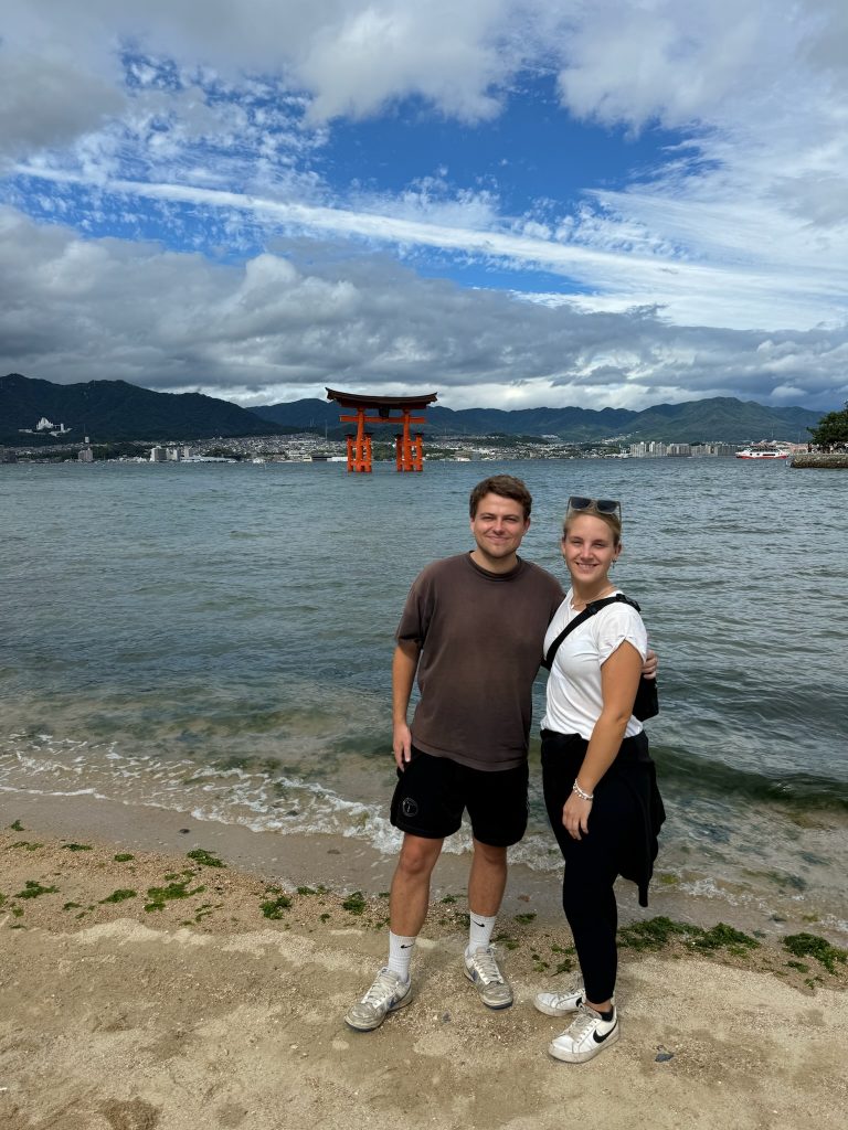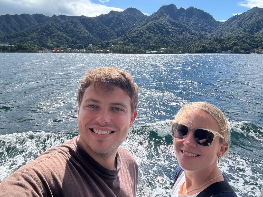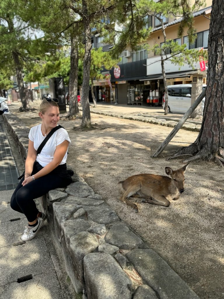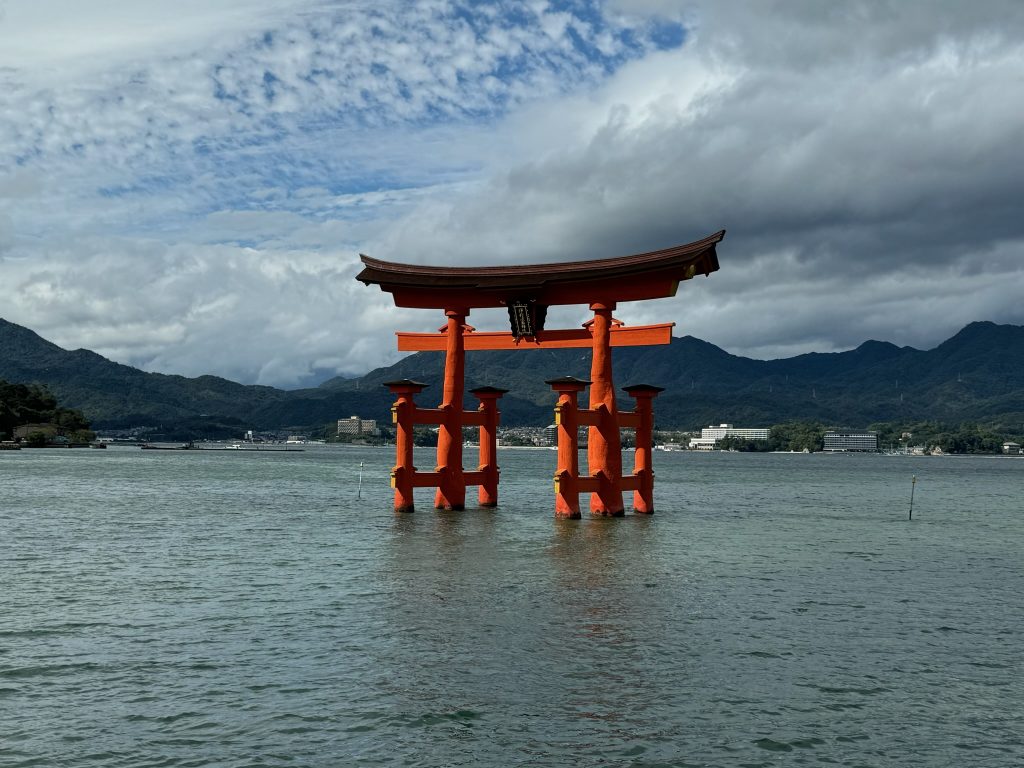 Für heute hatten wir einen Tagesausflug zur Insel Miyajima geplant, zum Glück regnete es heute nicht mehr. Wir frühstückten wieder im Komeda Coffee und fuhren dann mit Straßenbahn und Zug zum Fähranleger. Sogar die Fähre konnten wir mit der Suica-Karte bezahlen, mussten uns vorher aber noch ein Basisticket dazu am Automaten kaufen. Die Überfahrt zur Insel dauerte nur 15 Minuten (1,20€), insgesamt waren wir eine Stunde unterwegs. Wir liefen an der Promenade entlang bis zum bekannten Itsukushima Schrein, der vor der Insel im Wasser steht. Es laufen hier sogar zahme Rehe (Sikahirsche) herum. Wir liefen noch ein Stück weiter am Wasser entlang und machten uns dann auf den Weg zur Seilbahnstation.
