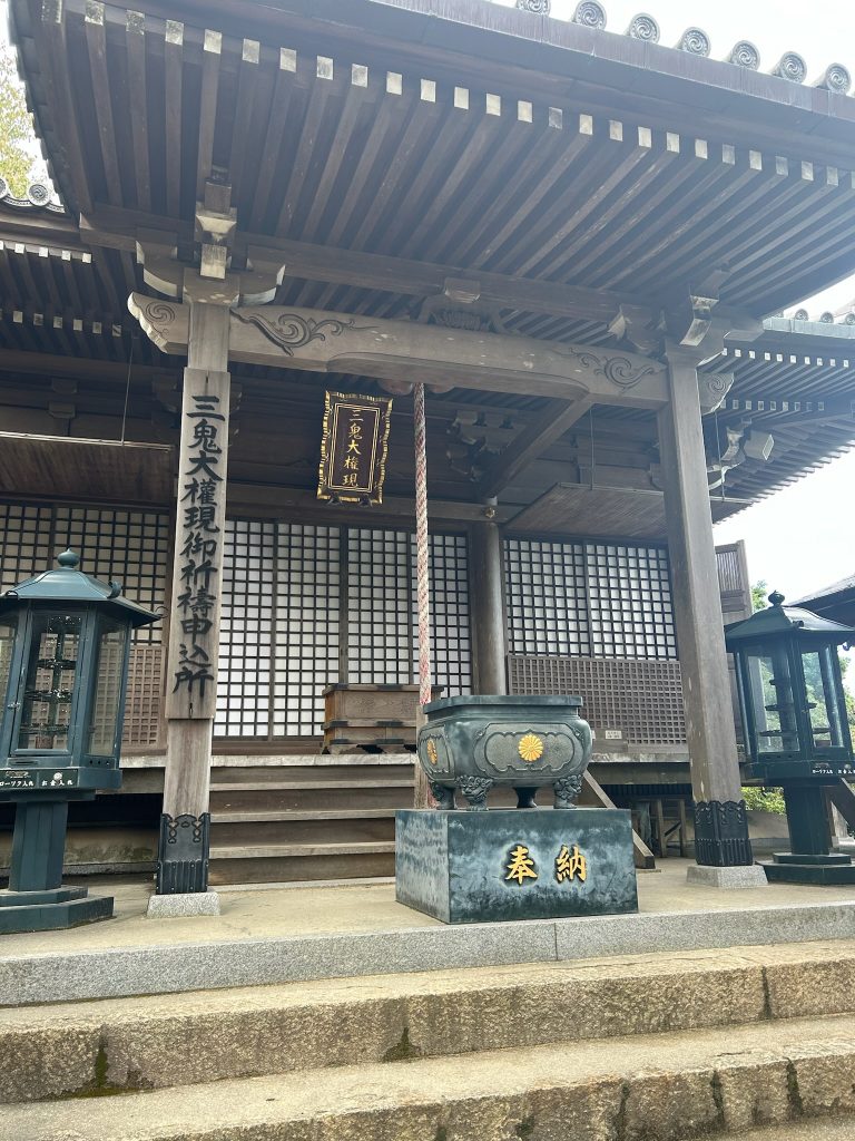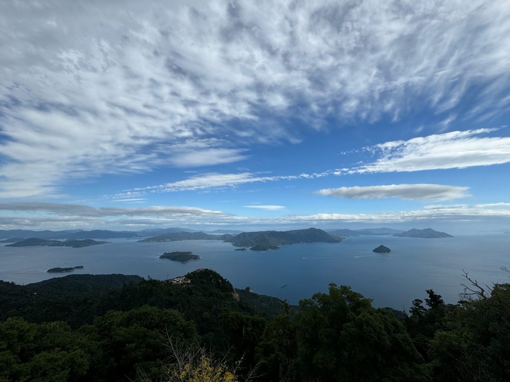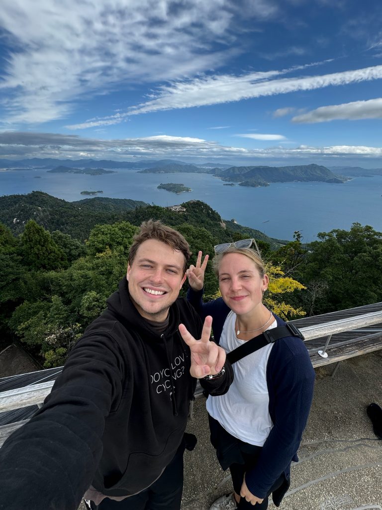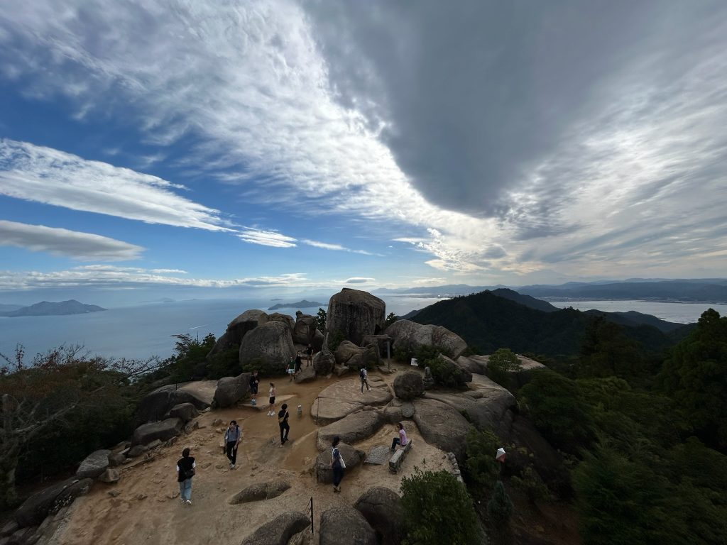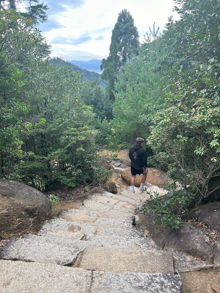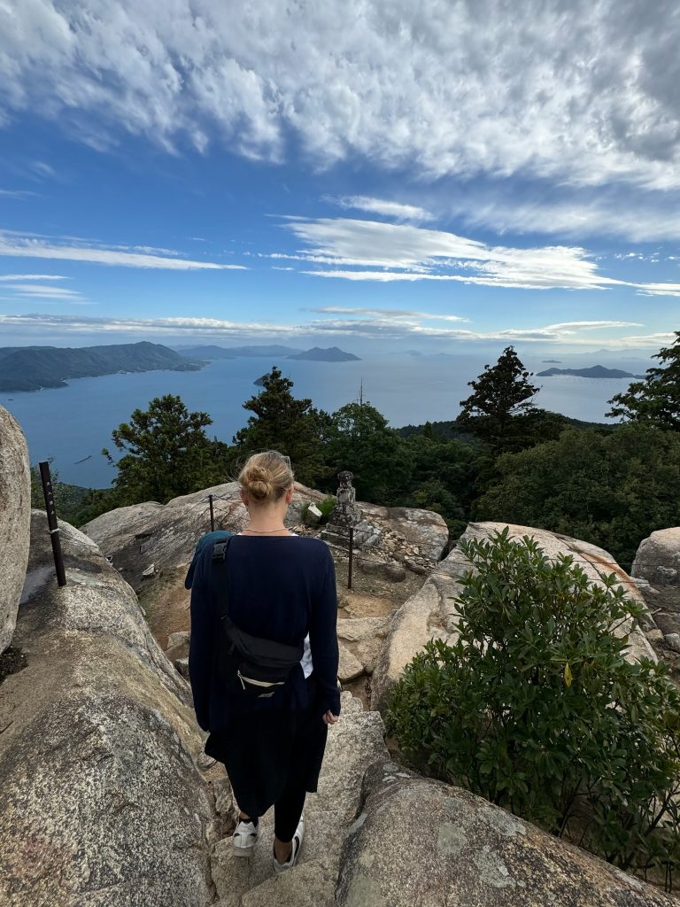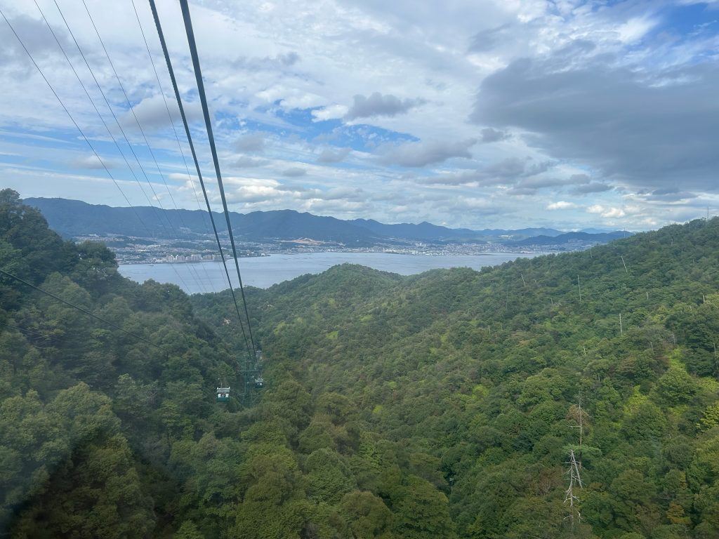 Wir liefen ca. 20 Minuten durch den Wald einen Berg hinauf zur Seilbahnstation, wo wir die Tickets kauften (5€ Roundtrip). Die Fahrt mit der alten Gondel dauerte nur 15 Minuten, man musste allerdings zwischendurch einmal umsteigen. Von der oberen Seilbahnstation stiegen wir in 30 Minuten auf die Spitze des Mount Misen und genossen auf 535 m Höhe eine Rundum-Aussicht. An der Strecke stand auch ein großer und ein paar kleinere Tempel.