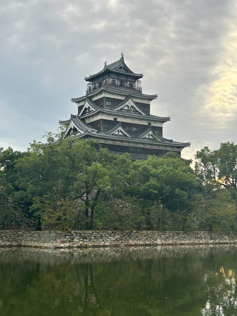 Gegen 14 Uhr machten wir uns vom Aussichtspunkt auf den Rückweg bergab und fuhren mit der Seilbahn zurück. In dem Ort liefen wir durch die Shoppingstraße, wo wir in einem Café eine Pause machten, zurück zum Fähranleger. Wir erwischten die 16 Uhr-Fähre zurück zum Festland und direkt einen Zug zurück in die Stadt. Wir wollten noch zur Hiroshima Castle, zu der wir ein Stück von der Bahnstation laufen mussten. Wir konnten sie wegen der späten Uhrzeit zwar nicht mehr besichtigen, aber sie immerhin im Vorbeilaufen sehen, da sie auf einem Hügel, umgeben von einem Wassergraben steht. Wir liefen 15 Minuten weiter in das belebte Viertel, wo wir uns ein Restaurant zum Abendessen suchten. Danach liefen wir weitere 15 Minuten zurück ins Hotel.