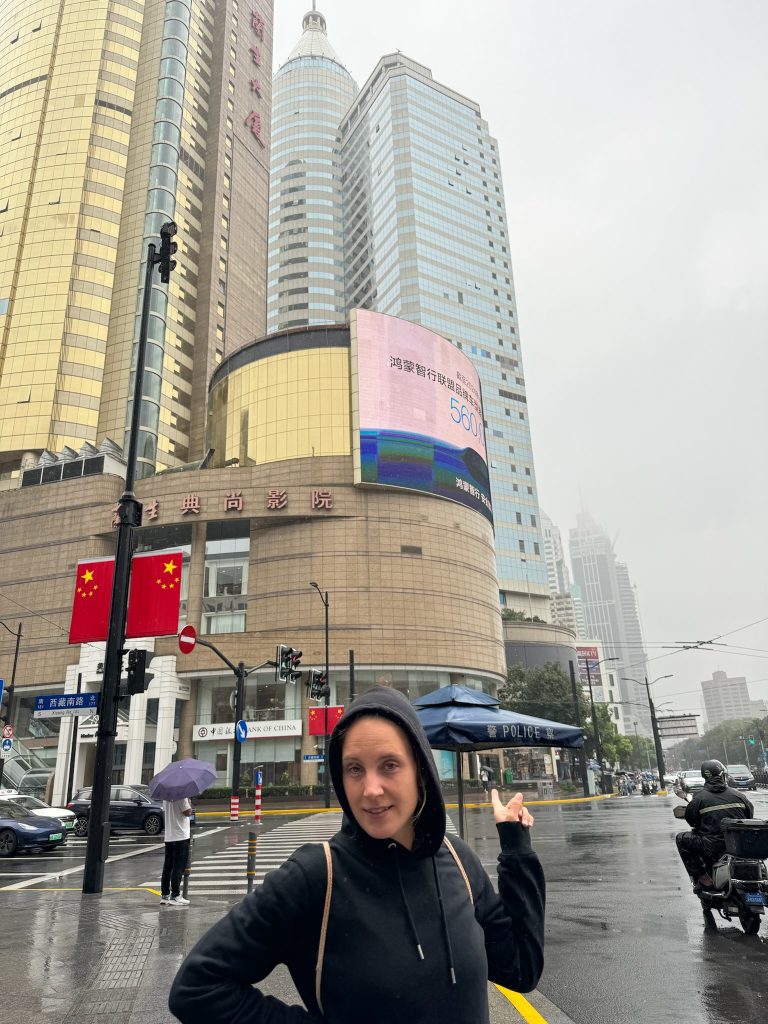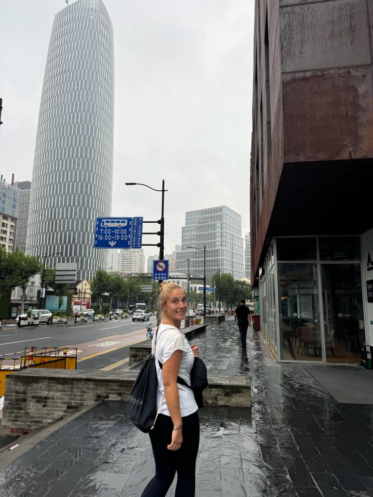 Um 13 Uhr gingen wir los. Es regnete den ganzen Tag und war dadurch erst kühl, später schwül. Generell war es hier in China angenehmer von den Temperaturen her mit maximal 21 bis 25 Grad. Wir waren relativ im Zentrum, aber hier ist nicht so viel Verkehr wie man vermuten würde. Sogar Fahrradfahrer können auf den Straßen fahren. Es sind nur wenige Roller unterwegs, fast nur E-Roller, vor denen man sich in Acht nehmen muss, weil sie auch gerne über den Bürgersteig fahren und die man nicht von Hinten kommen hört. An einer Bank holten wir Bargeld (300€). Gefühlt sind hier nur Wohn- und Bürogebäude und Shoppingmalls. Wir gingen in eine Mall und suchten uns erst mal was zu Essen. Da der Regen stärker wurde, setzten wir uns danach noch in ein Café. Wir liefen in die nächste Mall auf der Suche nach einem Supermarkt, um uns Zahnbürsten und Zahnpasta zu kaufen (die in meinem Rucksack waren). Nachdem wir fündig geworden waren, holten wir uns noch Wasser und gingen gegen 17 Uhr zurück zum Hotel. Marco nutze noch das Fitnessstudio, holte sich abends noch was zu Essen und hatte noch seinen Mittwochs-Call. Ich war bedient und fertig von der letzten Nacht und ging früh schlafen.