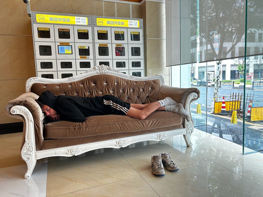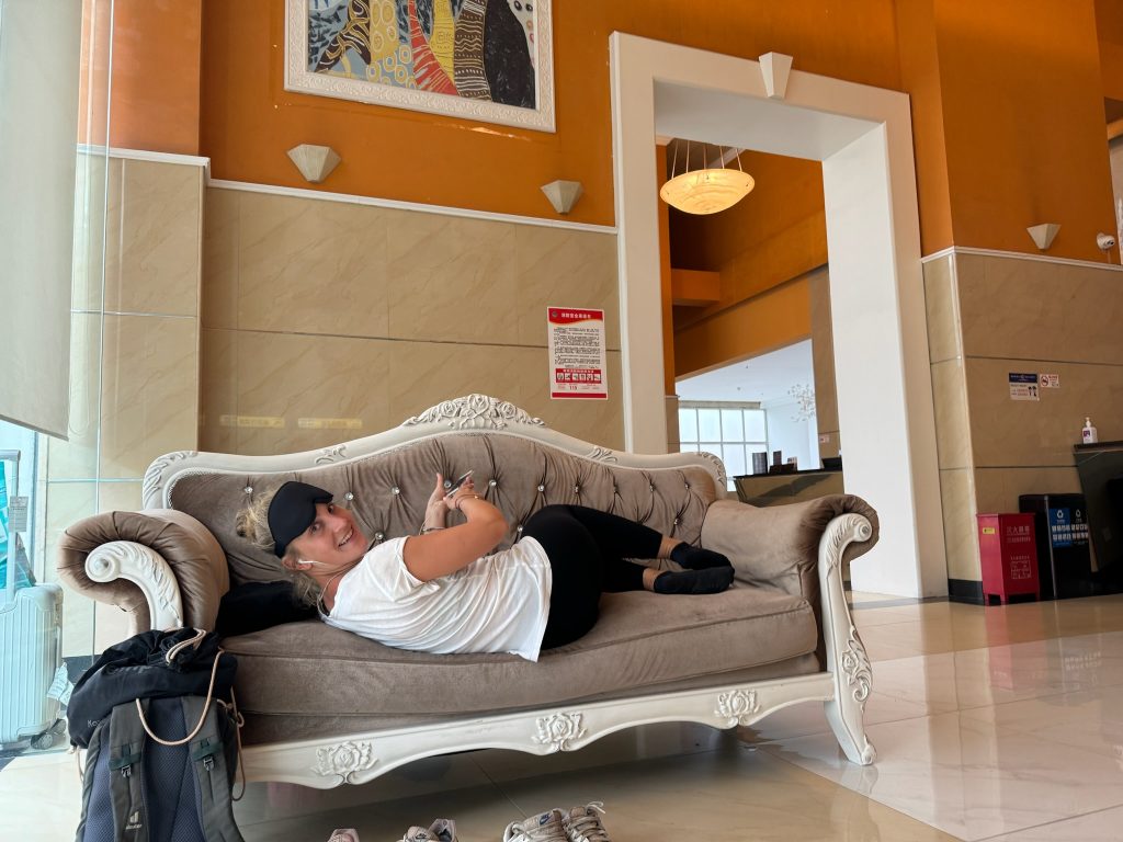 Von der Metro-Haltestelle bis zum Hotel sollte es nur 10 Minuten zu Fuß dauern aber wir haben uns erst ein bisschen verlaufen, bis wir festgestellt haben, dass GoogleMaps hier nicht funktioniert. Gegen 7:30 Uhr kamen wir dann im Hotel an. Wir hatten vorher mit dem Hotel vereinbart, dass wir für einen Aufpreis früher in unser Zimmer kommen, aber hier erfuhren wir, dass es doch nicht möglich ist. Na toll – nach der harten Nacht hatten wir uns auf das Bett gefreut. Tja Pech gehabt, also machten wir uns in der Lobby auf zwei gemütlichen Sofas breit und versuchten hier zu schlafen. Ich konnte wenigstens zwei Stunden etwas Schlaf nachholen, Marco konnte mit einer Pippipause natürlich wieder durchziehen und durchschlafen :D. Um 12:30 Uhr konnten wir für zwei Nächte einchecken. Wir mussten eine Kaution zahlen, aber da keine unserer drei Kreditkarten ging und wir noch kein Bargeld hatten, kam mal unser 20$-Schein zum Einsatz, zu dem wir am Ende unserer ersten Reise unser letztes malayisches Bargeld getauscht hatten. Wir ruhten uns kurz im Zimmer aus, hier konnten wir uns auch erst ins WLAN einloggen. Wir merkten, dass Google, Social Media und co. nicht im Wlan funktionieren, aber immerhin im mobilen Internet. Also luden wir uns die entsprechenden chinesischen Apps fürs online Bezahlen (Alipay) und Navigieren herunter, zumindest Apple Karten funktioniert hier.