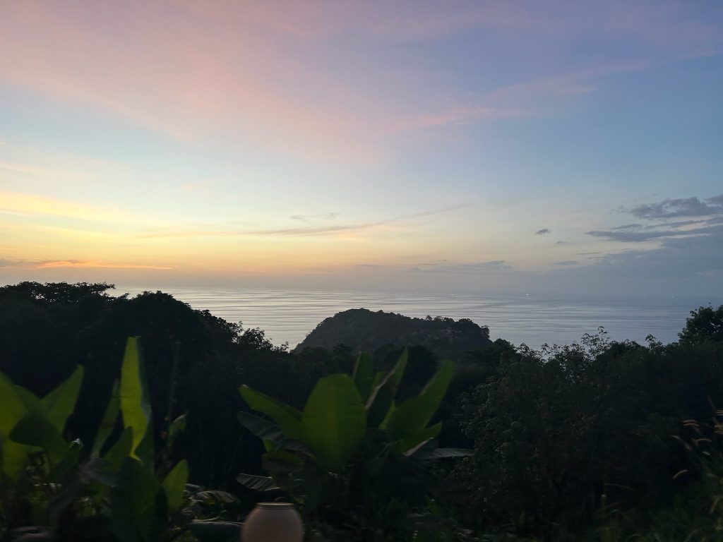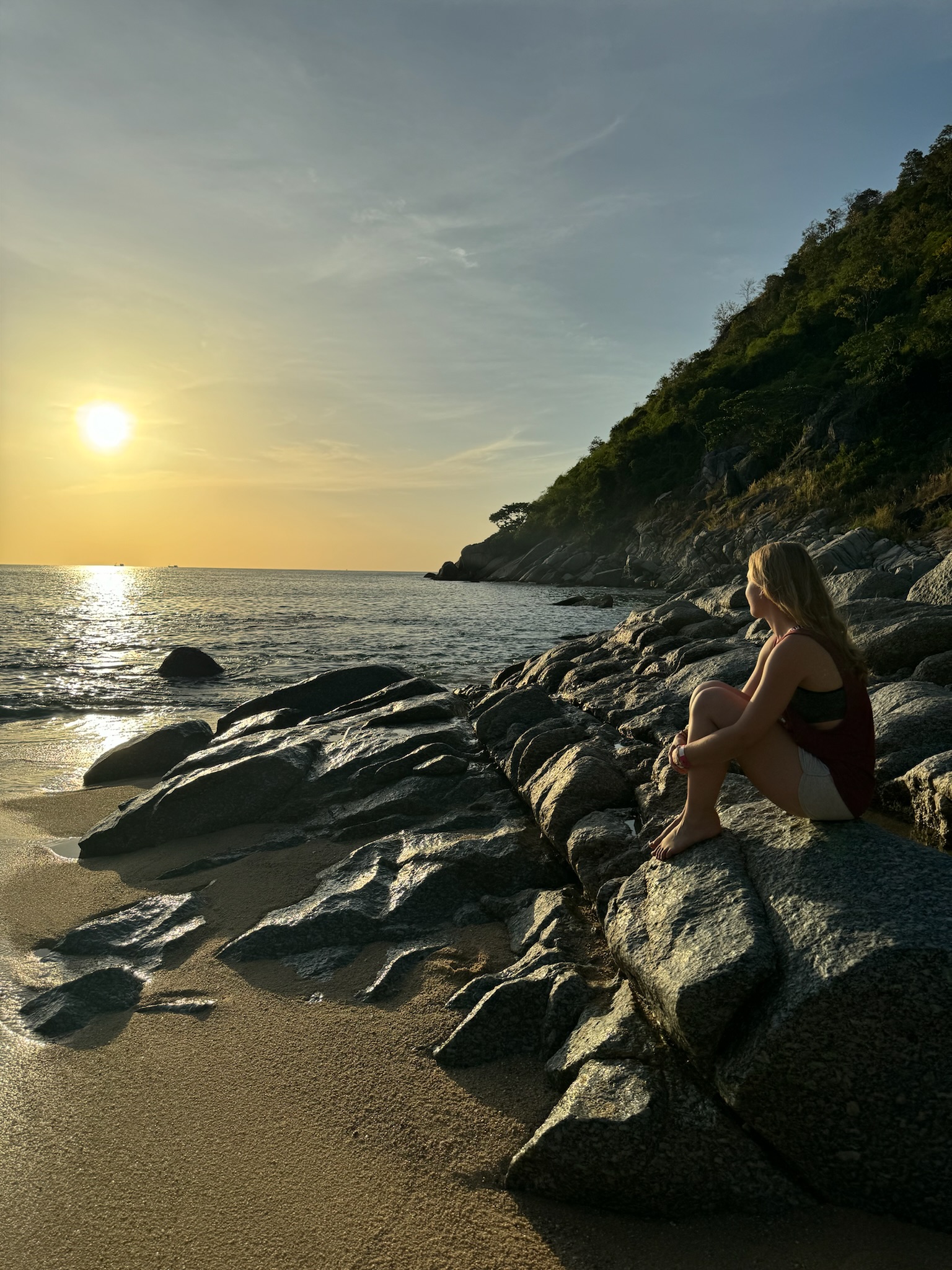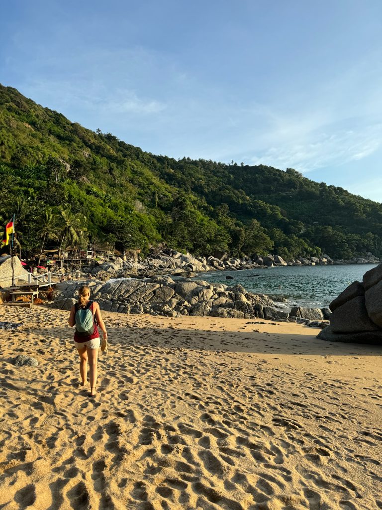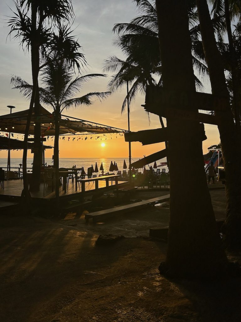Wir wollen noch einen weiteren Spot aufsuchen und entschieden uns, zum Nui Beach zu fahren. Als wir gemäß Google Maps von der Hauptstraße abbogen, wurde die asphaltierte Straße zu Sand mit vielen Schlaglöchern. Marco meisterte die Fahrt, aber als wir einen sehr steilen Abhang erreichten, trauten wir uns nicht mehr, weiter zu fahren. Wir ließen den Roller stehen und wollten die letzten 2,5 km zu Fuß den Berg zum Strand runtergehen, obwohl wir nicht mehr viel Zeit hatten, bis die Sonne unterging. Endlich unten angekommen – mit Flipflops ziemlich ungeil – mussten wir 100 Baht Eintritt zahlen und hatten nur noch 1,5 Stunden bis zum Sonnenuntergang. Schade, dass wir uns nicht schon früher dafür entschieden hatten, denn es hat sich echt gelohnt. Der Nui Beach ist eine super schöne, kleine, einsame Bucht zwischen Felsen, in der sie eine süße Anlage aus Bars und selbstgebauten Fotospots aufgebaut haben. Wir gönnten uns hier einen Fruchtshake, genossen die Aussicht, beobachteten Leute bei ihren Fotoshootings und warteten auf den Sonnenuntergang. Nebenbei mussten wir leider die Rückgabe des Rollers an diesem Tag und die Bezahlung unseres kleinen Schadens per WhatsApp mit der Vermietung regeln, was etwas genervt hat. Obwohl die Vermietung schon um 17 Uhr schließt, konnten wir netterweise einen Übergabetermin für 19 Uhr ausmachen. Dadurch hatten wir allerdings etwas Zeitdruck, wenn wir den Sonnenuntergang um 18:10 Uhr sehen wollten, den Berg wieder hoch mussten und noch eine Rückfahrt von ca. 30 Minuten hatten…Wir haben uns dann entschieden, den Fahrservice im Geländewagen für 200 Baht p.P. Zu nehmen, der fuhr zeitnah nach dem Sonnenuntergang los, sodass wir es noch rechtzeitig schaffen könnten. Somit konnten wir beim dritten Versuch zum Glück einen schönen Sonnenuntergang sehen.