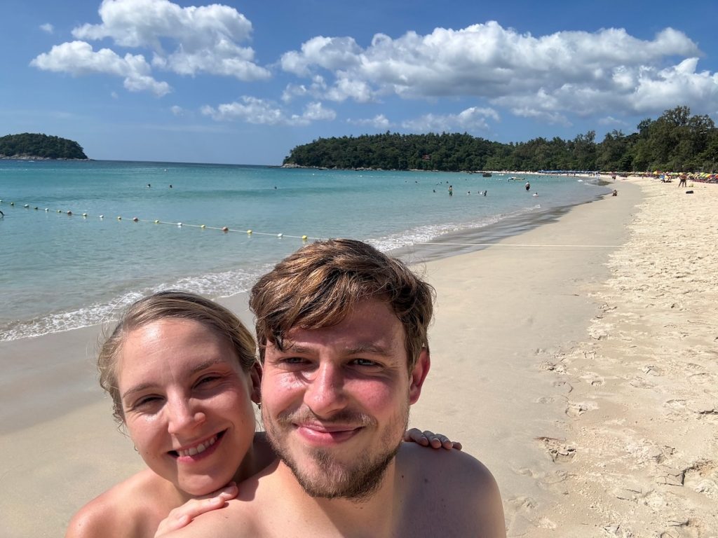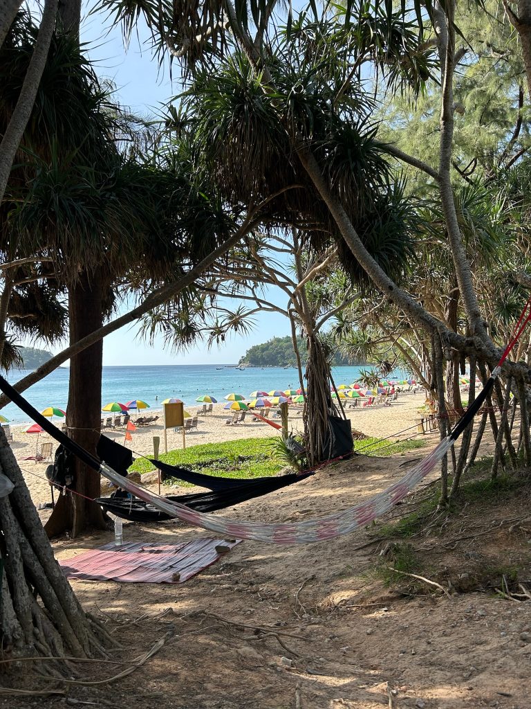 Von hier ging es weiter zum Kata Beach an der Westküste, hier haben wir uns ein nettes (und teures) Café zum Frühstücken in den Einkaufsstraßen rausgesucht. Danach haben wir uns an dem langen Strand mit ruhigem Wasser einen Schattenplatz etwas abgelegen von den dichten Liegen gesucht und hier ein paar Stündchen verweilt. Der Sand ist heiß und das Wasser herrlich angenehm aber wieder mit dem komischen Piksen.